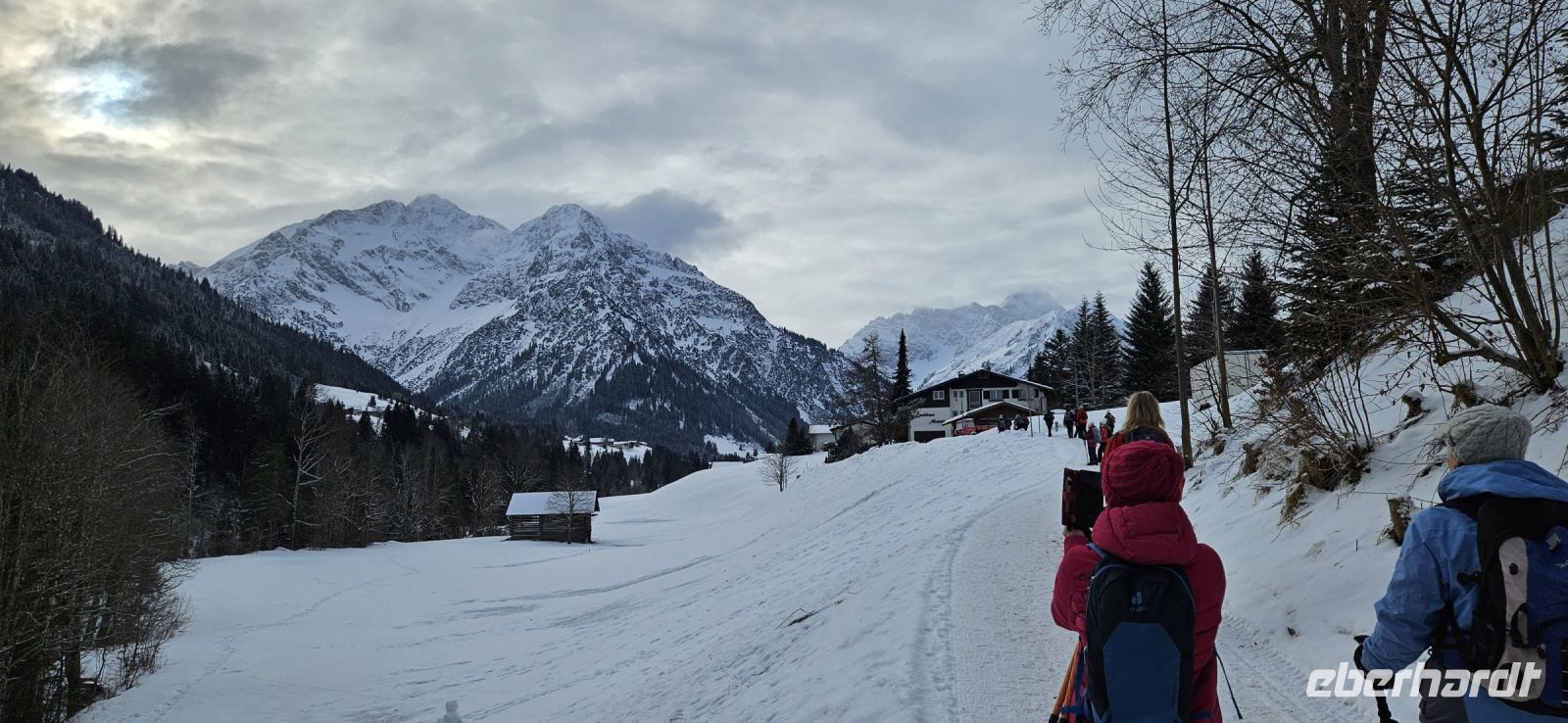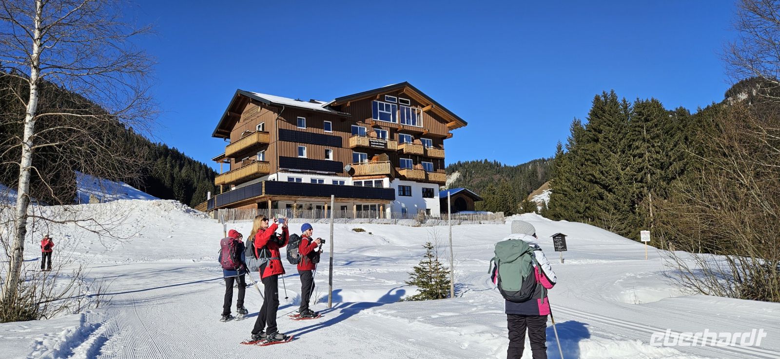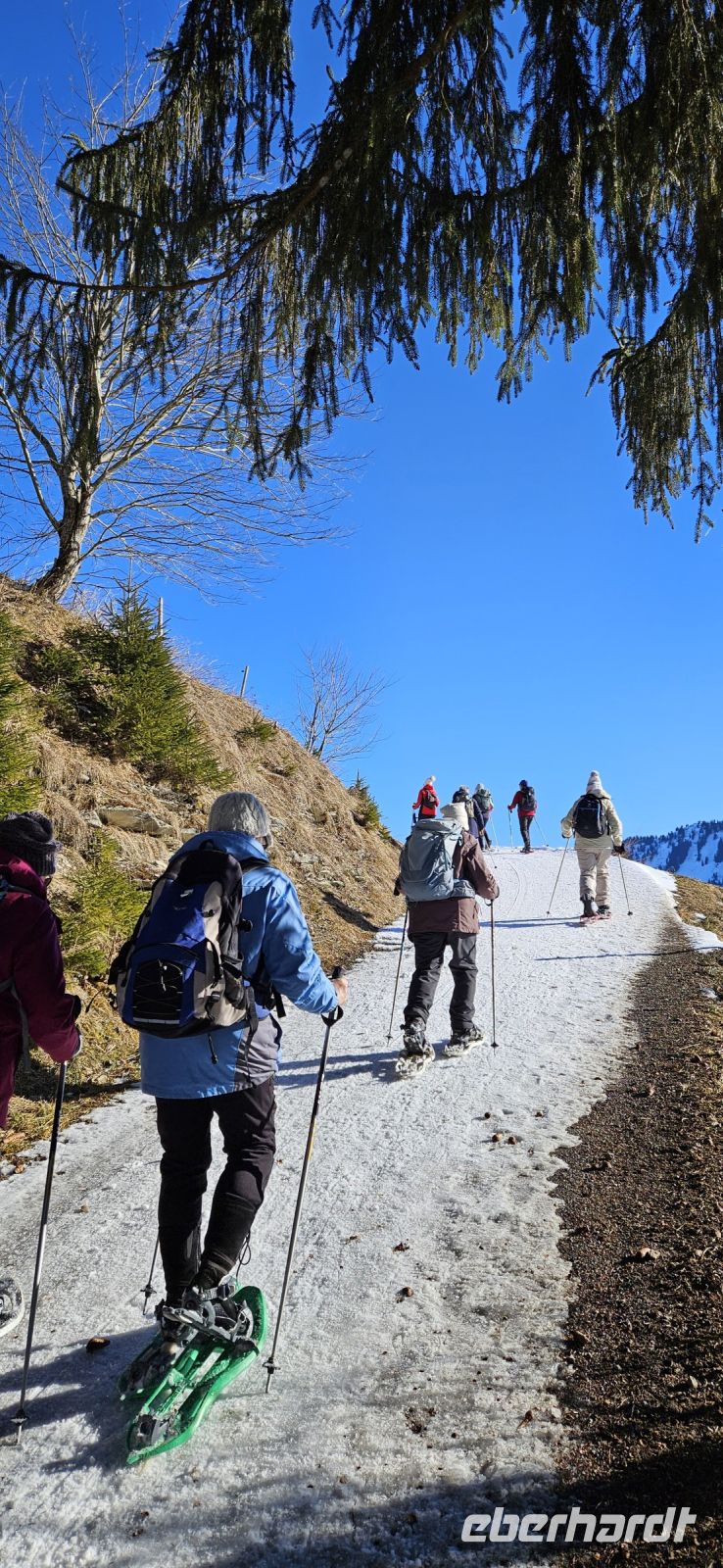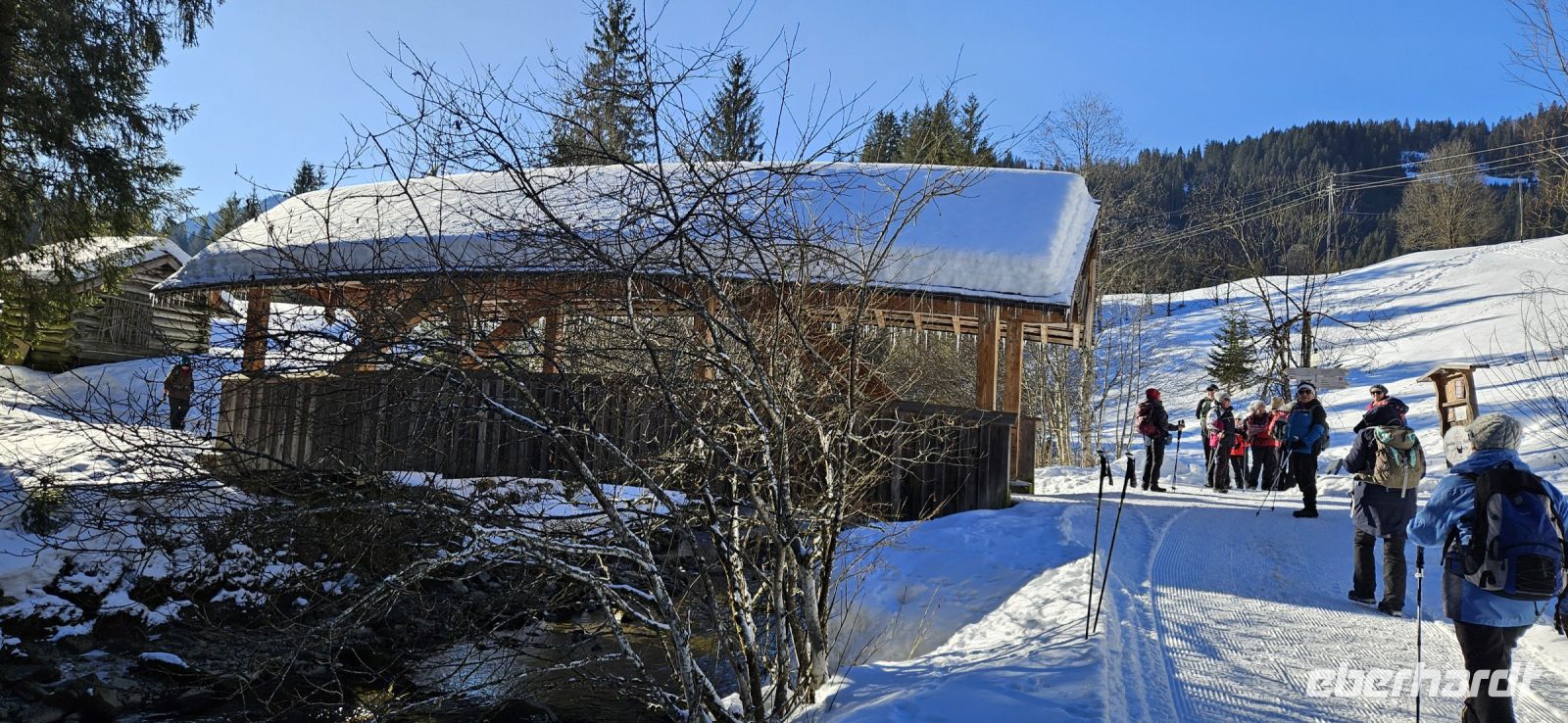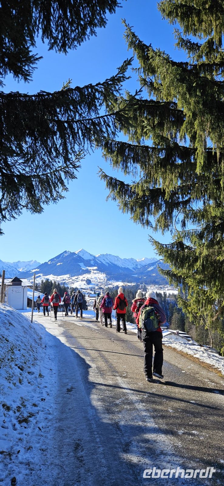 Start war wieder 10 Uhr und wir wanderten hinunter nach Riezlern bis zur Post und von dort bergan bis zum Bergstüble. Auch heute meinte das Wetter es wieder gut mit uns. DIE Sonne schien den ganzen Tag und die Sicht war fantastisch. Wir kamen gut voran, mal war der Weg recht steil, dann wieder gemütlich. Kurz nach 11 Uhr erreichten wir das Bergstübl und kehrten ein. Leider hatte die Rodelbahn nicht mehr eine durchgängig gute Schneedecke und so wanderten wir zu Fuss über die Rodelbahn hinunter nach Schwand. Wir fuhren 2 Stationen mit dem Bus Richtung Riezlern und wanderten dann durch den Wald steil bergab ins Tal der Breitach. Im November letzten Jahres wurde dort die alte neue Holzbrücke wieder in Betrieb genommen und so erreichten wir mühelos das andere Ufer, dort wo das Schwarzwasser in die Breitach mündet. Im Schwarzwassertal ging es dann auf einem wunderschönen Weg bergauf bis zur Mahdbrücke und dort wieder auf die andere Uferseite. Durch ein Moor- und Supfgebiet führte unser Weg bergauf und bergab und schließlich erreichten wir die Naturbücke. Das Wasser unter der Brücke hatte eine dicke Eisschicht und so wirkte die Brücke wenig spektakulär. Nach der Querung wanderten wir wieder bergan zur Panorama Hütte, aber die war völlig überfüllt. Schade, aber nicht zu ändern. So gingen wir gleich zurück ins Hotel . Nach einer kurzen Pause brachen wir wieder auf zum Kaffee trinken und zum Abholen unsere vorbestellten Schneeschuhe bei Sport Kessler.