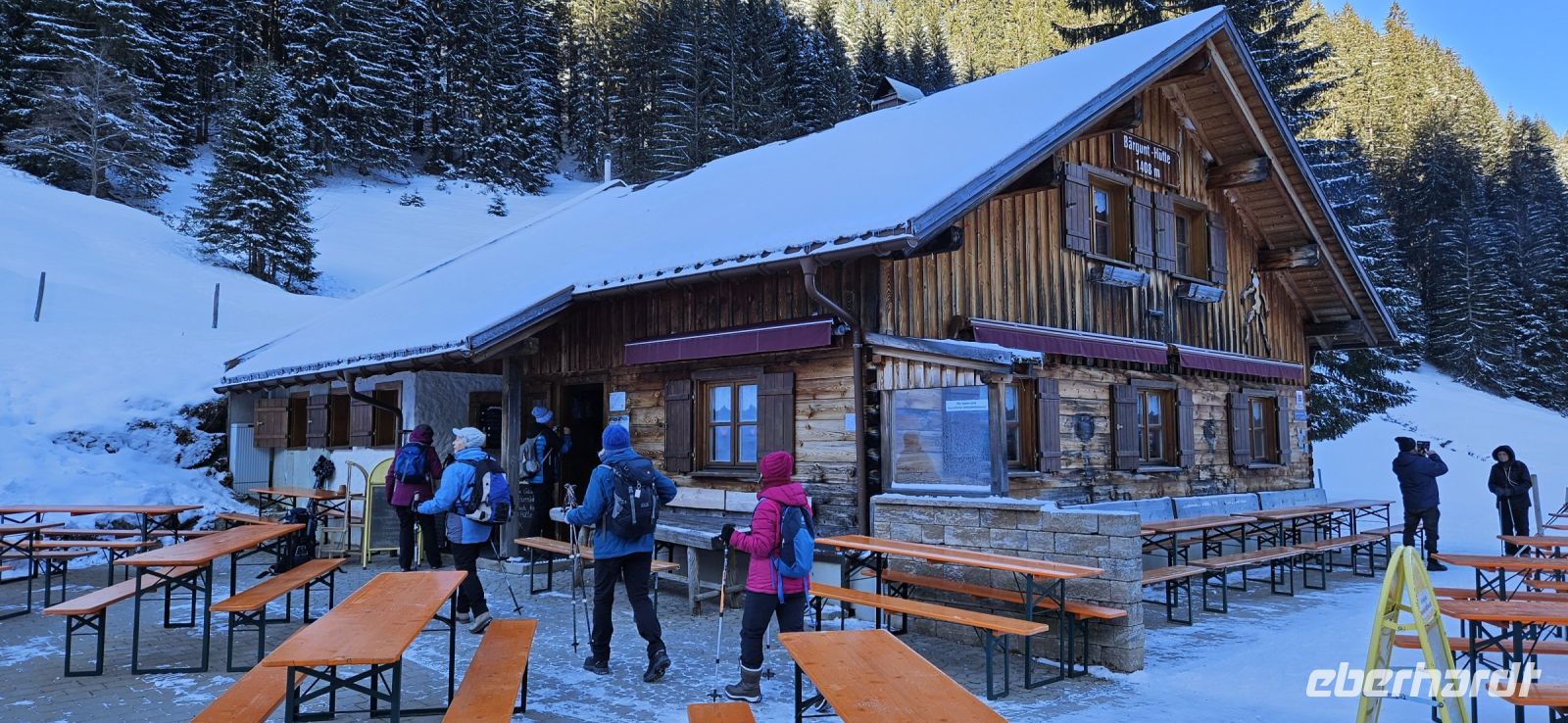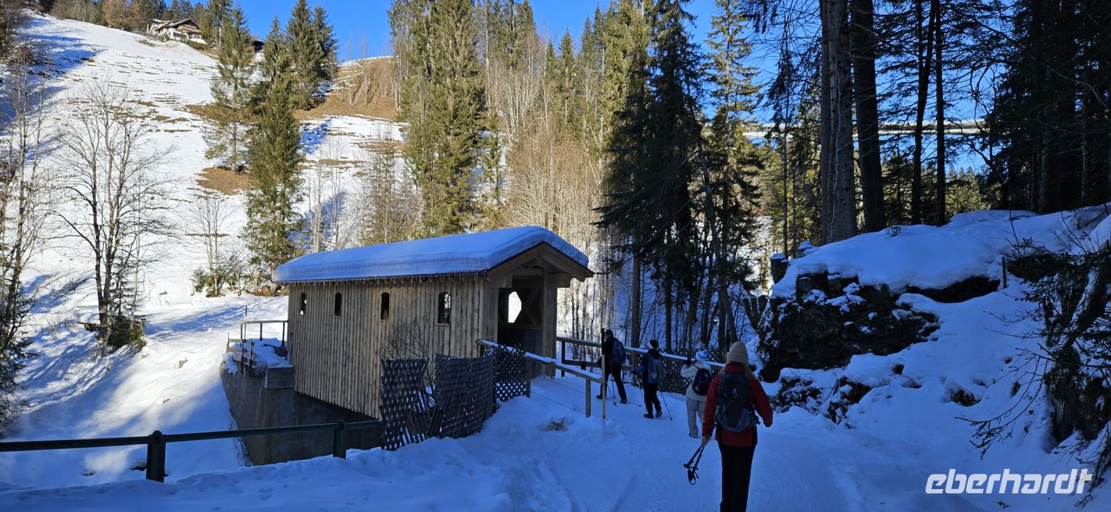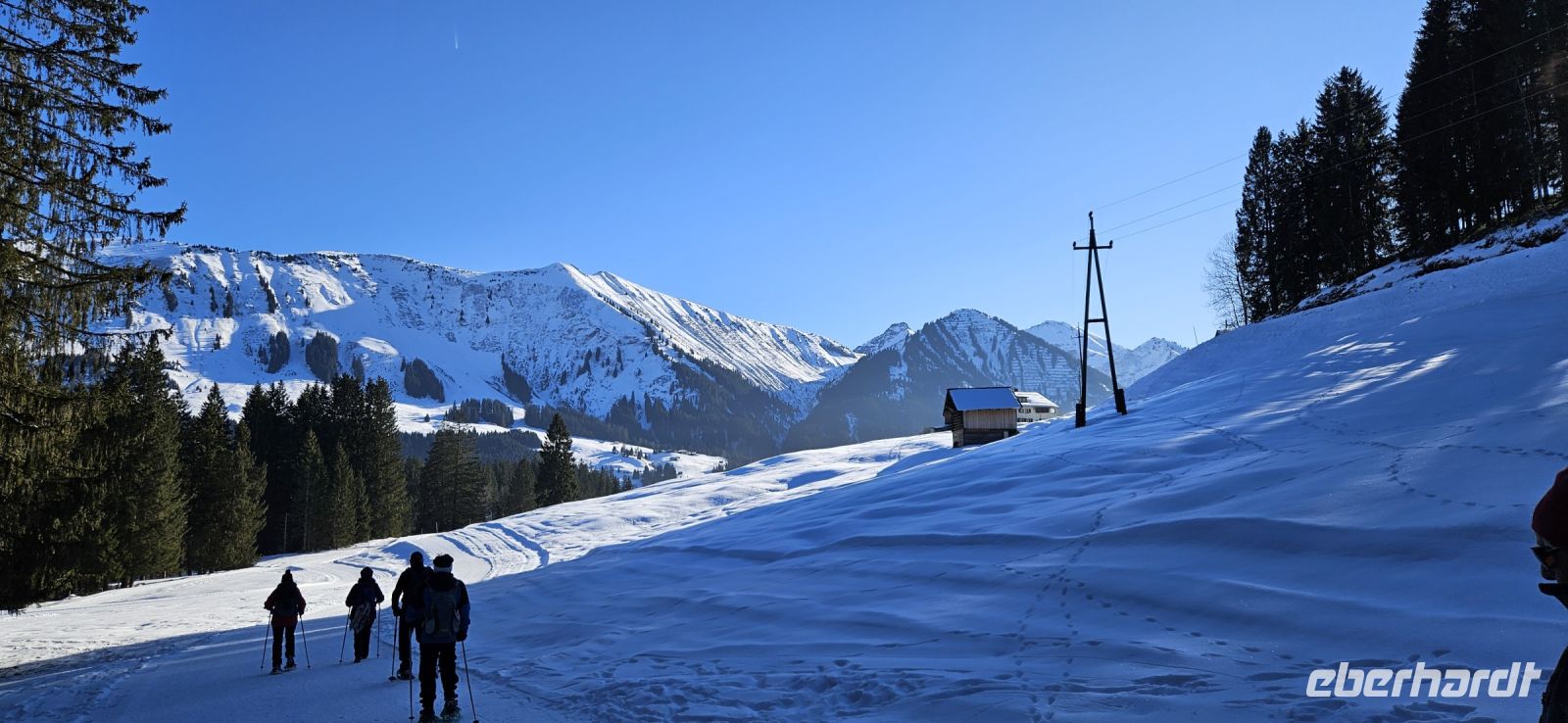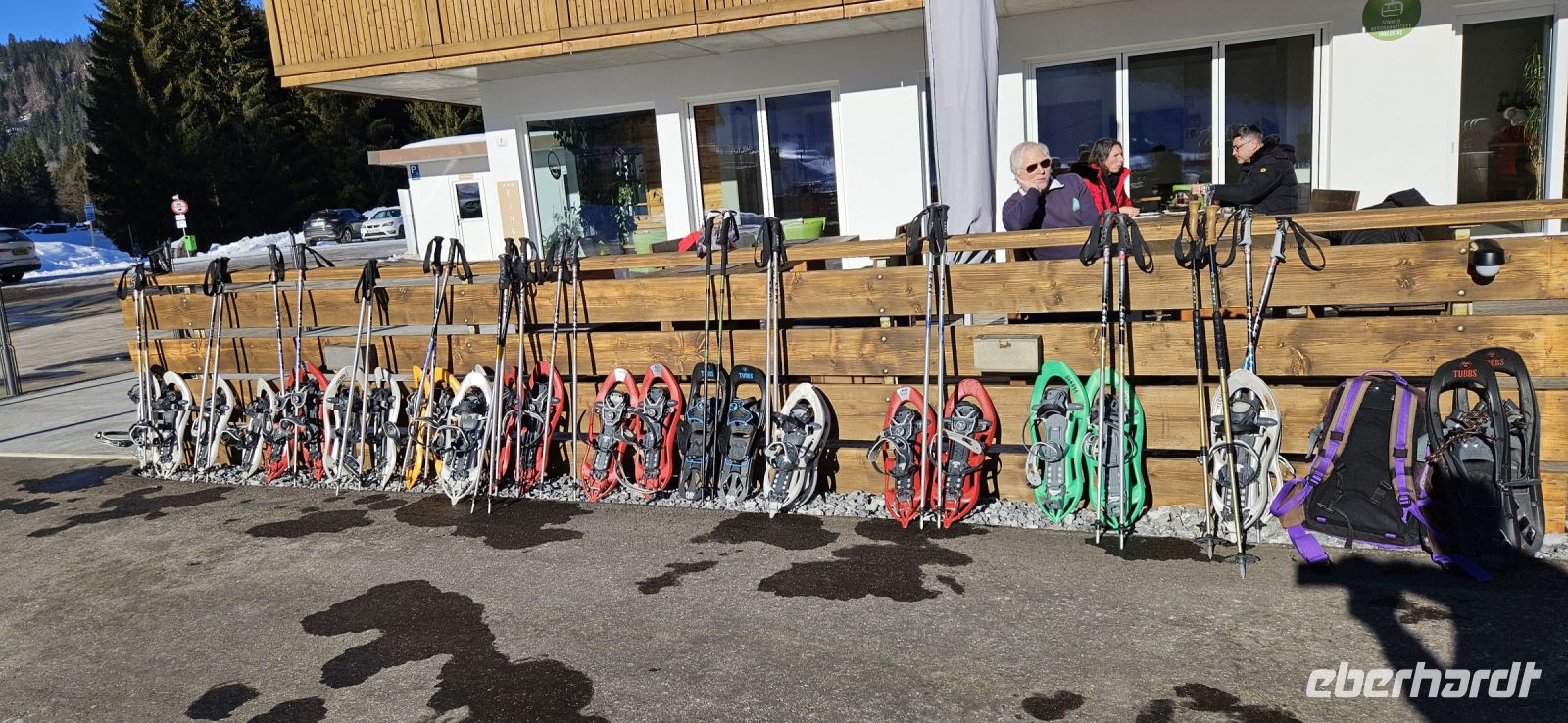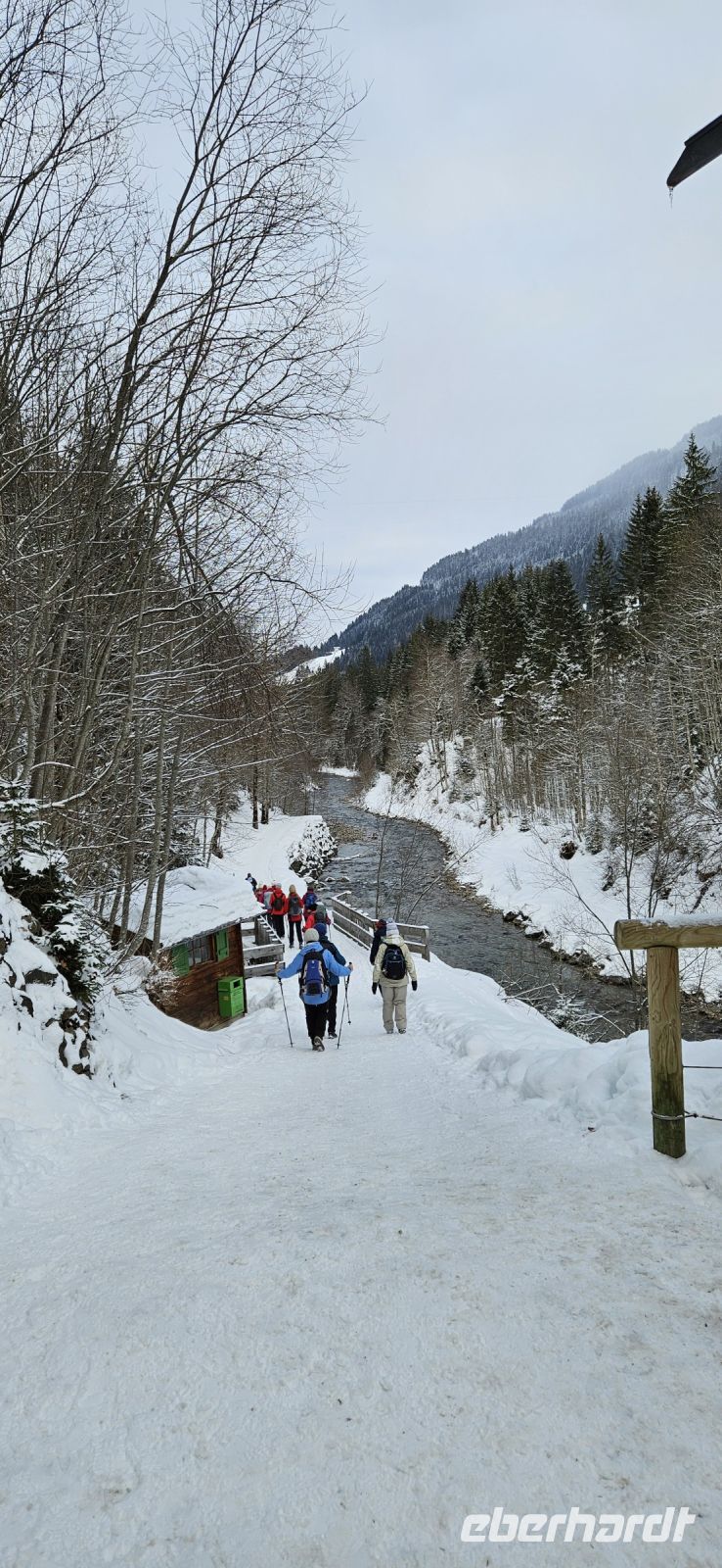 Start war wieder 10 Uhr und wir wanderten hinunter nach Riezlern bis zur Post und von dort bergan bis zum Bergstüble. Auch heute meinte das Wetter es wieder gut mit uns. DIE Sonne schien den ganzen Tag und die Sicht war fantastisch. Wir kamen gut voran, mal war der Weg recht steil, dann wieder gemütlich. Kurz nach 11 Uhr erreichten wir das Bergstübl und kehrten ein. Leider hatte die Rodelbahn nicht mehr eine durchgängig gute Schneedecke und so wanderten wir zu Fuss über die Rodelbahn hinunter nach Schwand. Wir fuhren 2 Stationen mit dem Bus Richtung Riezlern und wanderten dann durch den Wald steil bergab ins Tal der Breitach. Im November letzten Jahres wurde dort die alte neue Holzbrücke wieder in Betrieb genommen und so erreichten wir mühelos das andere Ufer, dort wo das Schwarzwasser in die Breitach mündet. Im Schwarzwassertal ging es dann auf einem wunderschönen Weg bergauf bis zur Mahdbrücke und dort wieder auf die andere Uferseite. Durch ein Moor- und Supfgebiet führte unser Weg bergauf und bergab und schließlich erreichten wir die Naturbücke. Das Wasser unter der Brücke hatte eine dicke Eisschicht und so wirkte die Brücke wenig spektakulär. Nach der Querung wanderten wir wieder bergan zur Panorama Hütte, aber die war völlig überfüllt. Schade, aber nicht zu ändern. So gingen wir gleich zurück ins Hotel . Nach einer kurzen Pause brachen wir wieder auf zum Kaffee trinken und zum Abholen unsere vorbestellten Schneeschuhe bei Sport Kessler.