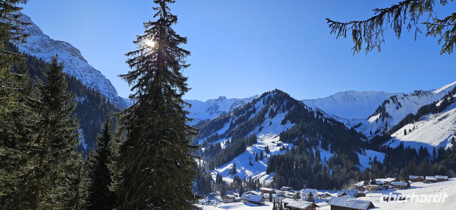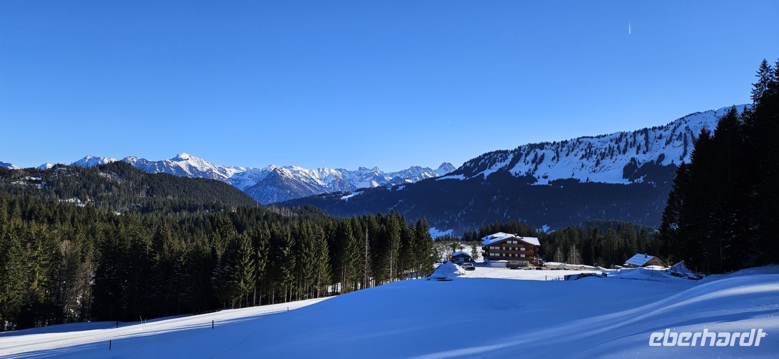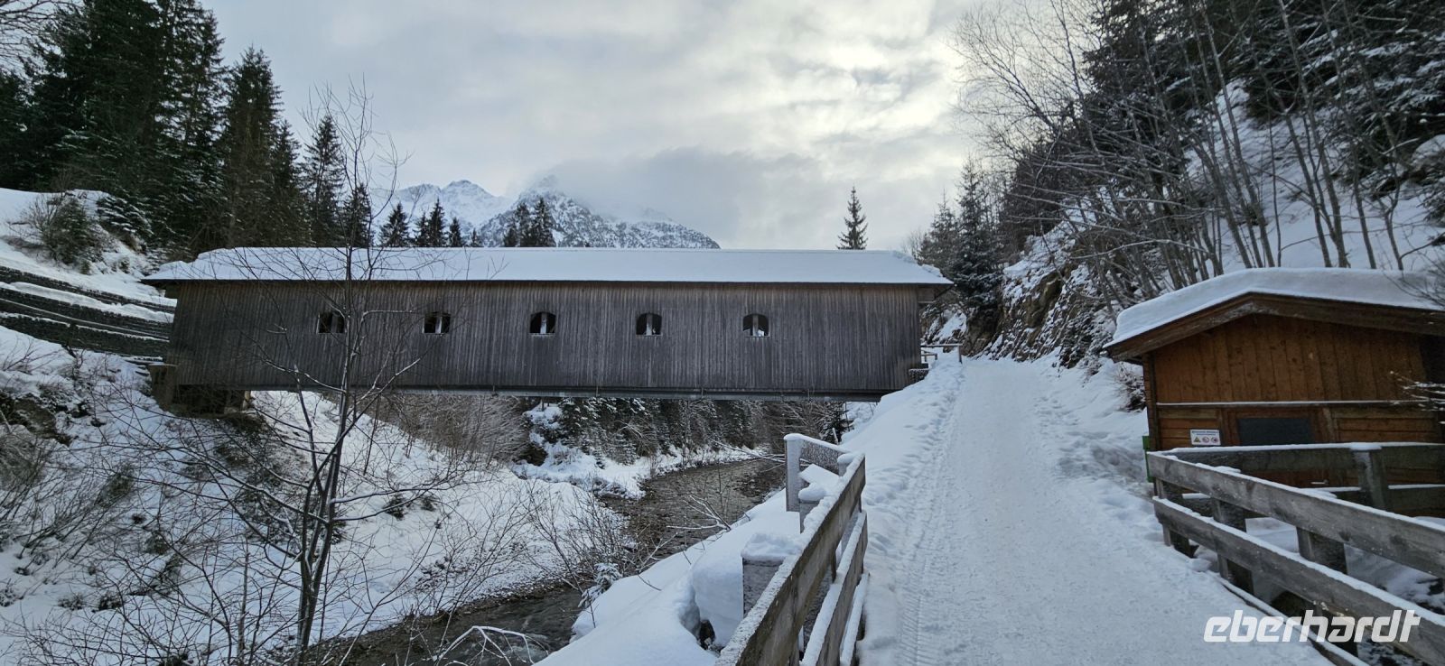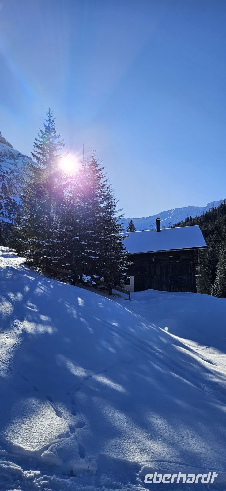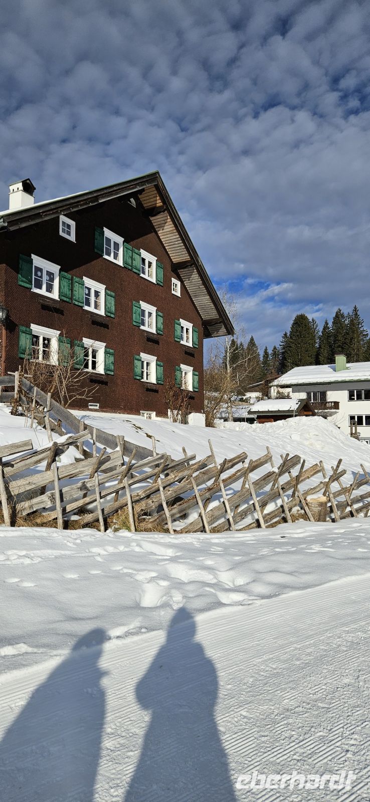 Start war wieder 10 Uhr und wir wanderten hinunter nach Riezlern bis zur Post und von dort bergan bis zum Bergstüble. Auch heute meinte das Wetter es wieder gut mit uns. DIE Sonne schien den ganzen Tag und die Sicht war fantastisch. Wir kamen gut voran, mal war der Weg recht steil, dann wieder gemütlich. Kurz nach 11 Uhr erreichten wir das Bergstübl und kehrten ein. Leider hatte die Rodelbahn nicht mehr eine durchgängig gute Schneedecke und so wanderten wir zu Fuss über die Rodelbahn hinunter nach Schwand. Wir fuhren 2 Stationen mit dem Bus Richtung Riezlern und wanderten dann durch den Wald steil bergab ins Tal der Breitach. Im November letzten Jahres wurde dort die alte neue Holzbrücke wieder in Betrieb genommen und so erreichten wir mühelos das andere Ufer, dort wo das Schwarzwasser in die Breitach mündet. Im Schwarzwassertal ging es dann auf einem wunderschönen Weg bergauf bis zur Mahdbrücke und dort wieder auf die andere Uferseite. Durch ein Moor- und Supfgebiet führte unser Weg bergauf und bergab und schließlich erreichten wir die Naturbücke. Das Wasser unter der Brücke hatte eine dicke Eisschicht und so wirkte die Brücke wenig spektakulär. Nach der Querung wanderten wir wieder bergan zur Panorama Hütte, aber die war völlig überfüllt. Schade, aber nicht zu ändern. So gingen wir gleich zurück ins Hotel . Nach einer kurzen Pause brachen wir wieder auf zum Kaffee trinken und zum Abholen unsere vorbestellten Schneeschuhe bei Sport Kessler.