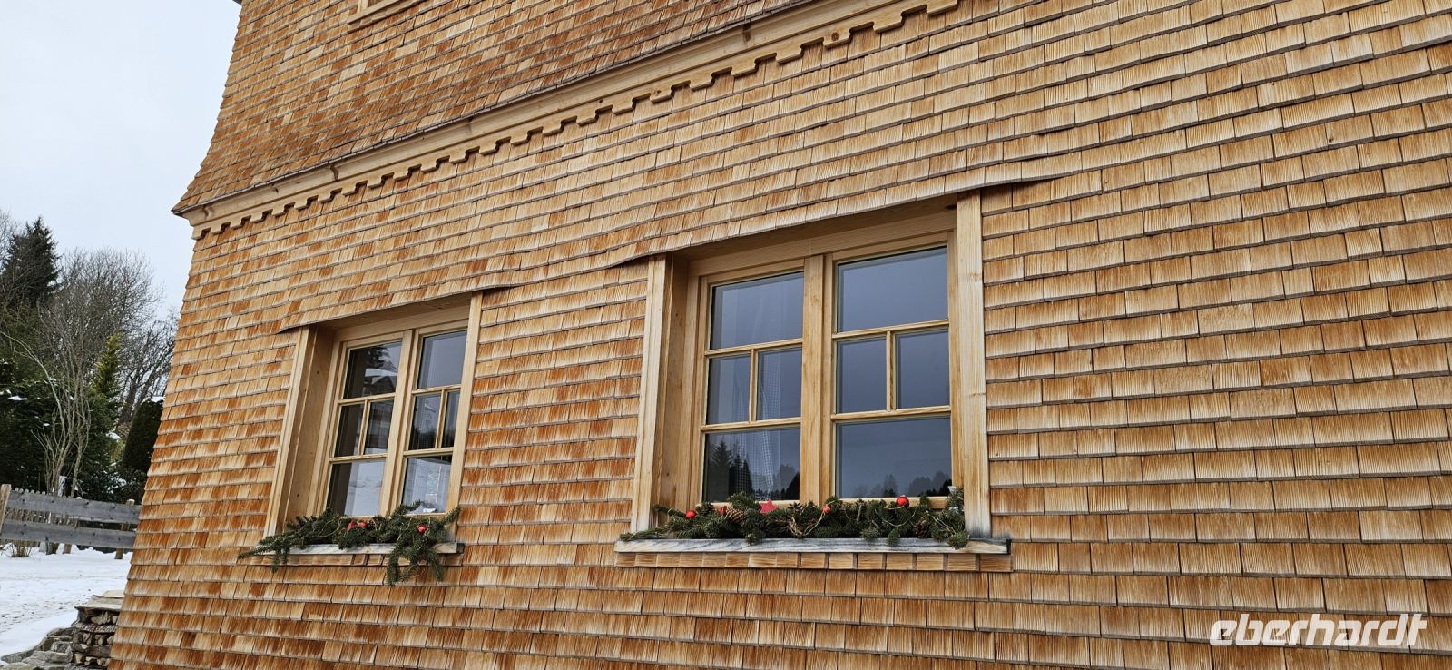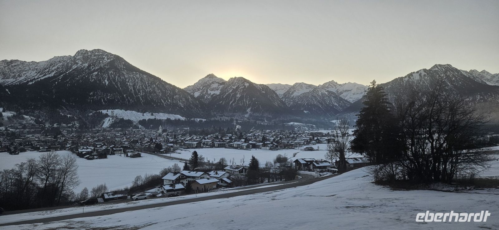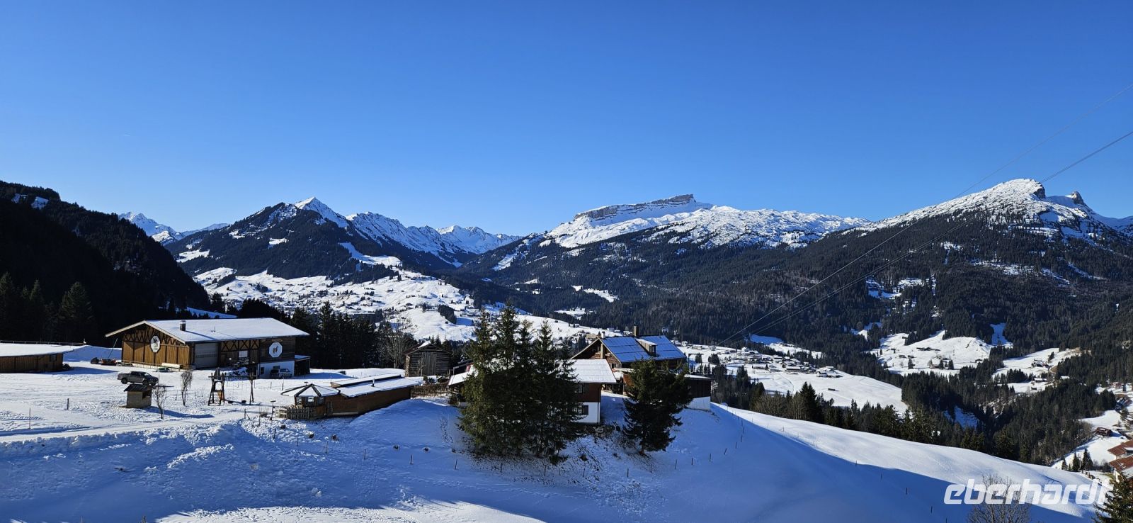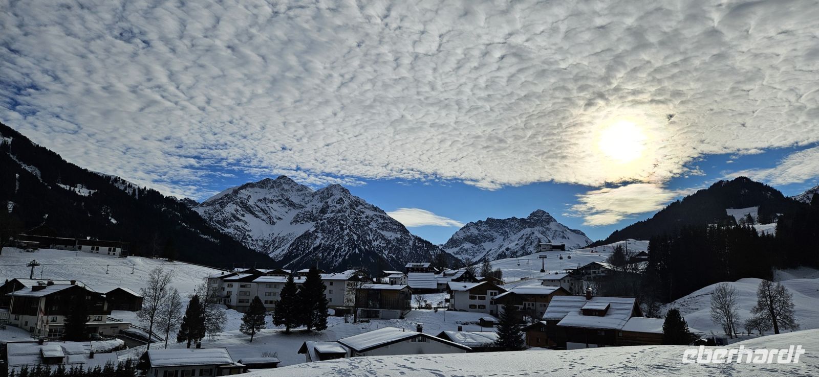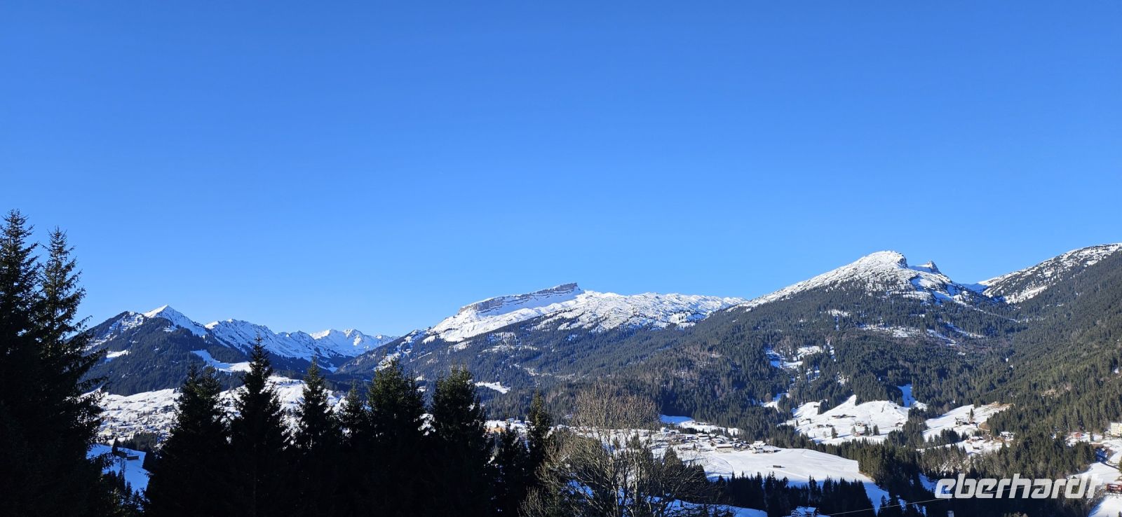 Start war wieder 10 Uhr und wir wanderten hinunter nach Riezlern bis zur Post und von dort bergan bis zum Bergstüble. Auch heute meinte das Wetter es wieder gut mit uns. DIE Sonne schien den ganzen Tag und die Sicht war fantastisch. Wir kamen gut voran, mal war der Weg recht steil, dann wieder gemütlich. Kurz nach 11 Uhr erreichten wir das Bergstübl und kehrten ein. Leider hatte die Rodelbahn nicht mehr eine durchgängig gute Schneedecke und so wanderten wir zu Fuss über die Rodelbahn hinunter nach Schwand. Wir fuhren 2 Stationen mit dem Bus Richtung Riezlern und wanderten dann durch den Wald steil bergab ins Tal der Breitach. Im November letzten Jahres wurde dort die alte neue Holzbrücke wieder in Betrieb genommen und so erreichten wir mühelos das andere Ufer, dort wo das Schwarzwasser in die Breitach mündet. Im Schwarzwassertal ging es dann auf einem wunderschönen Weg bergauf bis zur Mahdbrücke und dort wieder auf die andere Uferseite. Durch ein Moor- und Supfgebiet führte unser Weg bergauf und bergab und schließlich erreichten wir die Naturbücke. Das Wasser unter der Brücke hatte eine dicke Eisschicht und so wirkte die Brücke wenig spektakulär. Nach der Querung wanderten wir wieder bergan zur Panorama Hütte, aber die war völlig überfüllt. Schade, aber nicht zu ändern. So gingen wir gleich zurück ins Hotel . Nach einer kurzen Pause brachen wir wieder auf zum Kaffee trinken und zum Abholen unsere vorbestellten Schneeschuhe bei Sport Kessler.
