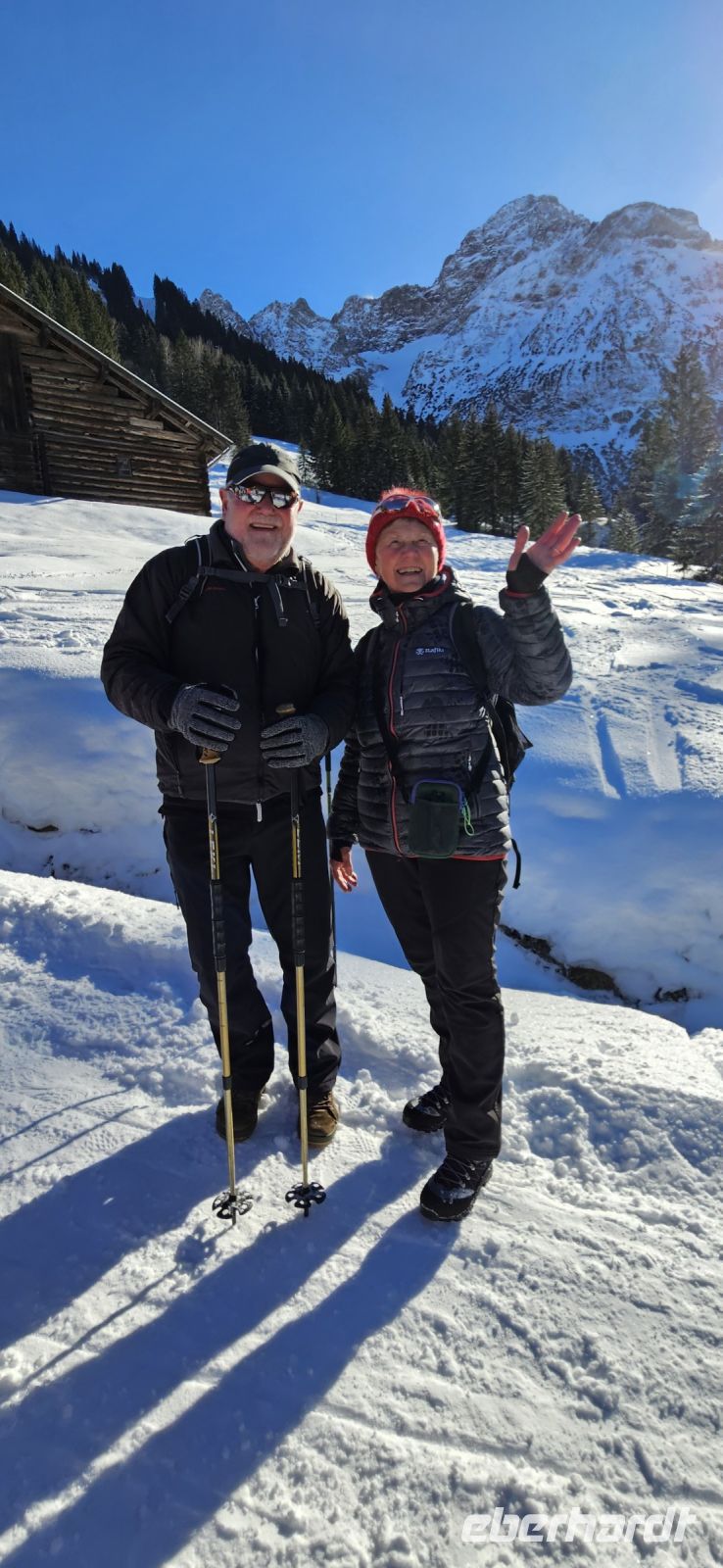 Über Nacht war es sehr kalt und so beschlossen wir schon am Vorabend, erst 10 Uhr mit der Wanderung zu starten. Ab 7.30 Uhr gab es Frühstück und das genossen wir ausgiebig. Dann ging es 10 Uhr los, direkt ab Hotel zunächst hinunter nach Riezlern, über die Breitachbrücke und dann immer am Ufer der Breitach entlang bergauf. Der Weg war sehr abwechslungsreich .Wir wanderten auf Schnee, der gar nicht glatt war und so brauchten wir auch unsere Spiks nicht anzulegen. Ab Hirschegg führte der Weg bergan und wurde zum Panoramaweg mit Blick auf die andere Talseite und bis zum Talende mit dem Widderstein. Unterwegs kamen wir an einem alten Walserhaus vorbei, welches jetzt von einer jungen Familie bewohnt wird. Dann ging es steil bergan bis zur Inneren Wiesalpe und dort kehrten wir zu Mittag ein. Gut gestärkt wanderten wir bergab nach Mittelberg, gingen über die Schwendebrücke und wanderten dann immer am Ufer der Breitach bergab. Unterwegs gab es zur Belohnung einen Zirbenlikör und dann ging es weiter am Ufer entlang und später steil bergan hinauf nach Hirschegg. DORT nahmen 4 Gäste den Bus zurück nach Riezlern und alle anderen wanderten über den Panoramaweg zurück zum Hotel.