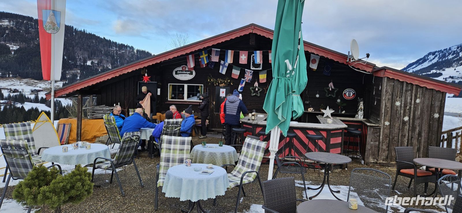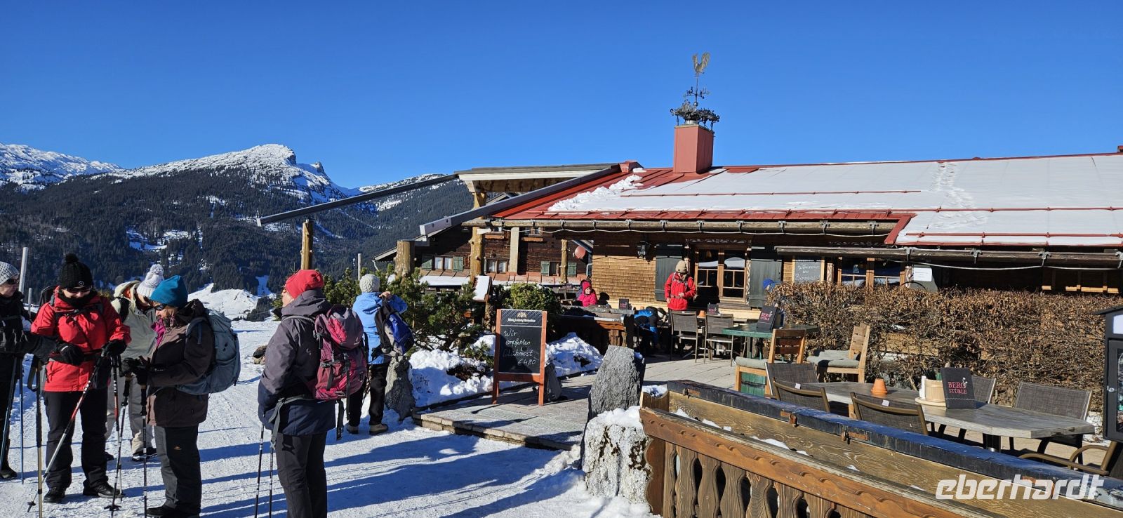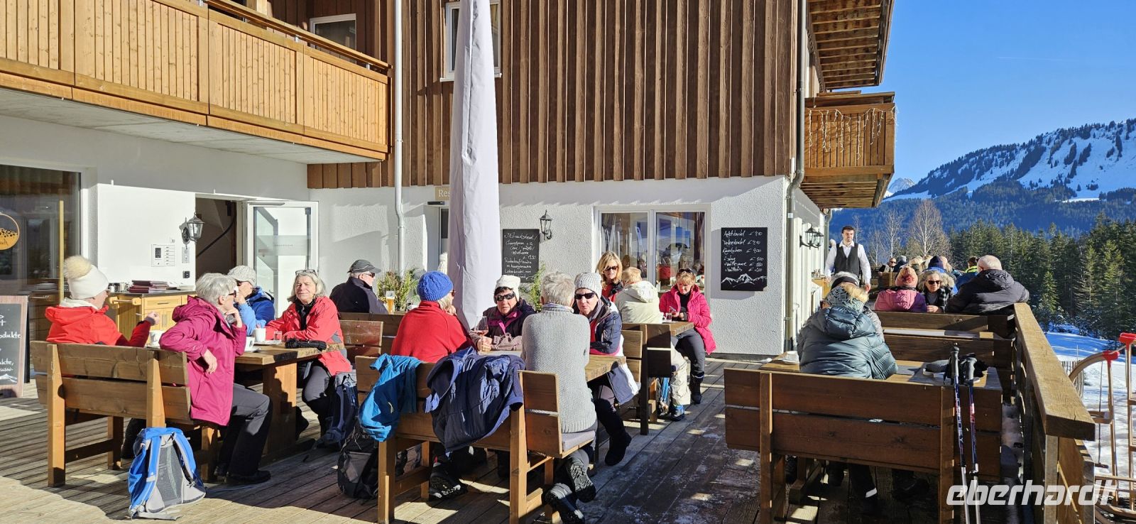 Zur Mittagspause am Hörnle Pass sassen wir draussen in der Sonne und genossen die leckeren Spezialitäten. Danach wanderten wir wieder bergab zum Berghof und nahmen von dort den Bus zurück nach Riezlern. Wir gaben unsere geliehenen Schneeschuhe und Stöcke ab und gönnten uns noch einen Glühwein am Hotel Riezlern. Dann mussten die Koffer gepackt werden und 18.30 Uhr gab es ein letztes Mal das leckere Abendessen. Wir bedankten uns beim Service- und Küchenteam sehr herzlich und begaben uns zu Bett.