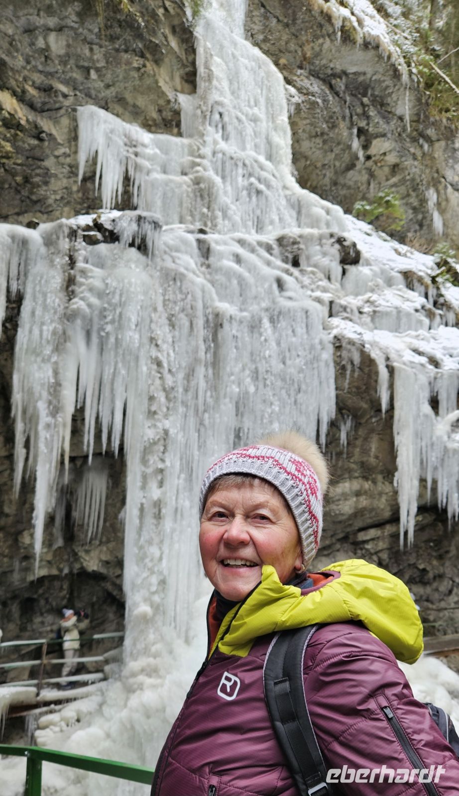Heute machte die Sonne mal Pause. Wir starteten wieder 10 Uhr und fuhren mit dem Bus Nr.1 aus dem Tal hinaus bis zur Haltestelle Söllereck Bahn, die schon in Deutschland lag. Von dort wanderten wir hinunter zum Eingang der Breitachklamm. Wir kamen durch die Ortschaften Kornau und Tiefenbacb, die alle beide Ortsteile von Oberstdorf sind. Der Weg durch die Breitachklamm war gut präpariert und die vielen Eisskulpturen rechts und links des Weges luden zu zahlreichen Fotos ein. Am Ende der Klamm führte der Weg steil bergan bis zur Walserschanze an der deutsch-österreichischen Grenze. Von dort fuhren wir mit dem Bus bis Riezlern Post und machten unsere verspätete Mittagspause. 14.30 Uhr folgte noch eine Wanderung über die Hängebrücke hinüber zum Eberle Hof und weiter bergan zur Panorama Hütte. Dort kehrten wir nochmals ein auf einen Glühwein oder Tee und dann war es nicht mehr weit bis zum Hotel. Und wieder ging ein erlebnisreicher, wunderschöner Tag zu Ende.