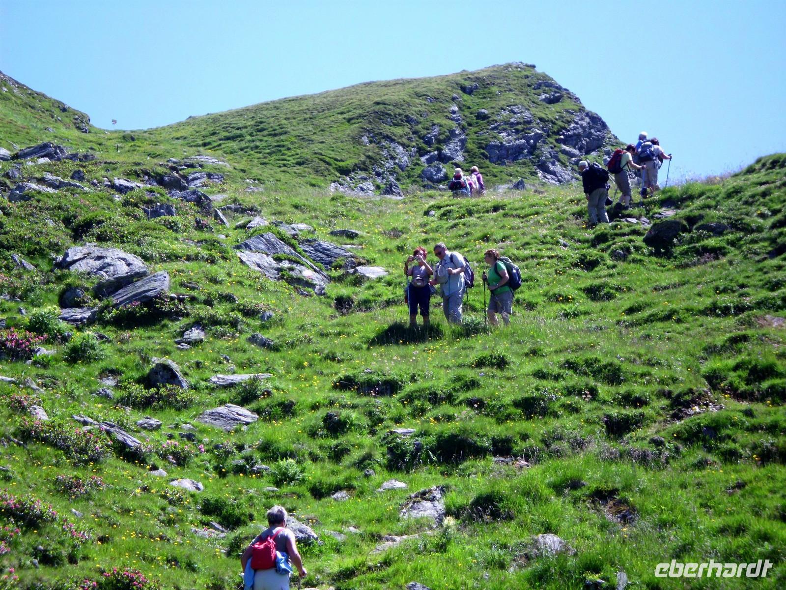 Das sind auch 636 Höhenmeter mit grandiosem Blick in die Tuxer Alpen. Durch die Sonne glitzern die Bergseen in schönster Pracht. Blühende Alpenrosen, blauer Enzian und das Edelweiß sind unsere Wegbegleiter. Das pfeifen der Murmeltiere ist deutlich in der Ferne zu hören.