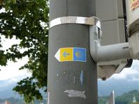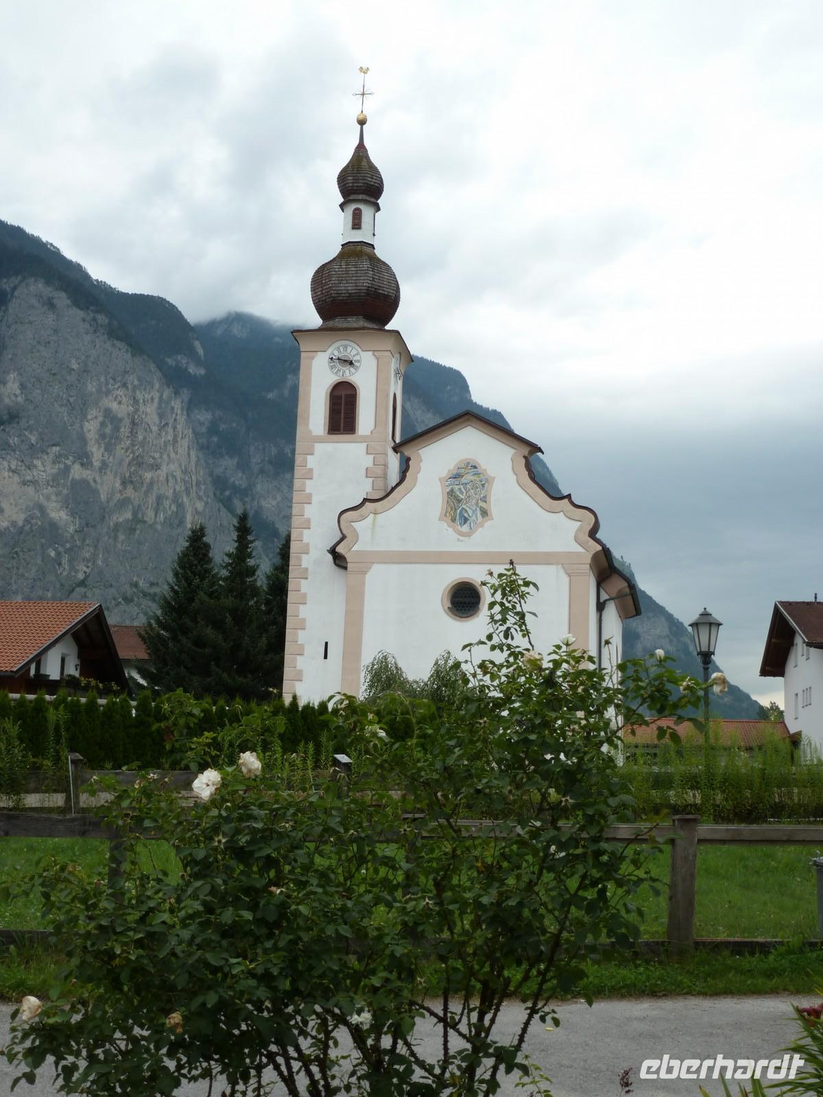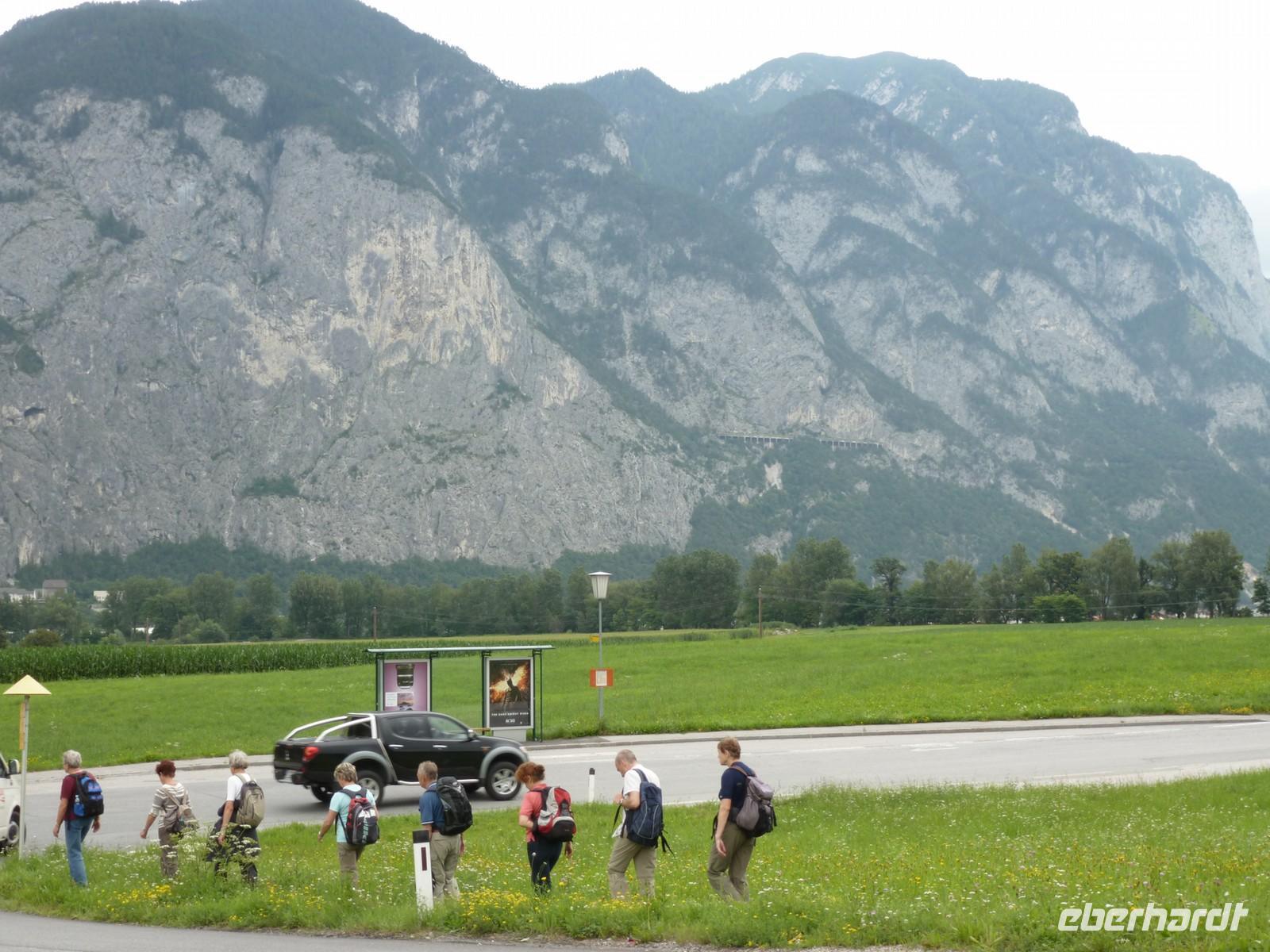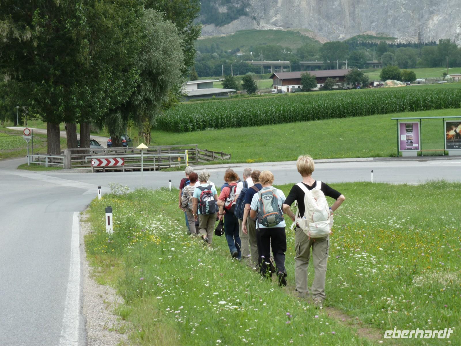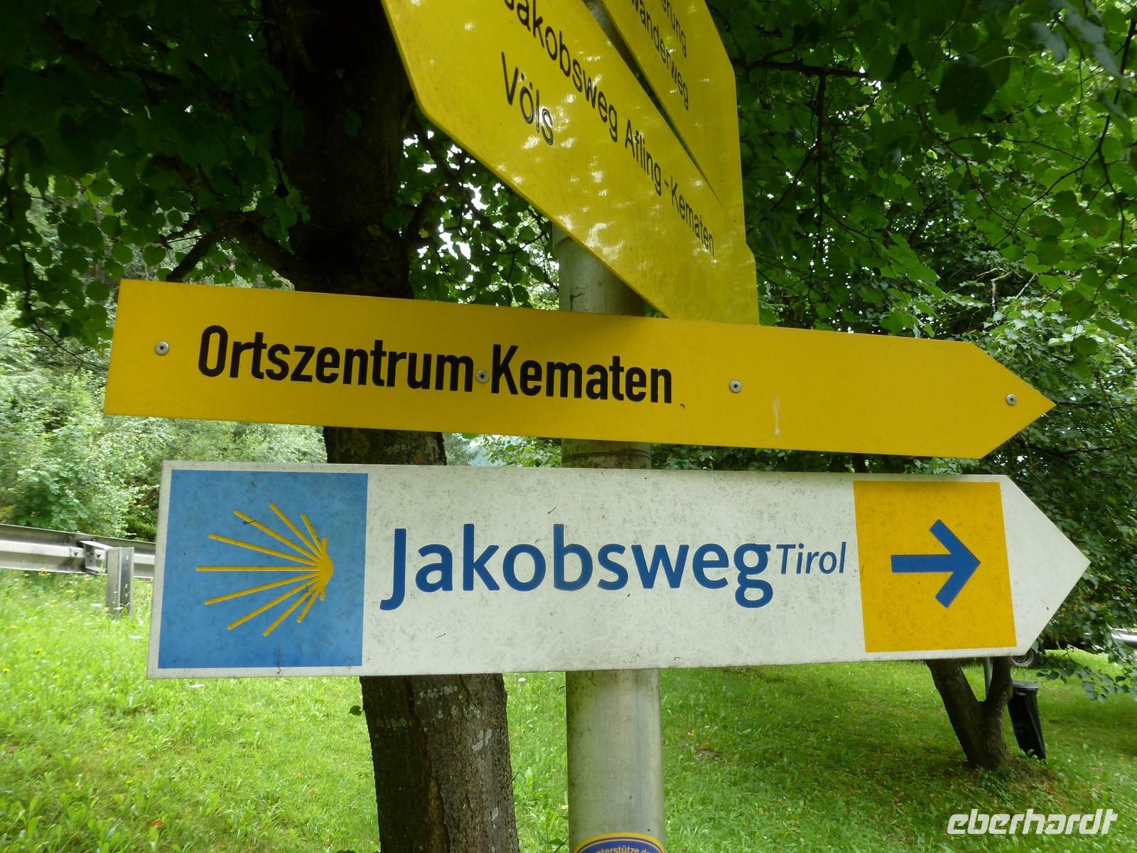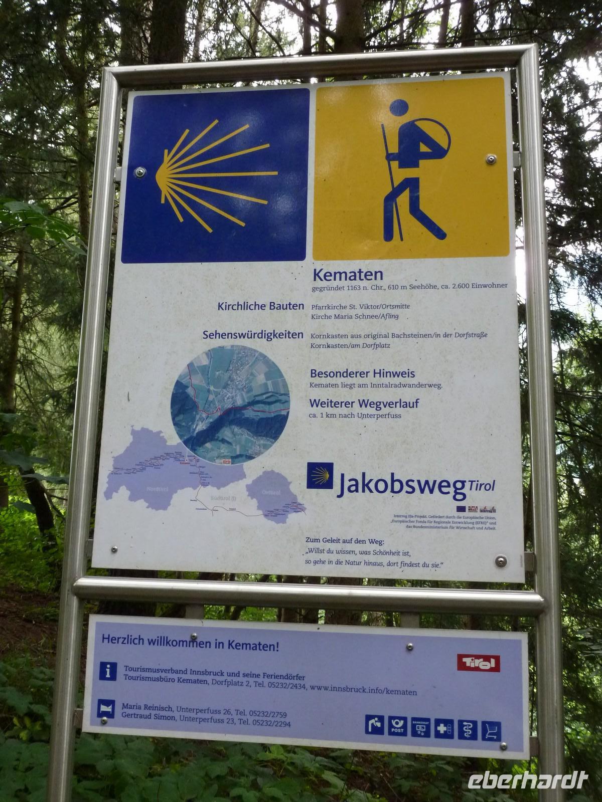 Im Restaurant „Kranebitterhof“ kehrten wir zur Mittagspause ein. Frisch gestärkt setzten wir die Wanderung fort. Im keinen Dörfchen Afling machten wir die Bekanntschaft einer älteren, sehr charmanten Dame, die uns auf den Pilger Stempel aufmerksam machte. Da Sie Zeit hatte, unterhielten wir uns eine Weile mit Ihr und Sie war sehr erfreut über so eine große Wandergruppe. Am Nachmittag erreichten wir Kematen. Von dort aus war es nur noch 1 km bis Unterperfuss. In diesem Dorf besichtigten wir die Dorfkirche. Im liebevoll gestalteten Garten der Kirche entdeckten wir auch ein Hinweisschild: