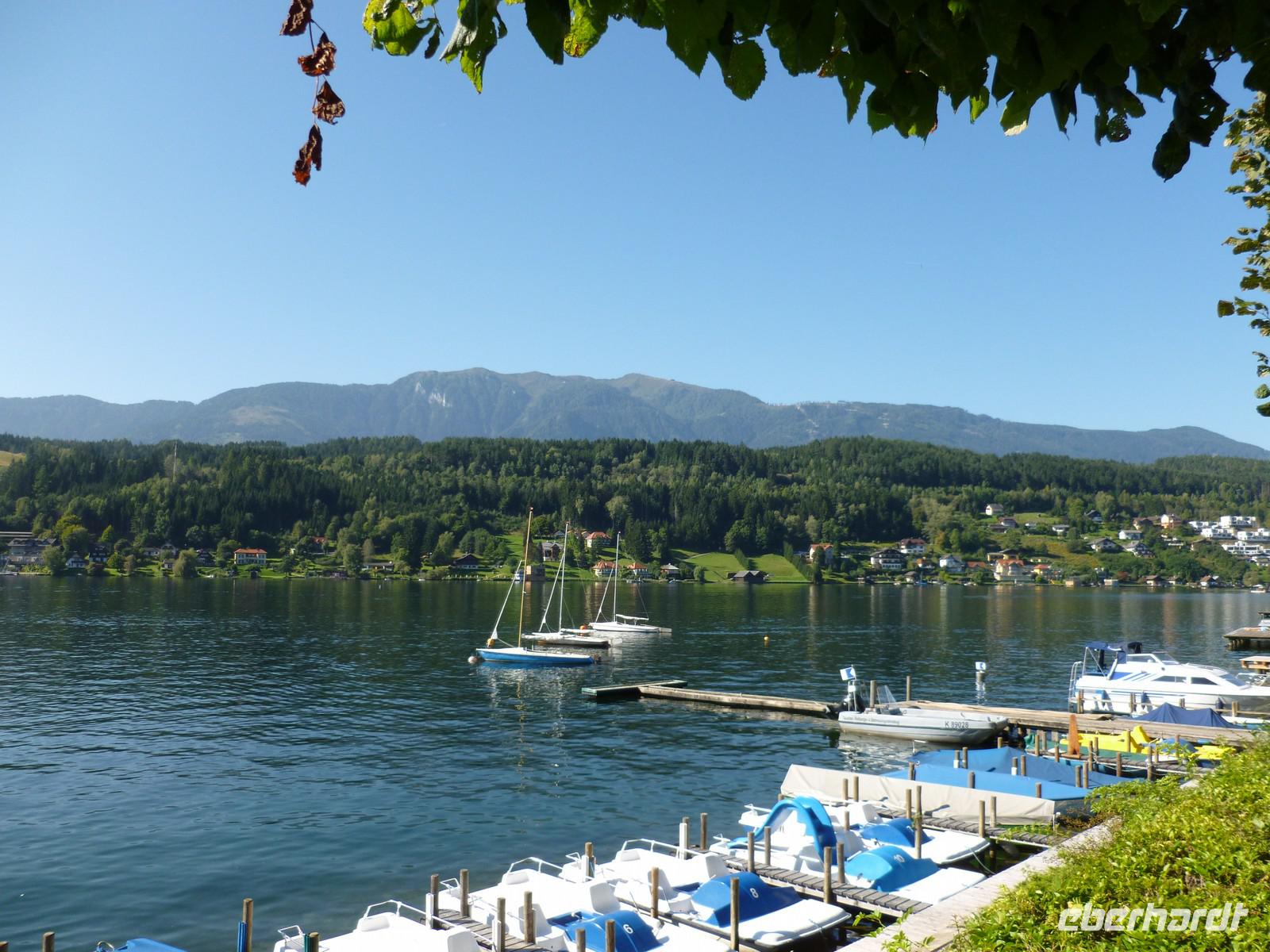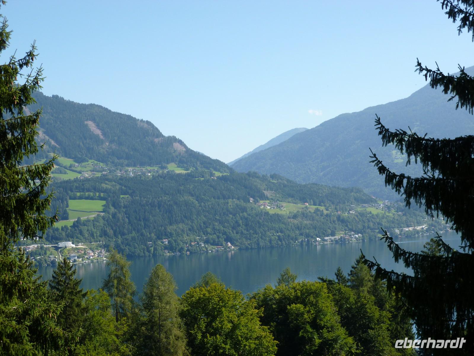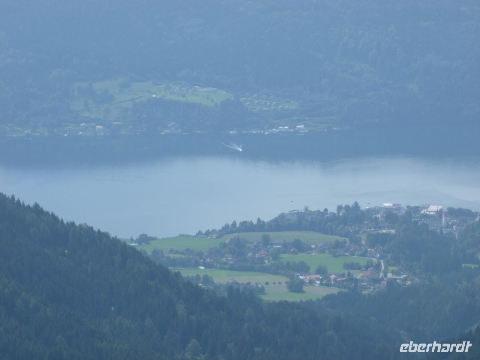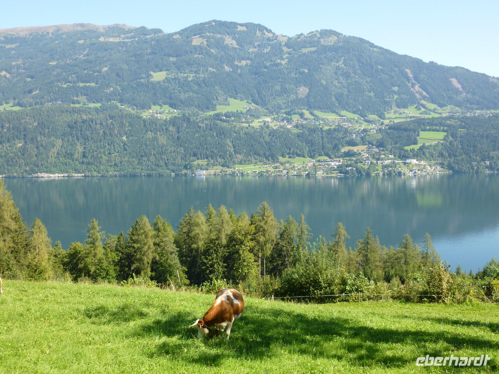 Wir spazierten zum Millstätter See zur Schiffsanlegestelle. Hier hieß es Leinen los. Wir fuhren mit dem Schiff bis zur Laggerbucht. Wir genießen die Seeberührung, am Nordufer und die Kulisse von Millstatt mit dem geschichtsträchtigem Stift. Am Südufer spüren wir schon den Einklang der Natur - der fließende Übergang vom Berg zum See. Jetzt wandern wir los immer entlang des Millstääter-See-Rücken, eine rund 2 km breite und 13 km lange durch die letzte Eiszeit zu sanften Hügeln geschliffene Barriere zwischen dem Millstätter See (588 m Seehöhe) im Norden und dem Drautal (ca. 530 m Seehöhe) im Süden ist größtenteils ein Landschaftsschutzgebiet, das sich auf den Gemeindegebiet von Seeboden, Spitall an der Drau und Ferndorf befindet. Das Südufer des Millstätter Sees ist im Gegensatz zum Nordufer in weiten Teilen naturbelassen und nahezu unbesiedelt. Durch die Ortschaften Großegg und Winkl und über die Kreuztratte erreichen wir den Egelsee. Der Moorsee mit einer Fläche von 9,35 ha ist vollständig von am Wasser schaukelnden Schwingrasen umsäumt. Aufgrund seiner Lage inmitten eines ausgedehnten Moores ist seine Wasserfarbe tiefbraun. Die Moorsäuren führen zu einem niedrigen pH-Wert. Botanische Besonderheiten sind das Papillentorfmoos, der fleischfressende rundblättrige und langblättrige Sonnentau und der Wasserschlsuch, die rostblättrige Almrose, das schneidige Wollgras, die Rosmarinheide (Andromeda polifolia) oder die Moorbeere. Alle Stufen der Moorbildung lassen sich am Egelsee beobachten. Eine zoologische Besonderheit ist das Auftreten eines Plankton-Hüpferlings. Ursprünglich gab es keine Fische in diesem See. Im Frühjahr bis zum Frühsommer sind eine Unzahl von Larven des Grasfroschs und des kleinen Teichfroschs anzutreffen. Langsam bekamen wir Hunger.