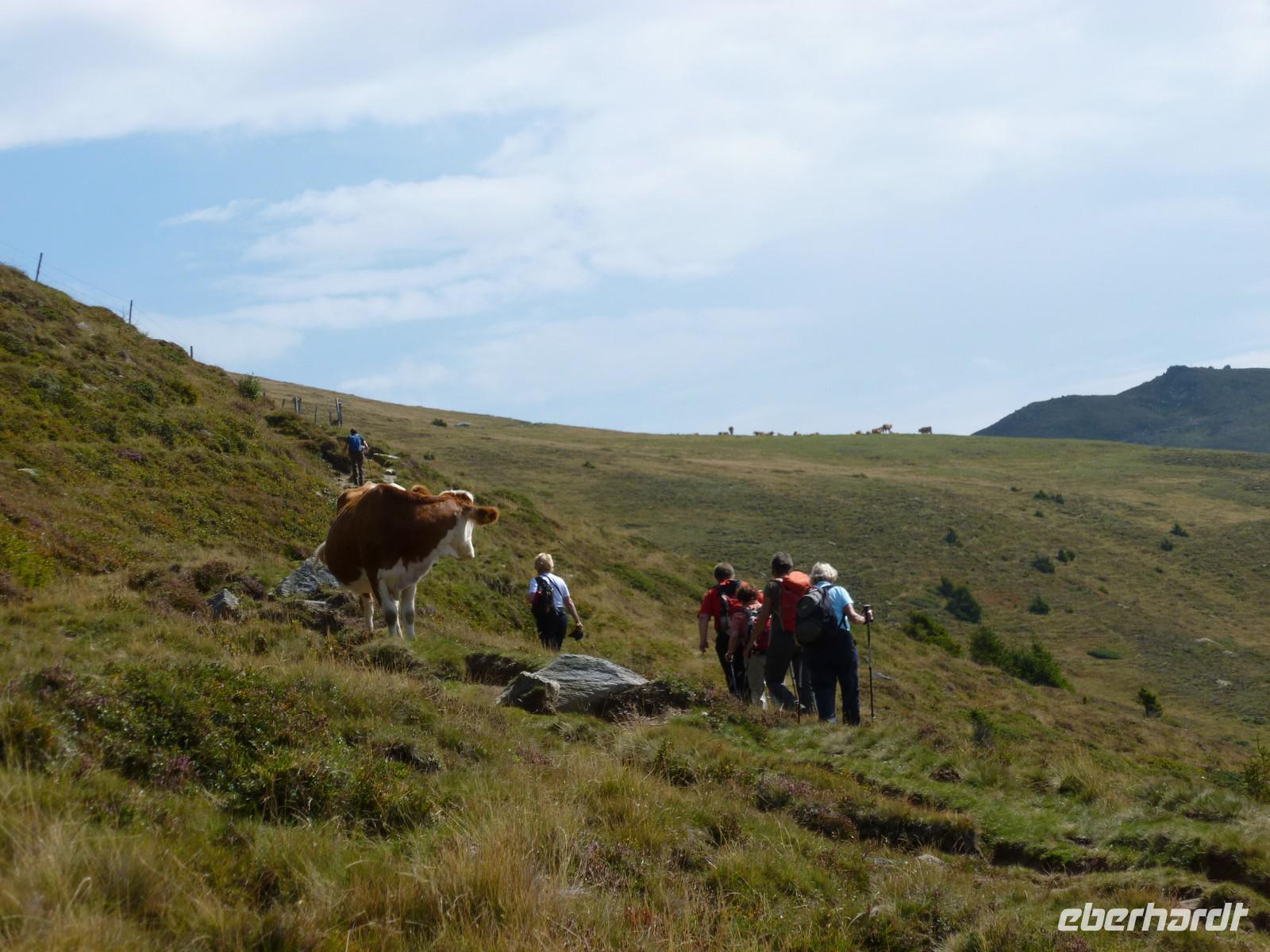 Wir sind eingebettet in die Geschichte des Bergbaues, wenn wir weiterziehen zum Stana Mandl. Der Bergbau hat diese Gegend geprägt und ist allgegenwärtig. Nun genießen wir einen beeindruckenden Abstieg, umgeben von einer vielfältigen alpinen Flora und heilkräftigen Quellen, an denen wir uns laben. Unseren Hunger können wir sodann auf der Lammersdorfer Hütte stillen. Die Wirtsleute auf der Lammersdorfer Hütte begrüßen uns mit Kärntner Gastfreundlichkeit und ihren „Schmankerlen". Wir genoßen die Brotzeit bei einem herrlichen Blick auf die Karnischen Alpen und die Karawanken. Anschließend ging es wieder zurück nach Seeboden. Wir freuten uns schon auf das leckere Abendessen.