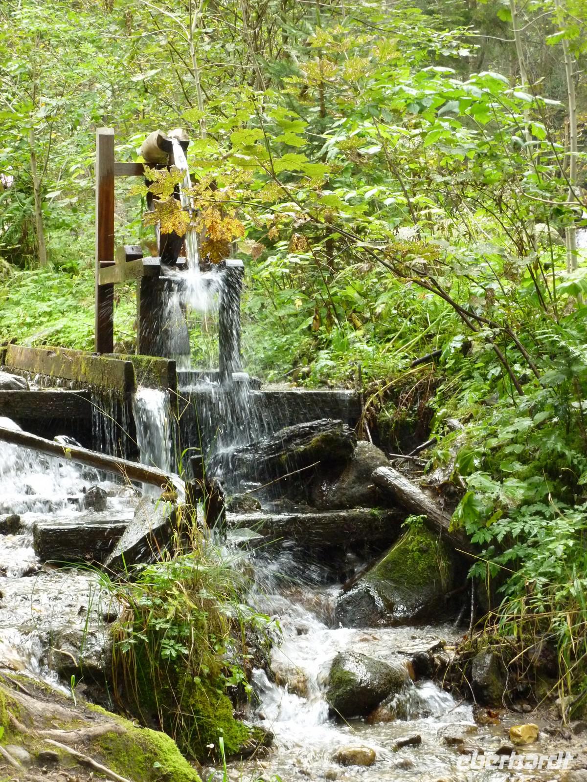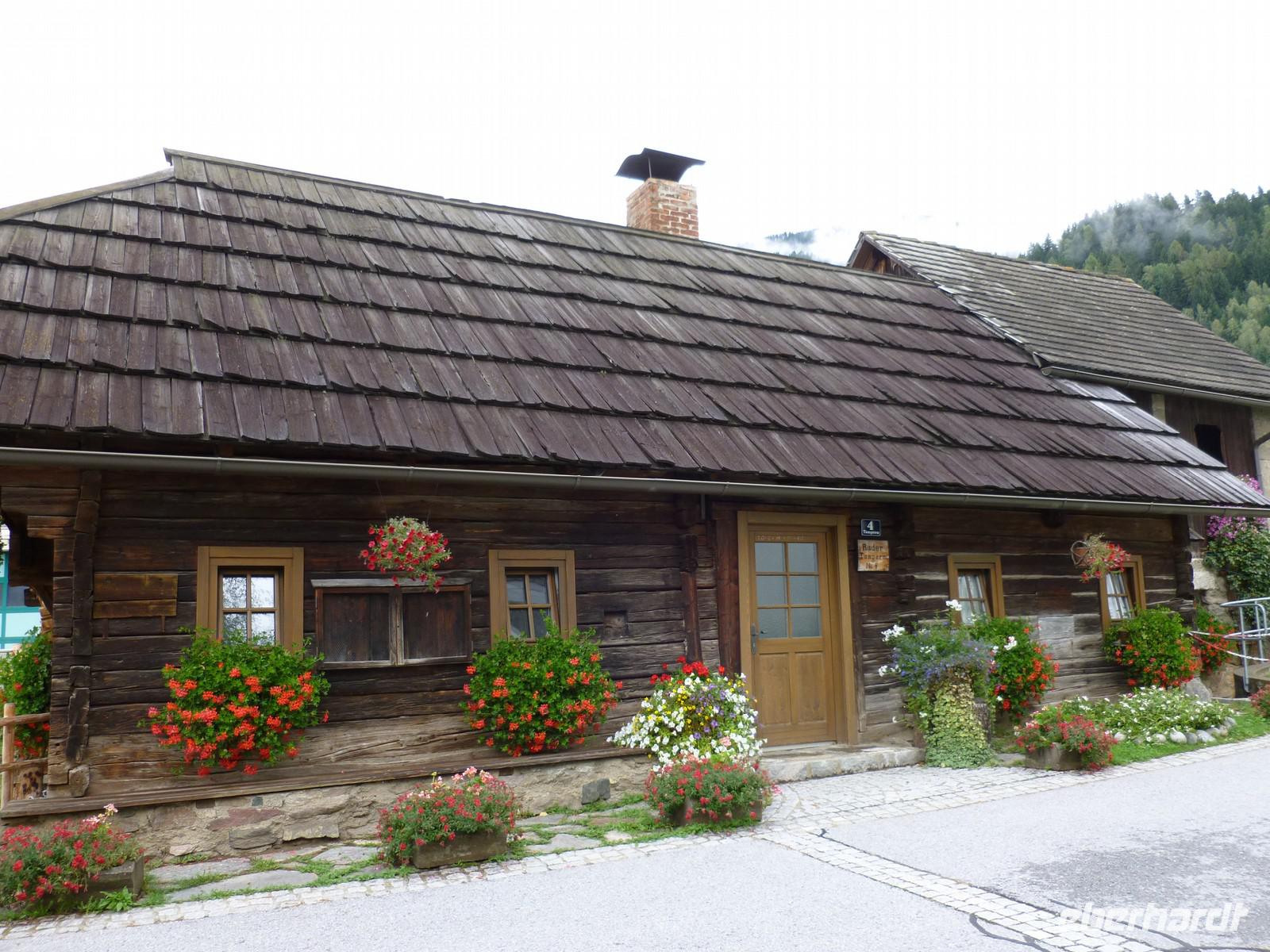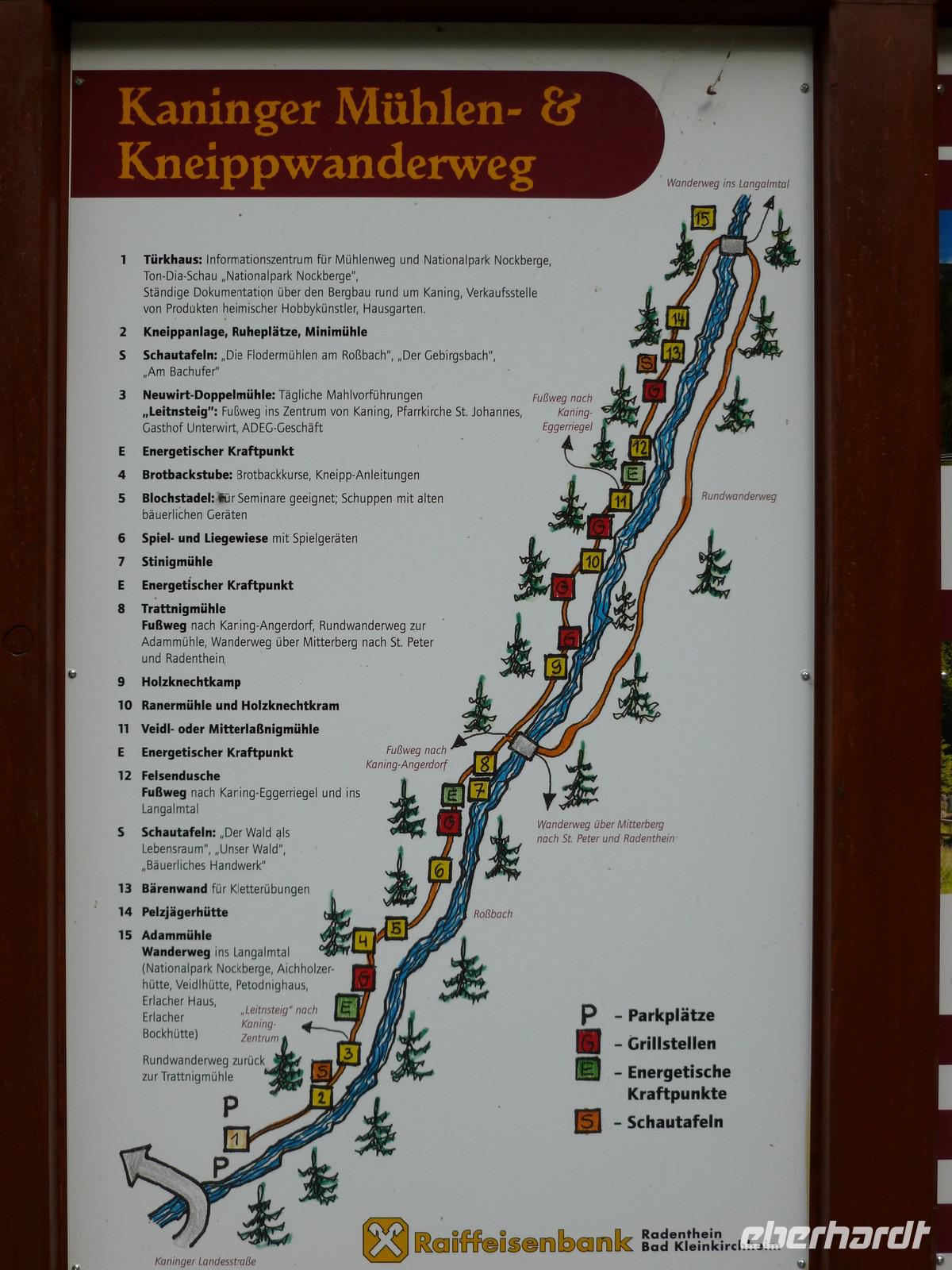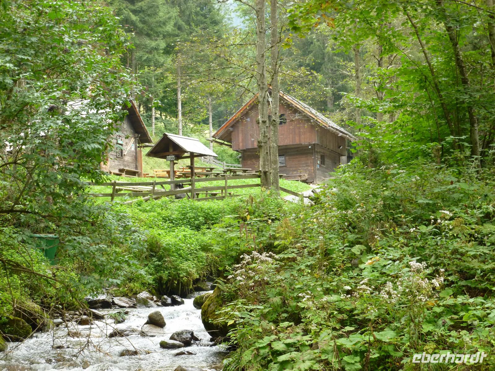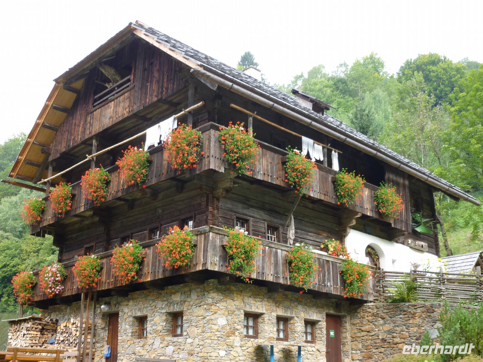 Auch heute bringt uns der Shuttlebus nach Kaning zum „Türkhaus". Das Türkhaus stand bis vor wenigen Jahren eigentlich am Laufenberg - etwas oberhalb vom Dörfchen Kaning - uns sollte abgerissen werden um einem modernen Wohnhaus Platz zu machen. Die Naturfreunde Radenthein retteten das alte Kärntner Bauernhaus - trugen es ab und bauten es zu Beginn des Mühlen- und Kneippweges wieder originalgetreu auf. Heute findet man im Türkhaus ein Infocenter für den Nationalpark Nockberge,eine Galerie des bekannten, in Kaning geborenen Künstlers Günther Frey sowie einen kleinen Kräutergarten. Wie kam das Haus zu seinem Namen? Gegen Ende des 15. Jhd. trieben die Türken hier ihr Unwesen. Sie zogen plündernd durchs Land und steckten Weiler und Höfe in Brand. Döbriach und Radenthein brannten lichterloh. Die Bauern am Laufenberg sahen die Brände und verliesen Ihre Höfe um sich im Wald zu verstecken. Einzig eine Magd weigerte sich den Hof zu verlassen - türmte vor dem Hof Strohballen auf und zündete diese an. Als die Türken jenes Feuer sahen, kehrten Sie im Glauben schon alle Höfe angezündet zu haben , um. Von nun an hieß der Hof nur mehr „beim Türk". Nun begann unsere Wanderung entlang des Kneipp- und Mühlenweges zur Lederhosenwirtin. Auf einer Länge von ca. 4 km kann man noch sechs von früher insgesamt 22 Mühlen im sogenannten „Roßbachgraben" bewundern.