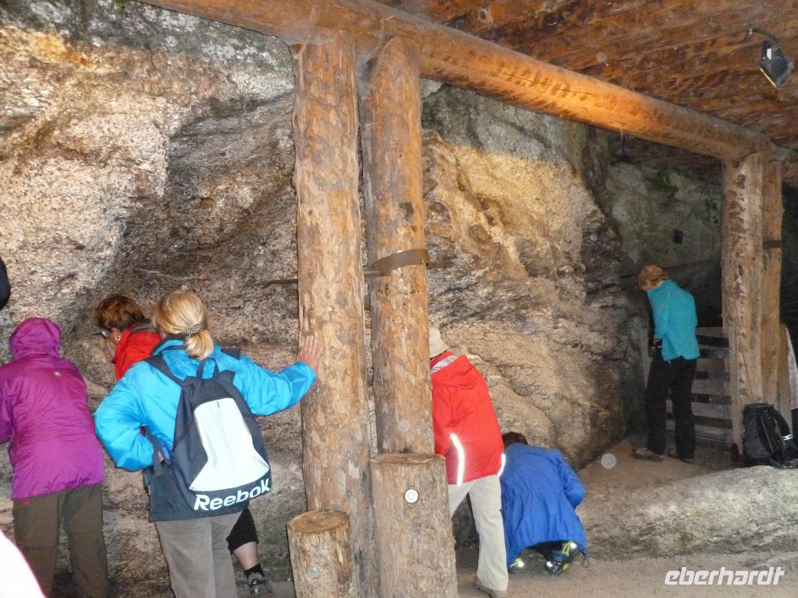 Der Himmel trübt sich ein und wir erreichen die zur Aichholzerhütte Hütte. Wir genossen in der Hütte eine Jause. Nach unserer Stärkung werden wir wieder abgeholt und fahren nach Rathenthein in das Granatium. Nach einer Führung durch das Museum, wo uns die schönsten Fundstücke der Region gezeigt wurden, besuchen wir einen ehemaliger Bergwerksstollen. Dieser gab bei seiner Restaurierung so manchen Schatz frei - Einen kleinen unterirdischen See, eine goldschimmernde Pyrit-Ader mit Quarz und etliche Granatadern. Im Schürfgelände konnten wir mit bereitgestelltem Werkzeug unseren eigenen Granat aus dem Fels schlagen. Professionelle Edelsteinschleifer bringen dann unseren Fund zum Glänzen. Bis 1909 wurde dieser Granat hier abgebaut und in die böhmischen Schleiferein gebracht. Unter dem Namen „Böhmischer Granat" kamen die Steine dann in den Handel. Vor unserem Strudelessen erwartet uns erstes erwartet uns eine große Überraschung. Von wegen Abendessen vorbereiten. Uns erwartete eine schicke Pferdekutsche. Wir fuhren durch den Ort Seeboden bis zur Parkanlage am See. Ein sehr schönes Erlebnis. Zurück in der Pension wartete schon der gedeckte Tisch auf uns. Strudel in allen Variationen. Den süßen Strudel erhielten wir auf Grund des schlechten Wetters in der ehemaligen Mühle gereicht. Unsere Gaumen wurden von den Köstlichkeiten sehr verwöhnt und unsere Mägen überstrapaziert.