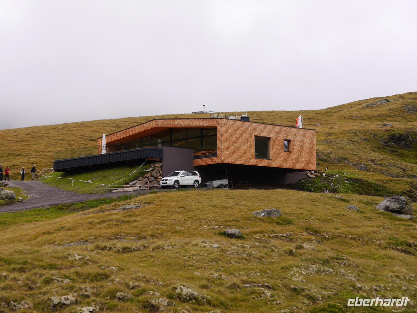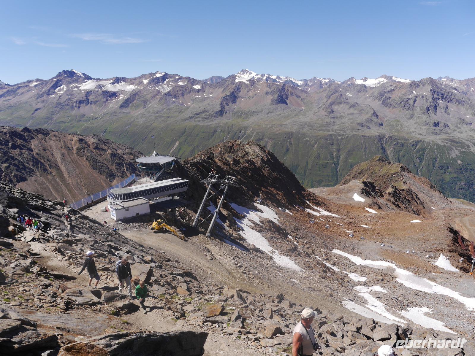 Die neuerbaute Top Mountain Star Hütte aus Stahl und Glas, läutete eine neue Ära der Hüttenkultur ein. Vom Dach bis zum Boden alles aus Glas, ermöglicht einen uneingeschränkten Rundblick in die Ötztaler Alpen. Nicht nur dass, sondern die Gipfel von Südtirol (Piz Boé), Subaital und Pitztal waren deutlich zu erkennen.