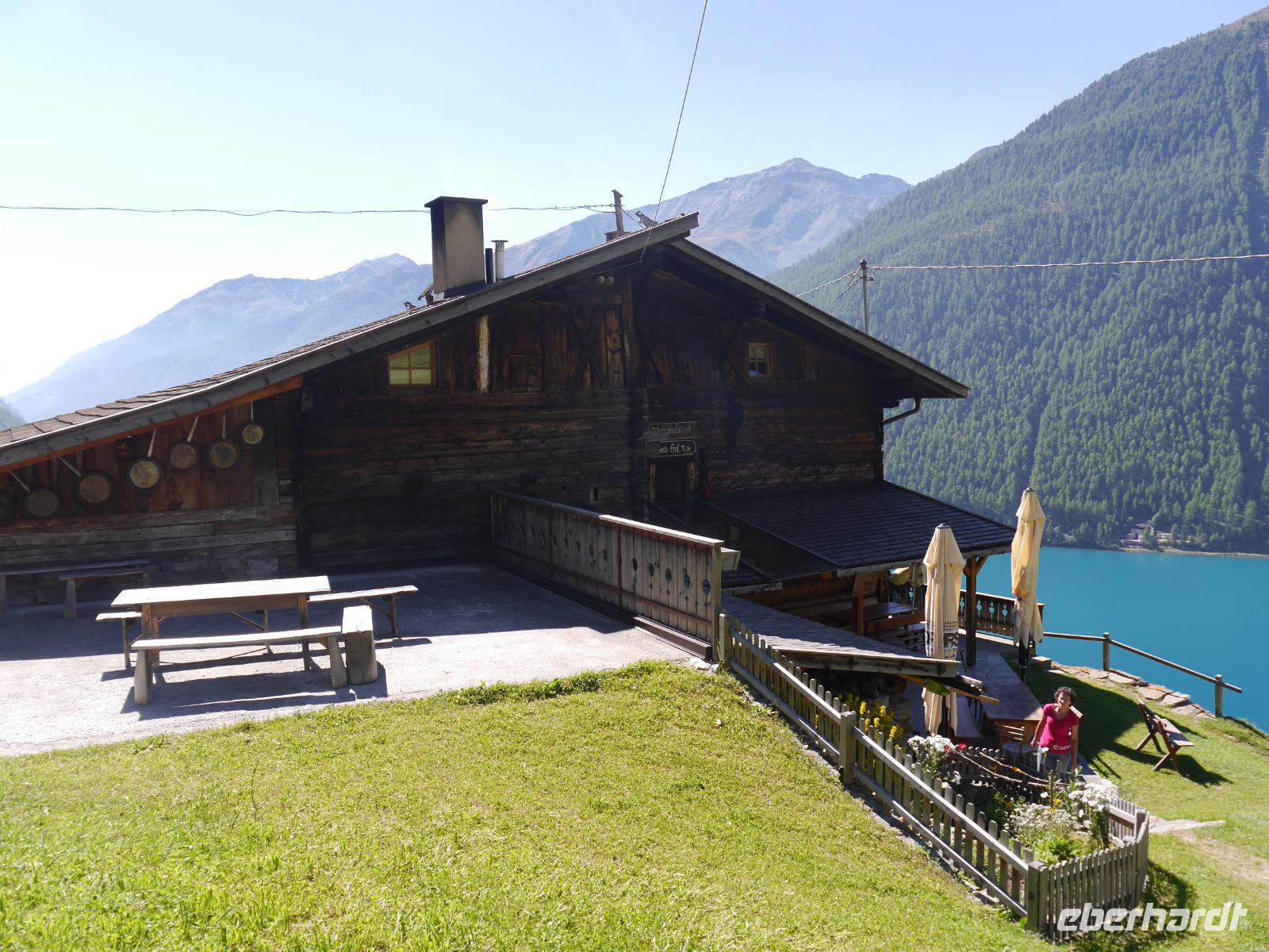 Der Hüttenwirt und Bergführer Markus Pirpamer erklärte uns zum Abschied die umliegenden Gipfel. Ohne Probleme meisterten wir den Abstieg auf alten Passwegen ins Südtiroler Schnalstal bis zum Tisenhof auf 1.814 Höhenmeter im Naturpark der Texelgruppe.