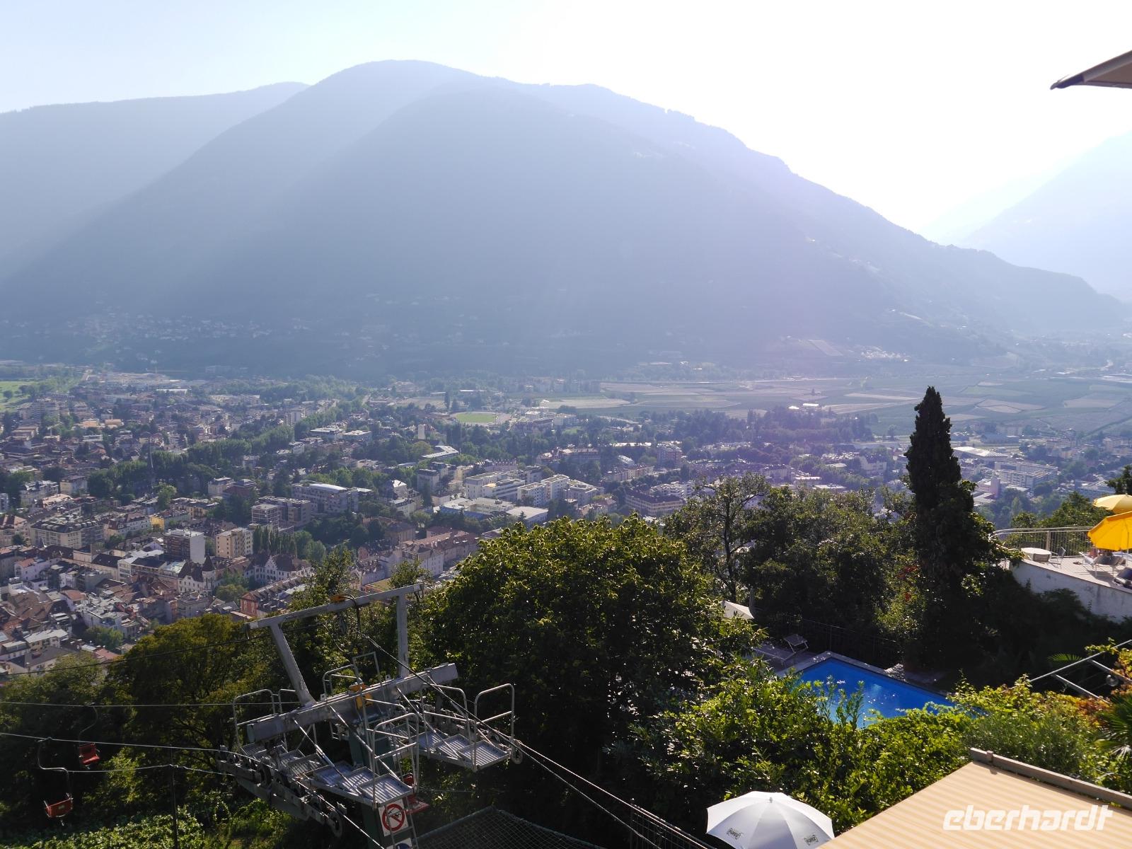 Mit dem Bus ging es von Vernagt nach Naturns zum Bahnhof und von dort war es nur ½ Stunde mit dem Zug nach Meran. Im Hotel Kolping standen unsere Koffer bereit und somit war unser Gepäck wieder vollständig. Einige Gäste nutzen auch den schönen Pool im Hotel zum Relaxen.