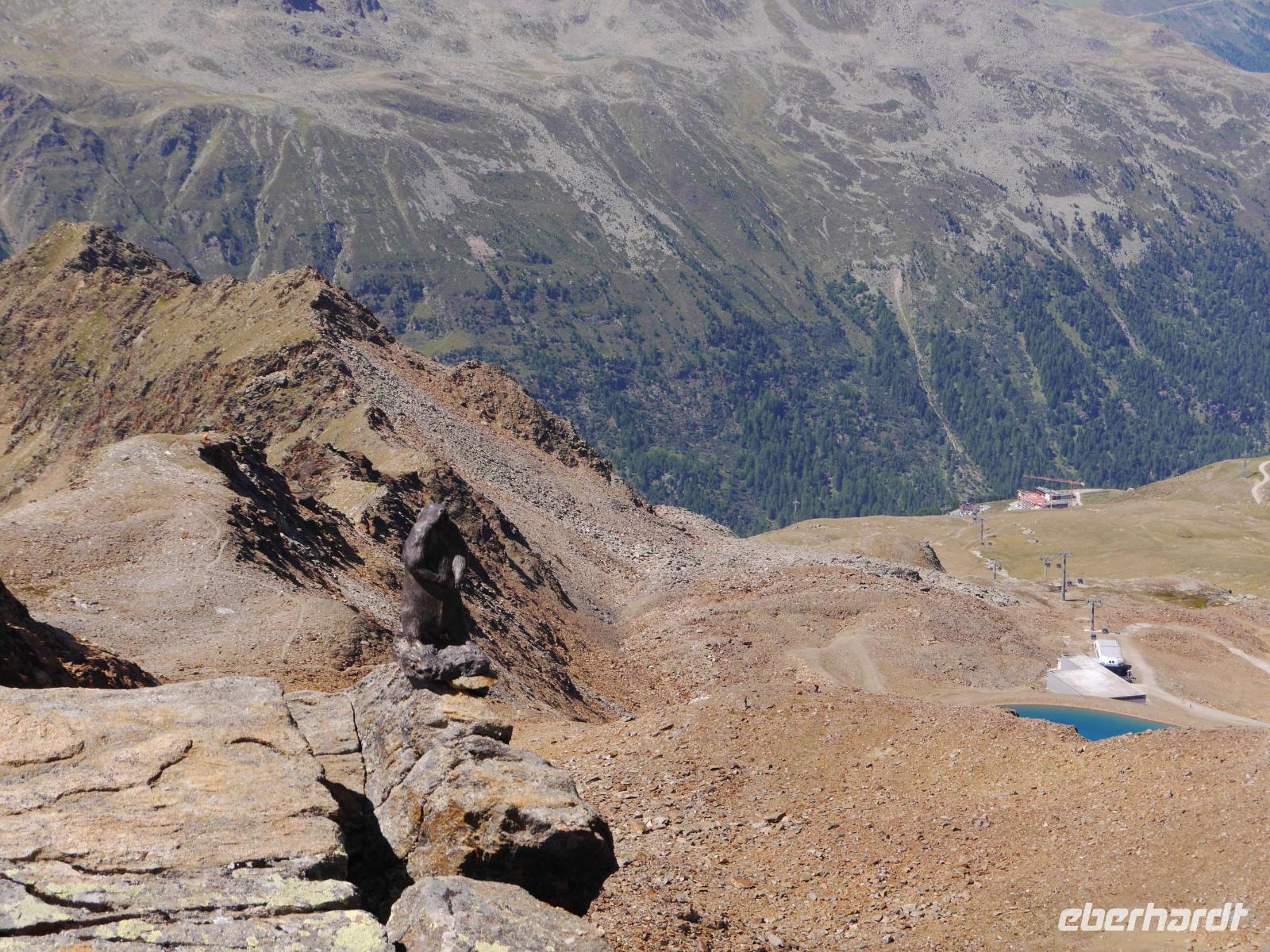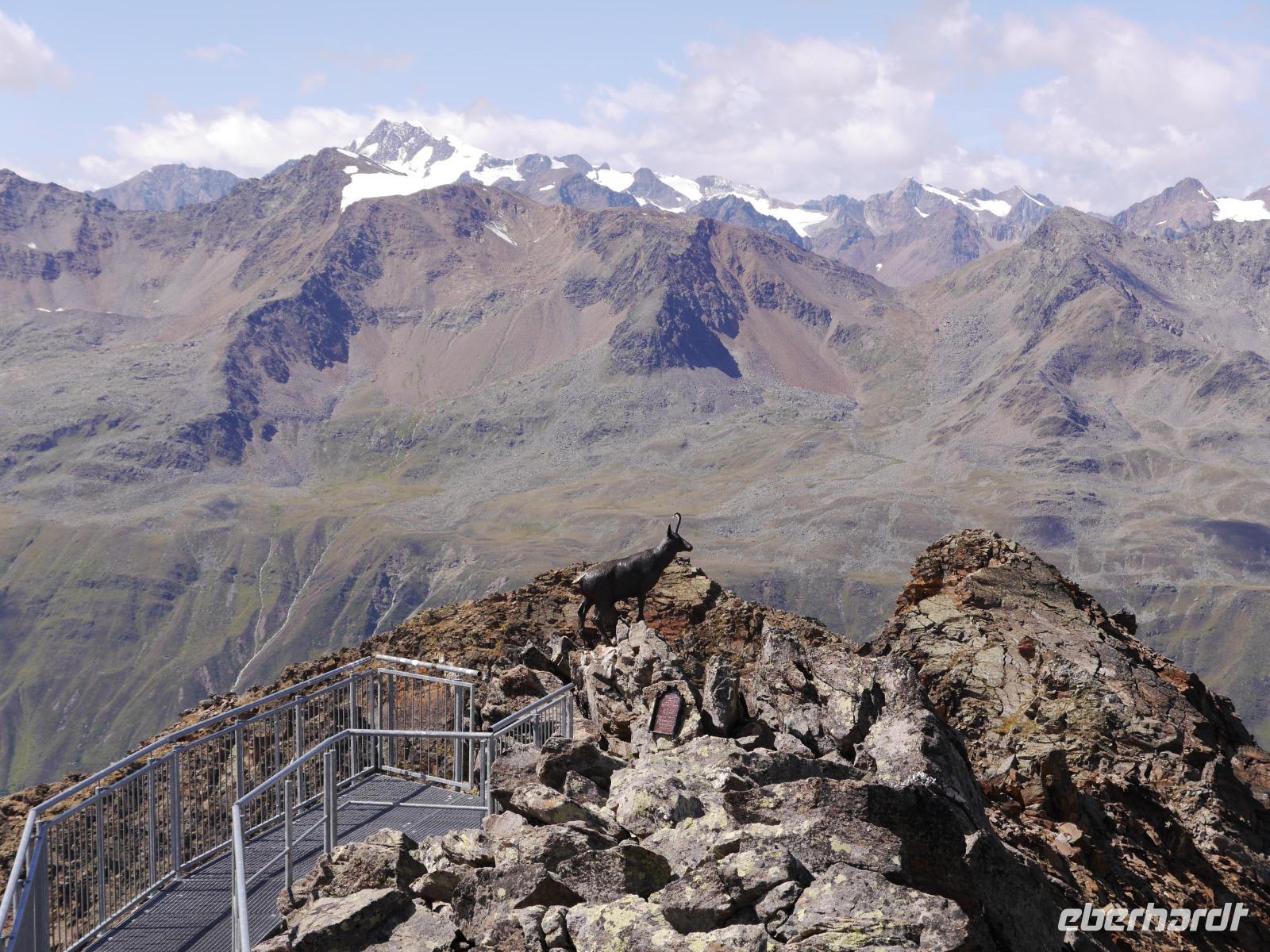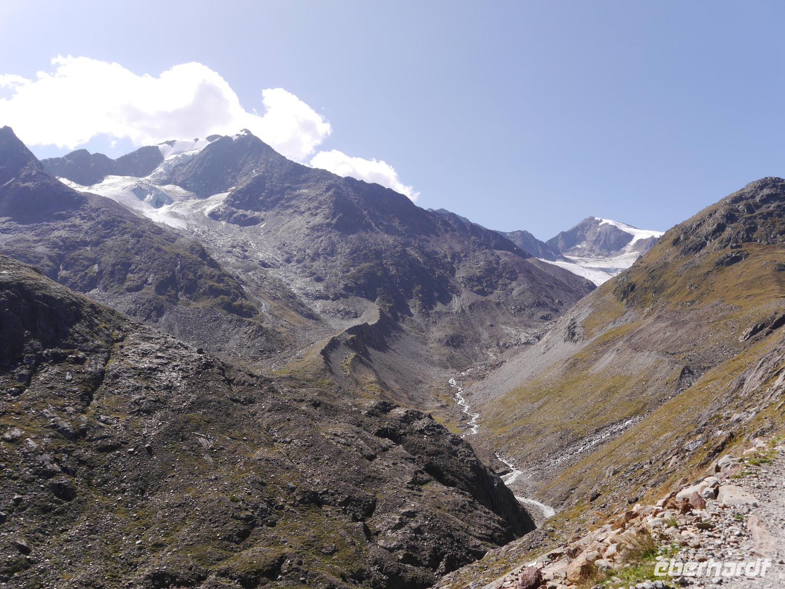 Die Belohnung war der fantastische Ausblick auf die Gurgler Schartl, den Grieskogel und das gegenüber liegende Königstal. Der Anblick der vergletscherten Dreitausender ließ den Alltag komplett ausschalten. Die Zeit schien still zu stehen, aber nur kurz, da der Wind zu kühl war, um eine längere Pause einzulegen.