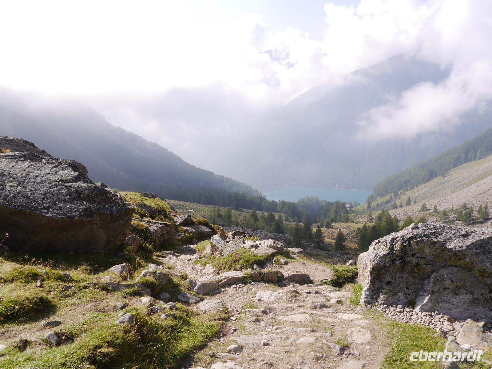 Da die Wolkenschicht locker bewölkt war, erblickten wir zum letzten Mal den majestätischen Similaun. Eine Gletscherzunge ist noch deutlich erkennbar. Je tiefer wir kamen tauchten wir in die Nebelschicht ein. Diese blieb jedoch nicht lange und auf alten Passwegen kamen wir ins Südtiroler Schnalstal bis zum Tisenhof auf 1.814 Höhenmeter. Dieser Bergbauernhof Tisenhof (von 1306) besteht aus 3 Gebäuden, diente auch als Jausenstation und wurde 1981 unter Denkmalschutz gestellt.