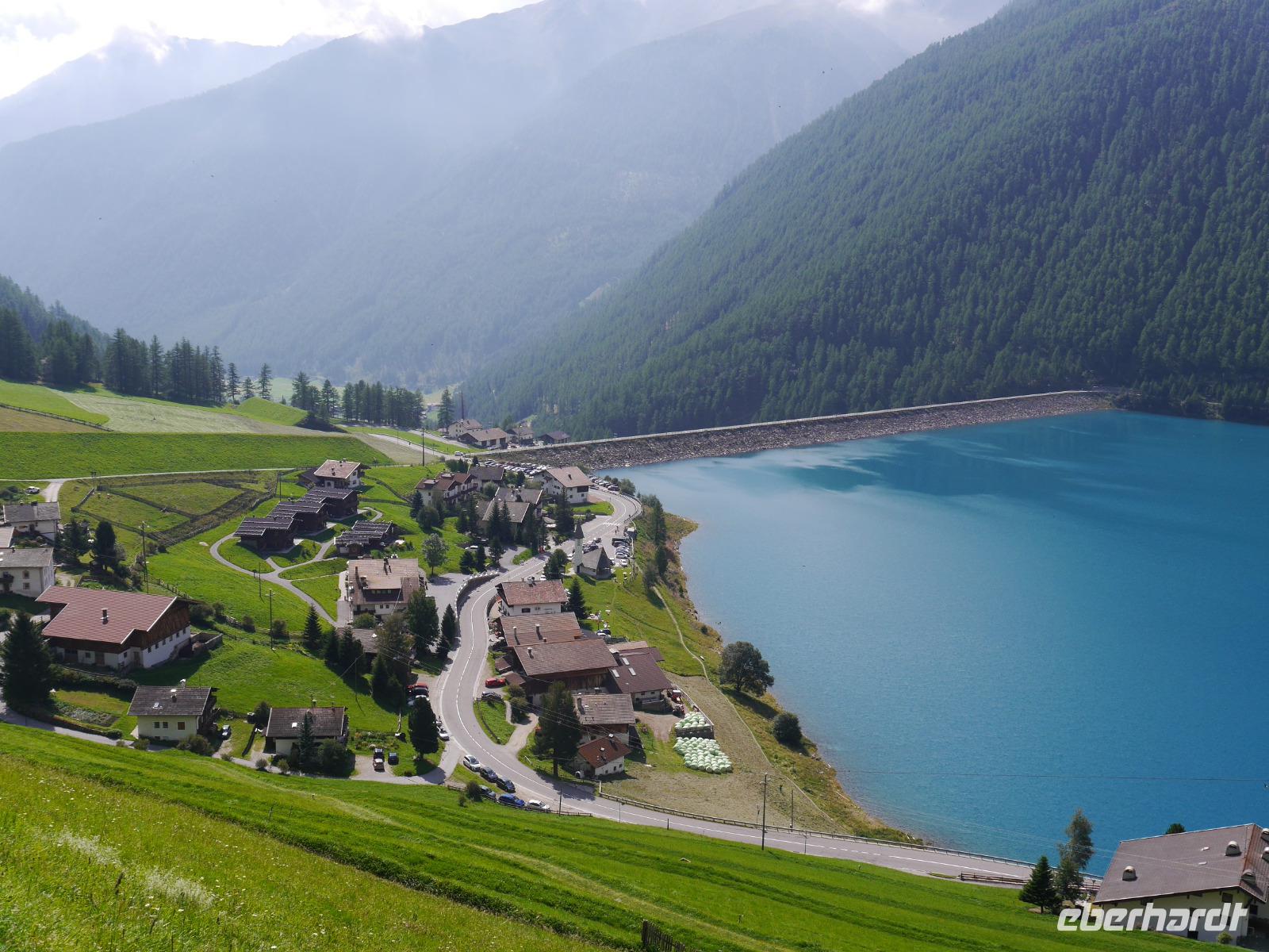 Im Stausee versanken acht Höfe des Dorfes Vernagt. Die Spitze des Kirchturms ragt bei Niedrigwasser aus dem See. Der Stausee erstand erst in den 1950 /1960iger Jahren