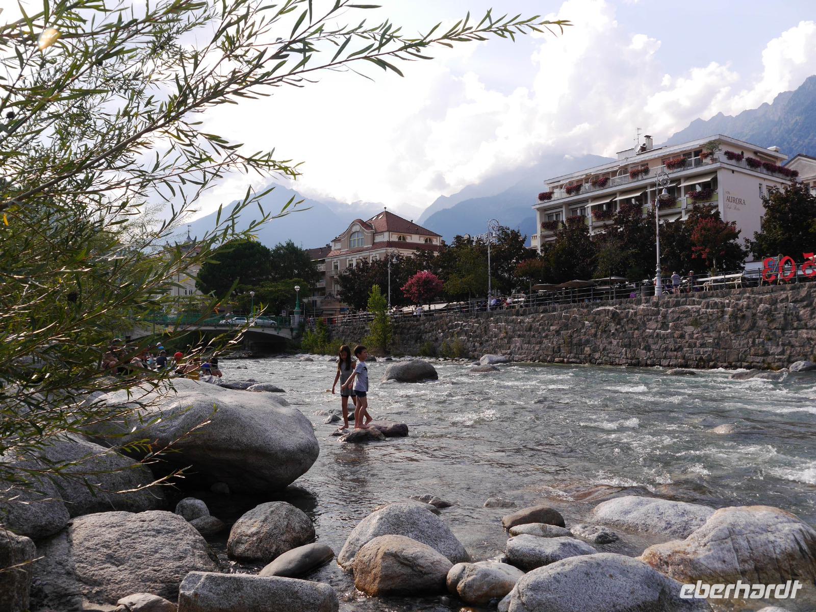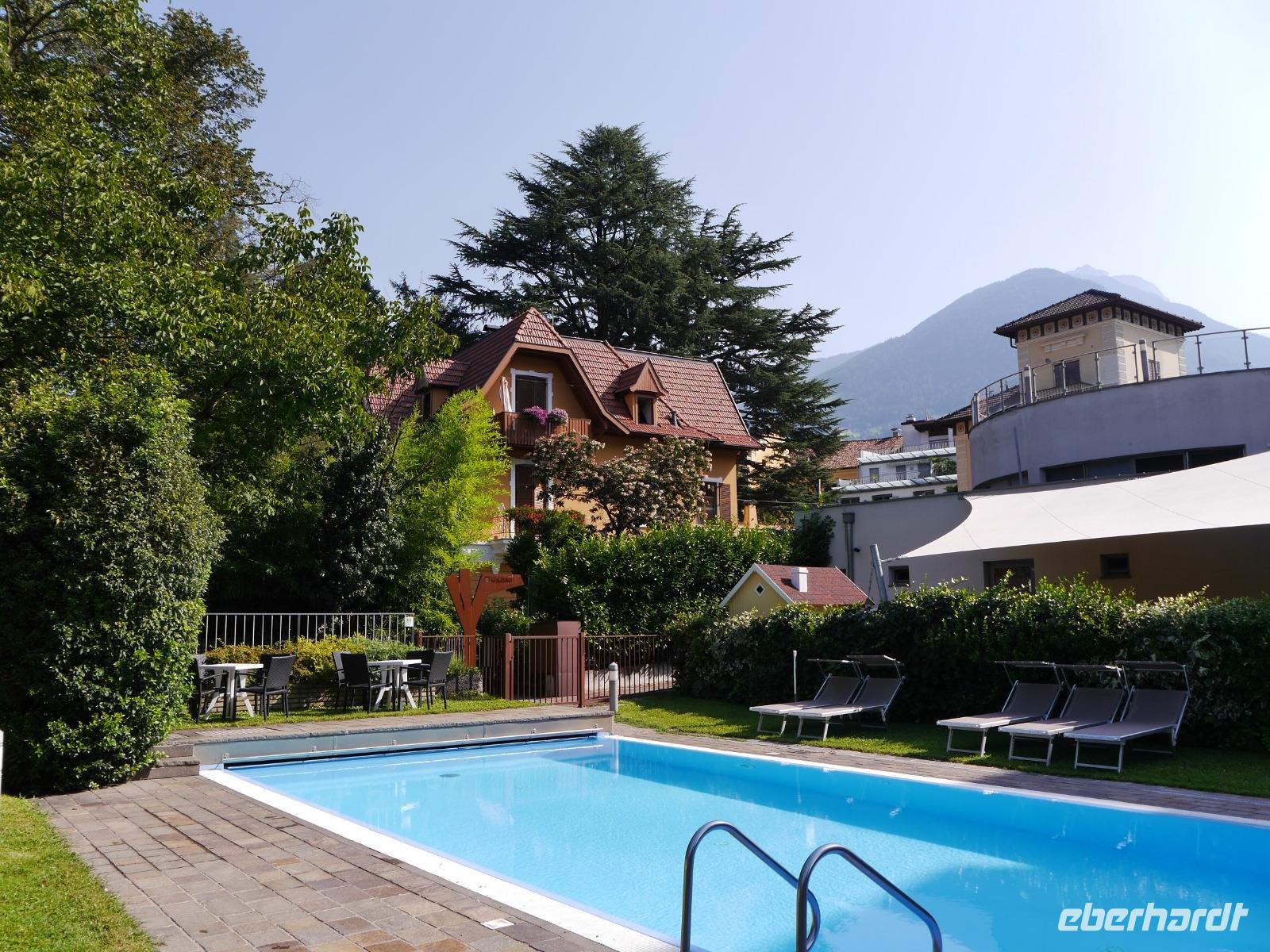 Mit dem Bus ging es von Vernagt nach Naturns zum Bahnhof und von dort war es nur ½ Stunde mit dem Zug nach Meran. Im Hotel Kolping standen unsere Koffer bereit und somit war unser Gepäck wieder vollständig. Einige Gäste nutzen auch den schönen Pool im Hotel zum Relaxen.