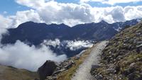 Dann entspannte sich die Lage, der Weg wurde breit und stetig ging es langsam bergauf. Durch einen Berg Rutsch konnten wir nur auf der gegenüber liegenden Talseite wandern, wodurch sich unser Weg um 1,5 km verlängerte.