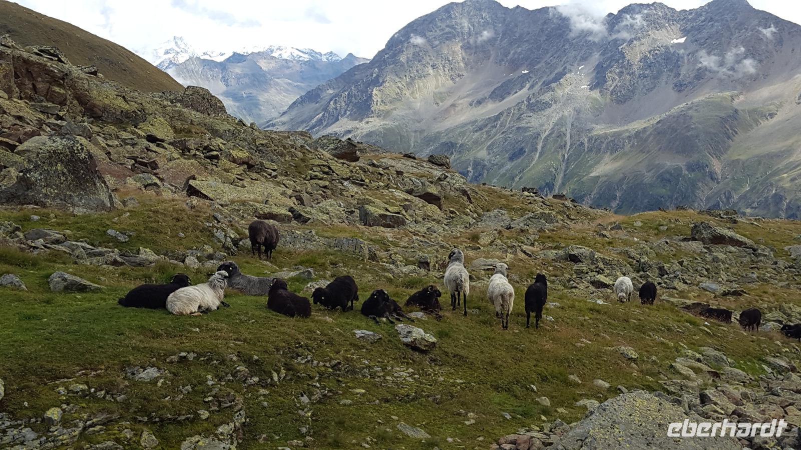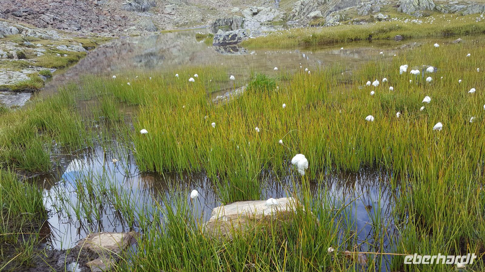Ein besonders schönes Plätzchen bestaunen wir am Weisseskar (2.656 m), wo sich ein Bergsee in eine Mulde schmiegt. Typisches Wollgras setzte Akzente in dieser kargen Gebirgswelt. Nach rund 4,5 Stunden Gehzeit kamen die Hotels im urigen Bergsteigerdorf Vent 1.900 m gerade recht, um den Energiehaushalt zu sanieren.
