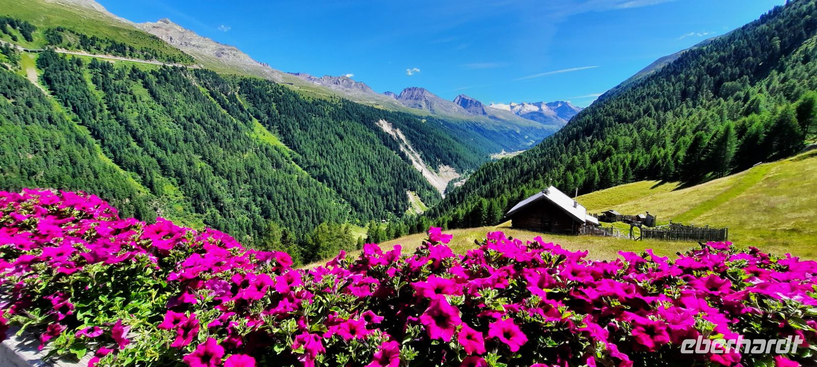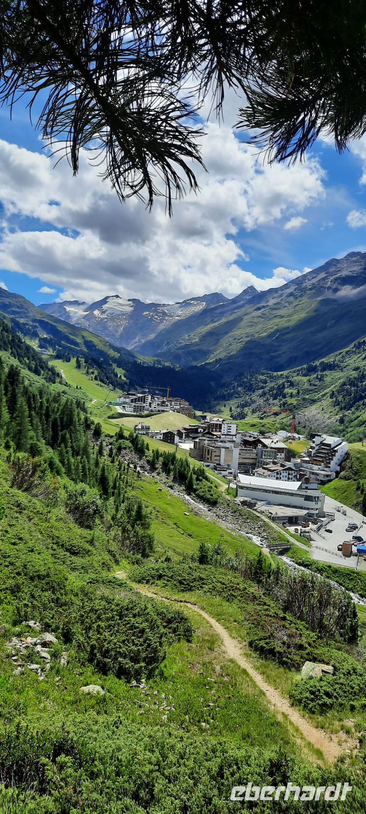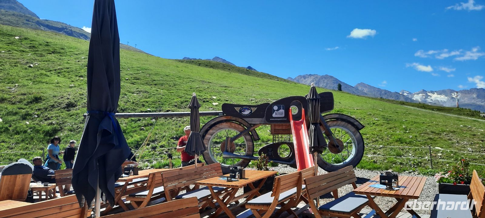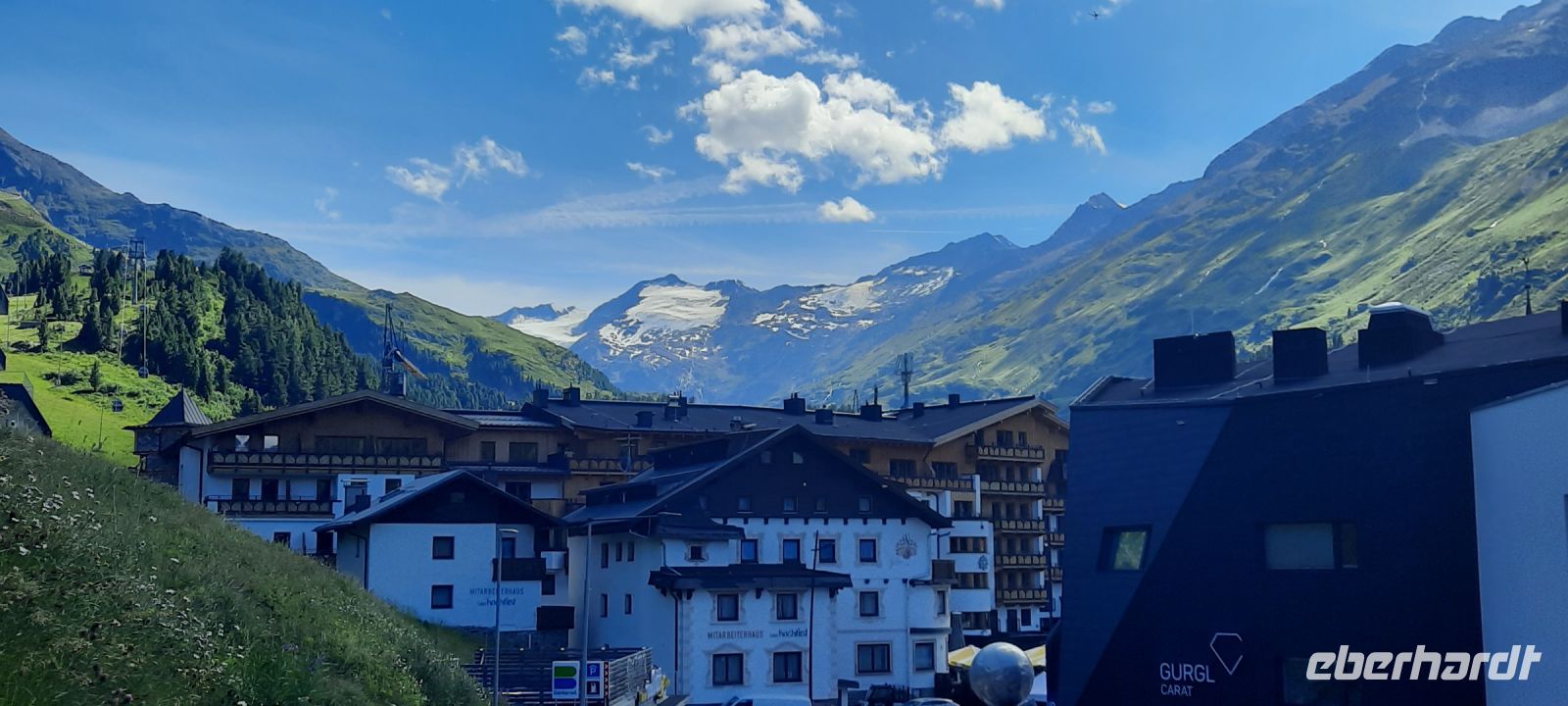 Mit dem Linienbus fuhren wir zur Mautstelle, die zum Timmelsjoch führt. Dort steht ein modernes Holzgebäude im alpenländischen Stil. Das TOP Mountain Motorcycle Museum ist Europas höchstgelegenes Motorradmuseum mit einzigartiger Sammlung historischer Motorräder. Mit wechselnden Ausstellungen, multimedialer Erlebniswelt, großem Restaurant mit Sonnenterrasse, ist es ein angenehmer Stopp für Biker, Radfahrer, Autofahrer und natürlich auch für Wanderer. Da an der Kirchenkarbahn Wartungsarbeiten stattfanden, konnten wir nicht bis zur Aussichtsplattform fahren. Wir folgten dem Wanderweg zum Hoteldorf Hochgurgel auf 2.150 Höhenmetern. An Almhütten und Wasserläufen vorbei, stiegen wir durch das Königjoch. Bei strahlend, blauem Himmel erreichten wir wieder die Baumgrenze und folgten dem Pfand nach Obergurgl. Lärchen, Fichten, Alpenrose, Küchenschelle, Steinbrechgewächse etc. bildeten ein abwechslungsreiches Alpenpanorama.