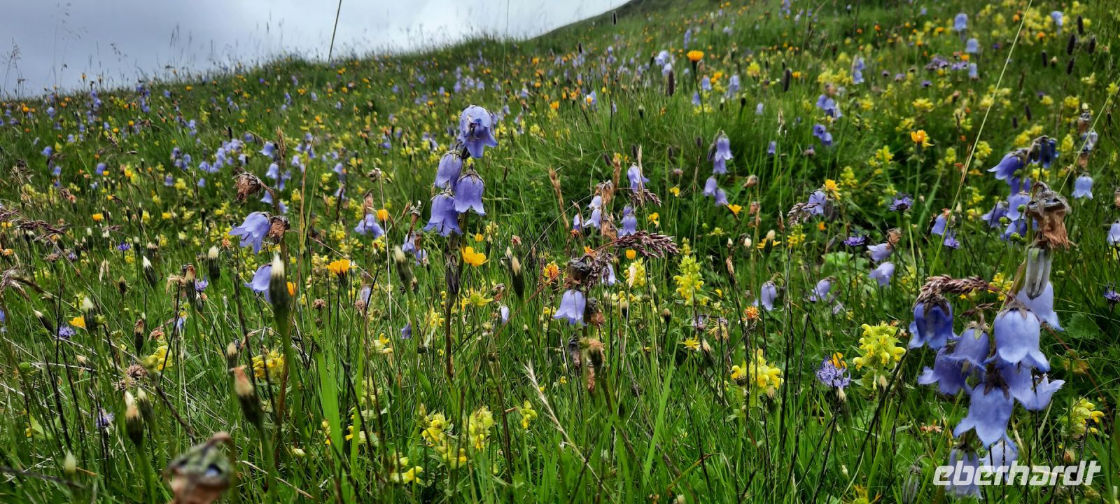 Leider konnten wir die Berge nur erahnen, da die Wolken sehr tief hingen. Da es etwas rutschig war, erforderte der Abstieg zur Schönwieshütte volle Konzentration.
