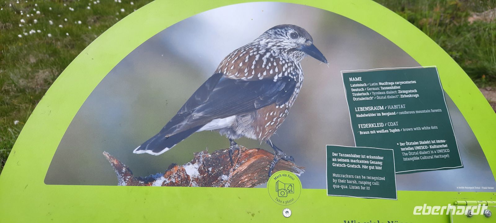 Jahre alten Zirben Wald, der vom Land Tirol als Naturdenkmal gekennzeichnet wird. An Hand von Schautafeln wurde uns die enge Lebensgemeinschaft von Zirbe und Tannenhäher erläutert. Er holt mit seinem kräftigen Schnabel die Samen aus den Zirbenzapfen heraus und legt Vorratsverstecke an. Sogar die spektakuläre Notlandung von Auguste Piccard lauschten wir an einer Autio Bank mit Blick auf den Gurgler Gletscher. Denn durch Auguste Piccard wurde der Ort Obergurgl über Nacht bekannt. Anfang der 1930iger Jahre ging es dann richtig mit dem Wintertourismus los.