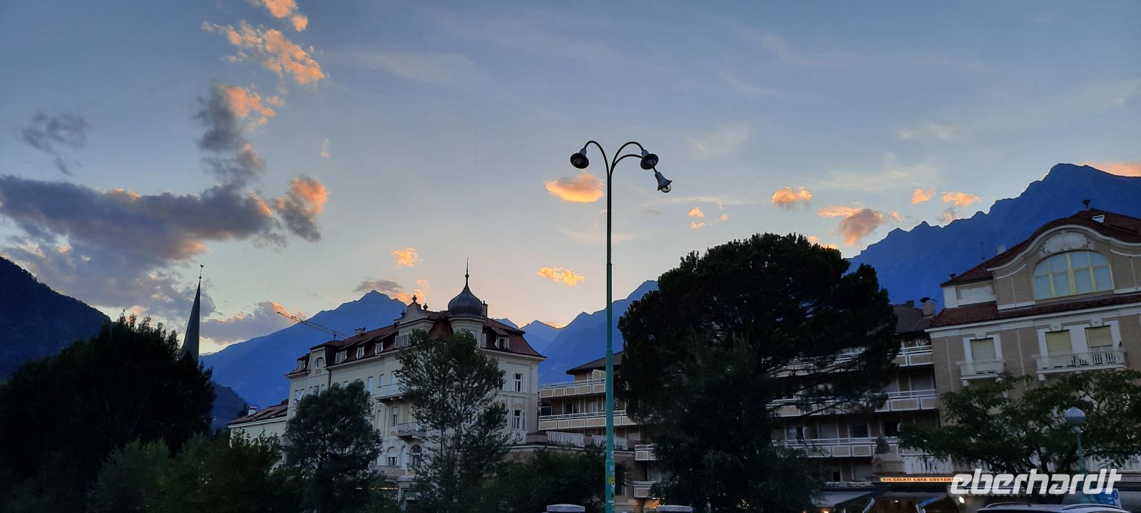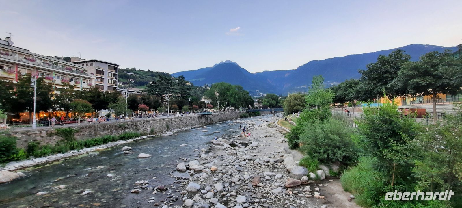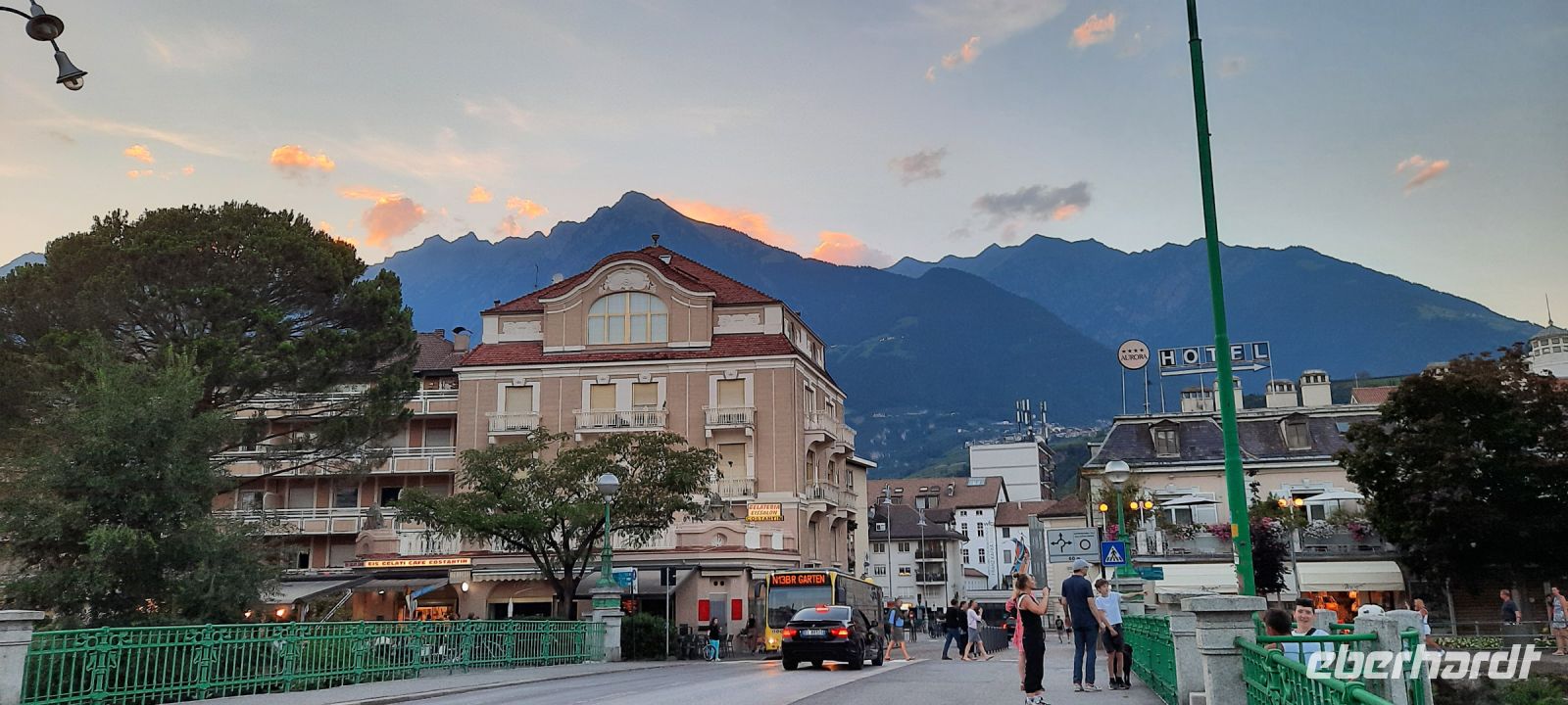 Mit dem Bus ging es von Vernagt nach Naturns zum Bahnhof und von dort war es nur ½ Stunde mit dem Zug nach Meran. Im Hotel Europa Splendid standen unsere Koffer bereit und somit war unser Gepäck wieder vollständig. Am Nachmittag war Zeit für einen entspannten Spaziergang durch die charmante Altstadt von Meran. Nach unserem vorzüglichen Abendessen im Hotel folgte ein Gläschen Wein, aber an einem speziellen Platz in Meran. Es war die begehbare Uferpromenade der Passer, die erfrischend durch die Kurstadt plätschert. Mit beeindruckendem Bergpanorama rings herum schmeckte uns genüsslich der Wein und ein erlebnisreicher Tag ging dem Ende entgegen.