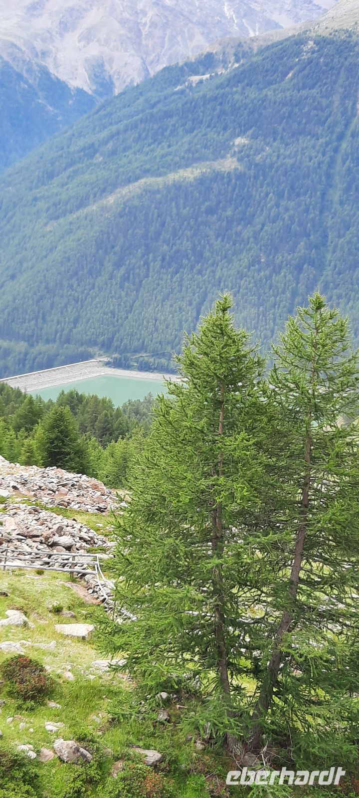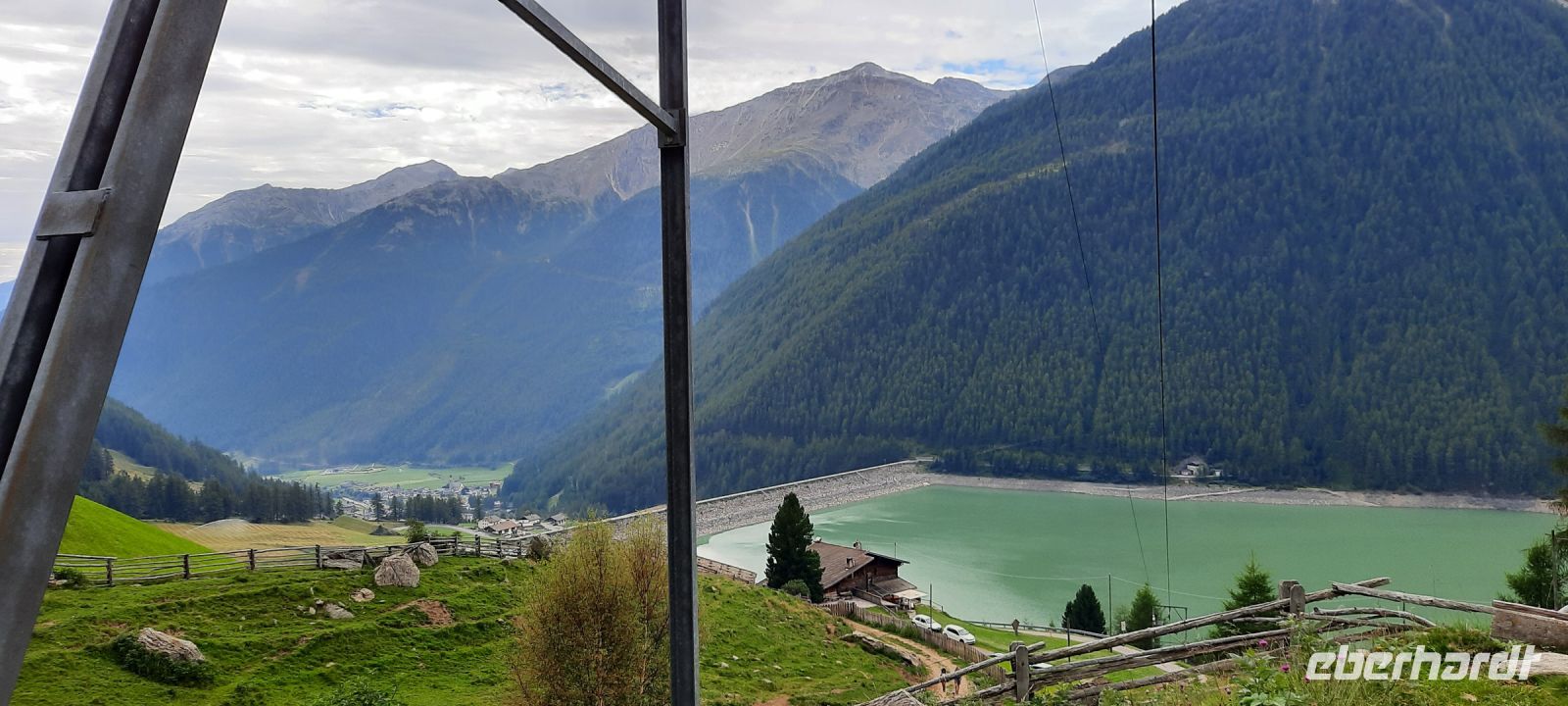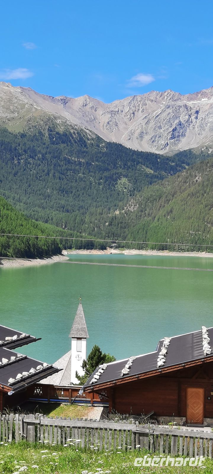 Im Stausee versanken acht Höfe des Dorfes Vernagt. Die Spitze des Kirchturms ragt bei Niedrigwasser aus dem See. Der Stausee erstand erst in den 1950 /1960iger Jahren