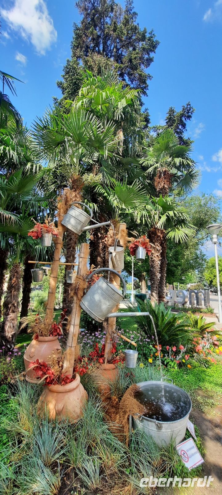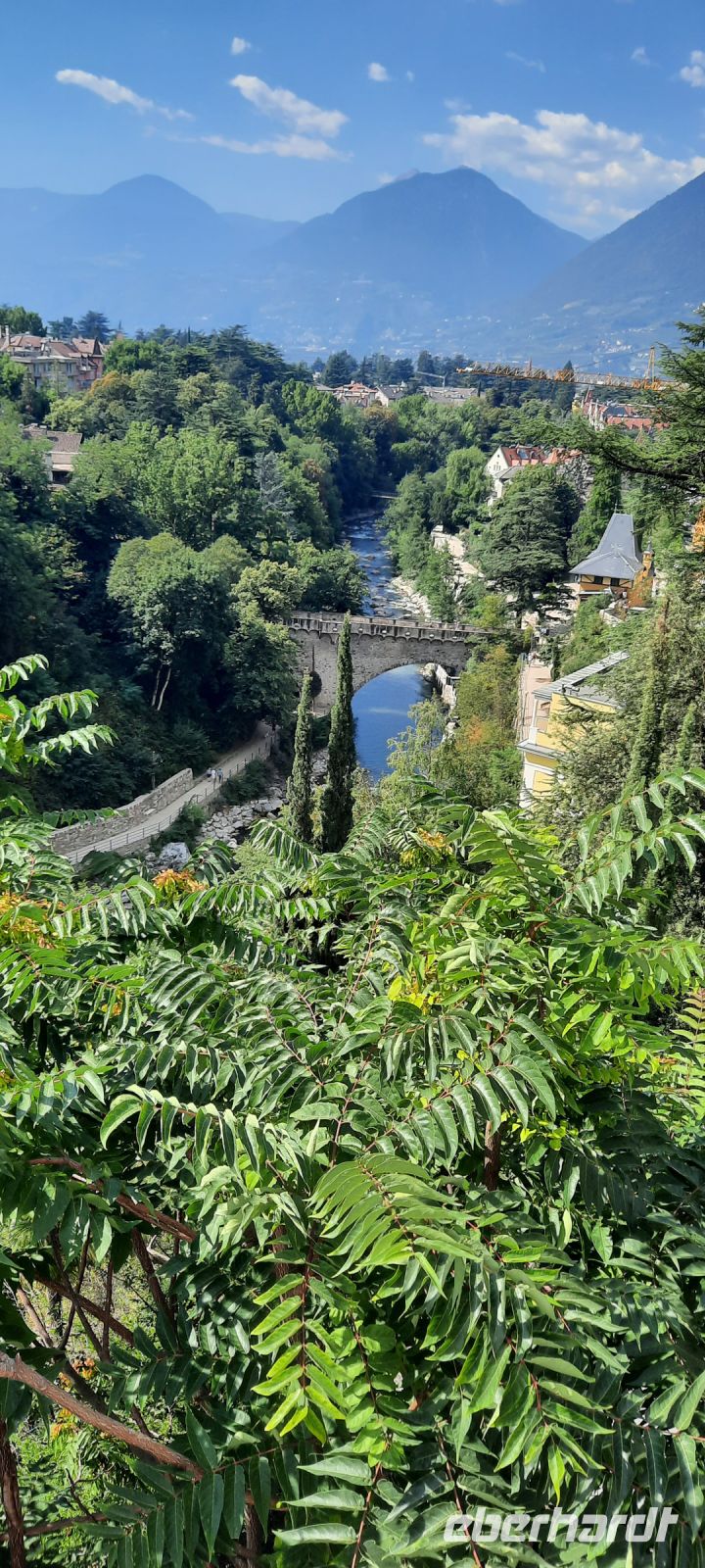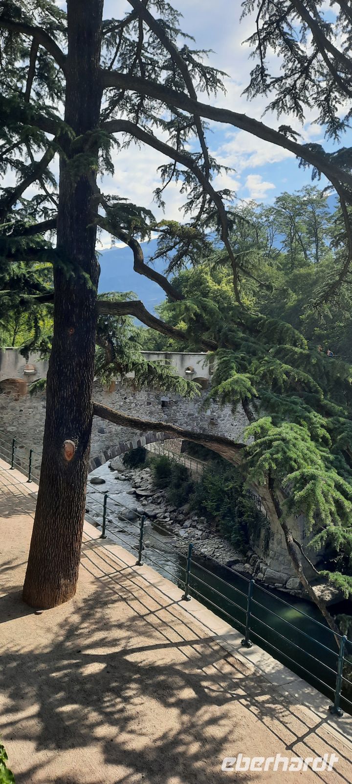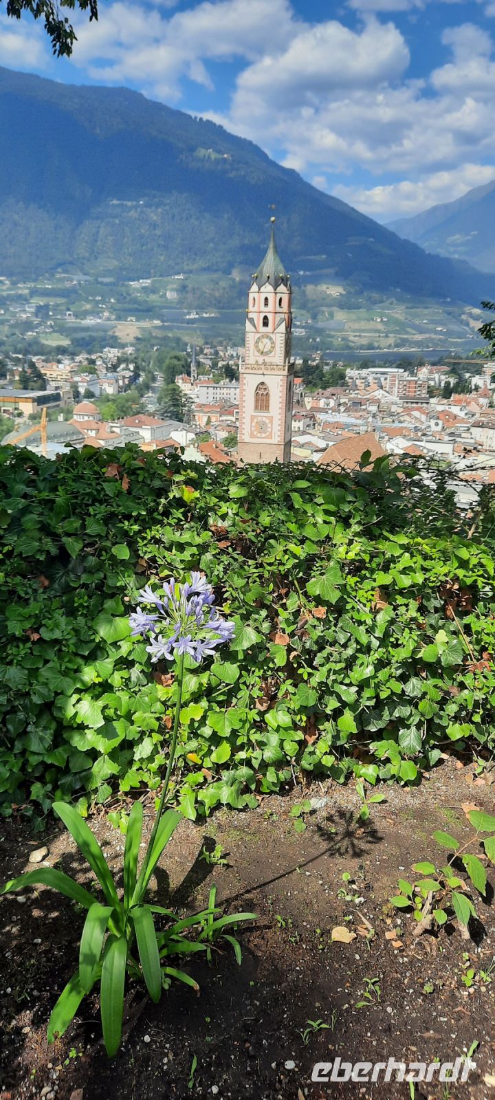 Der Vormittag stand unter dem Zeichen der 1 km langen Gilfpromenade, die aus der Gilfschlucht heraus stetig bergauf zum Pulverturm führte. Dieser markierte den Beginn des Tappeinerweg. Die subtropische Vegetation kann sich hier am sonnenverwöhnten felsigen Hang besonders gut entwickeln. Der Botaniker und Arzt Dr. Franz Tappeiner gab die Idee für die 6 km (hin und zurück) lange Höhenpromenade, die 1893 offiziell eröffnet wurde. Heute befindet sich am Fuße der Texelgruppe ein Mix aus alpinen und mediterranen Pflanzen. Entlang des Weges wachsen Kroaten Tanne, Pinien, Buntnessel, Oleander, Schmucklilie (Agapanthus), Magnolien, Agaven und Aloen, um nur einige zu nennen.