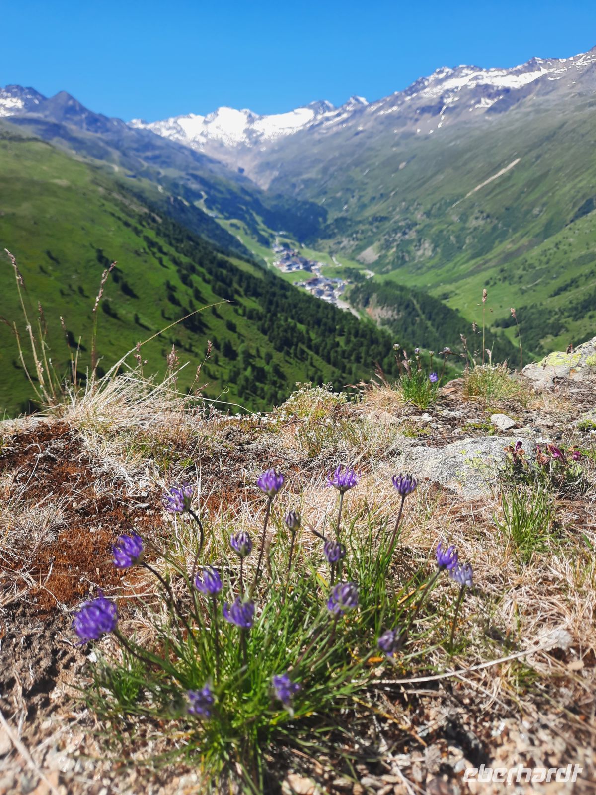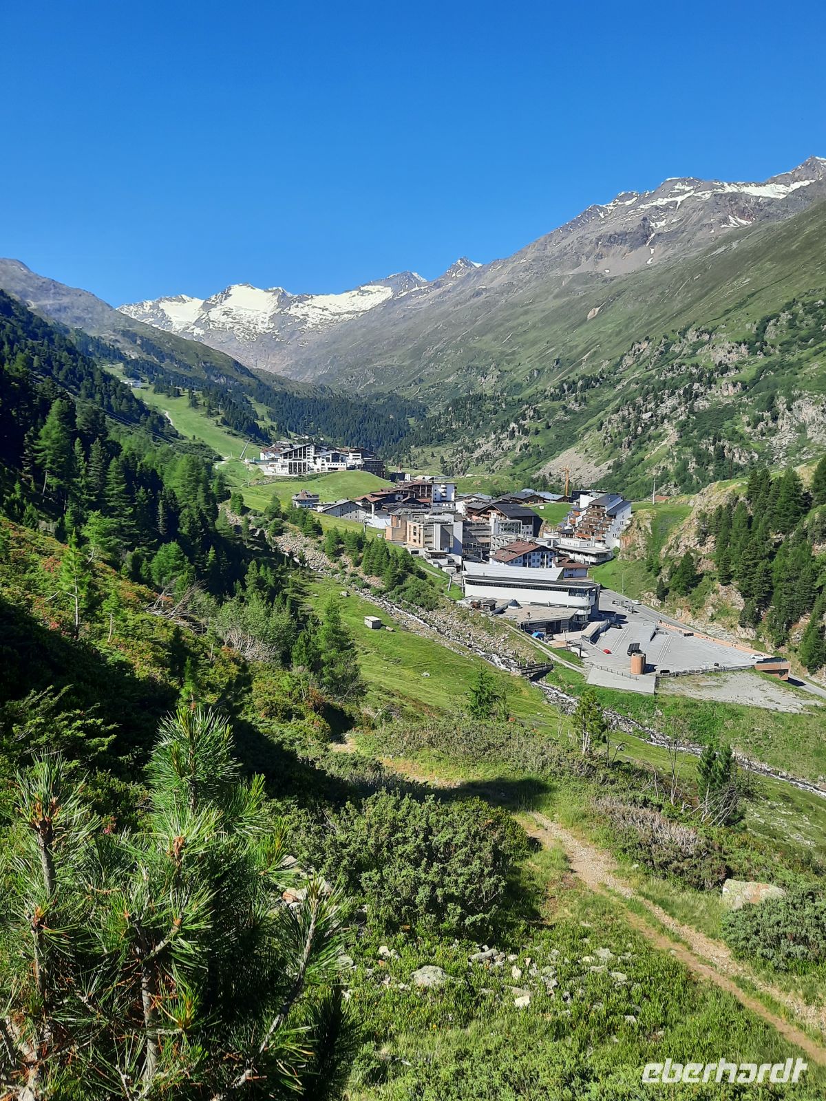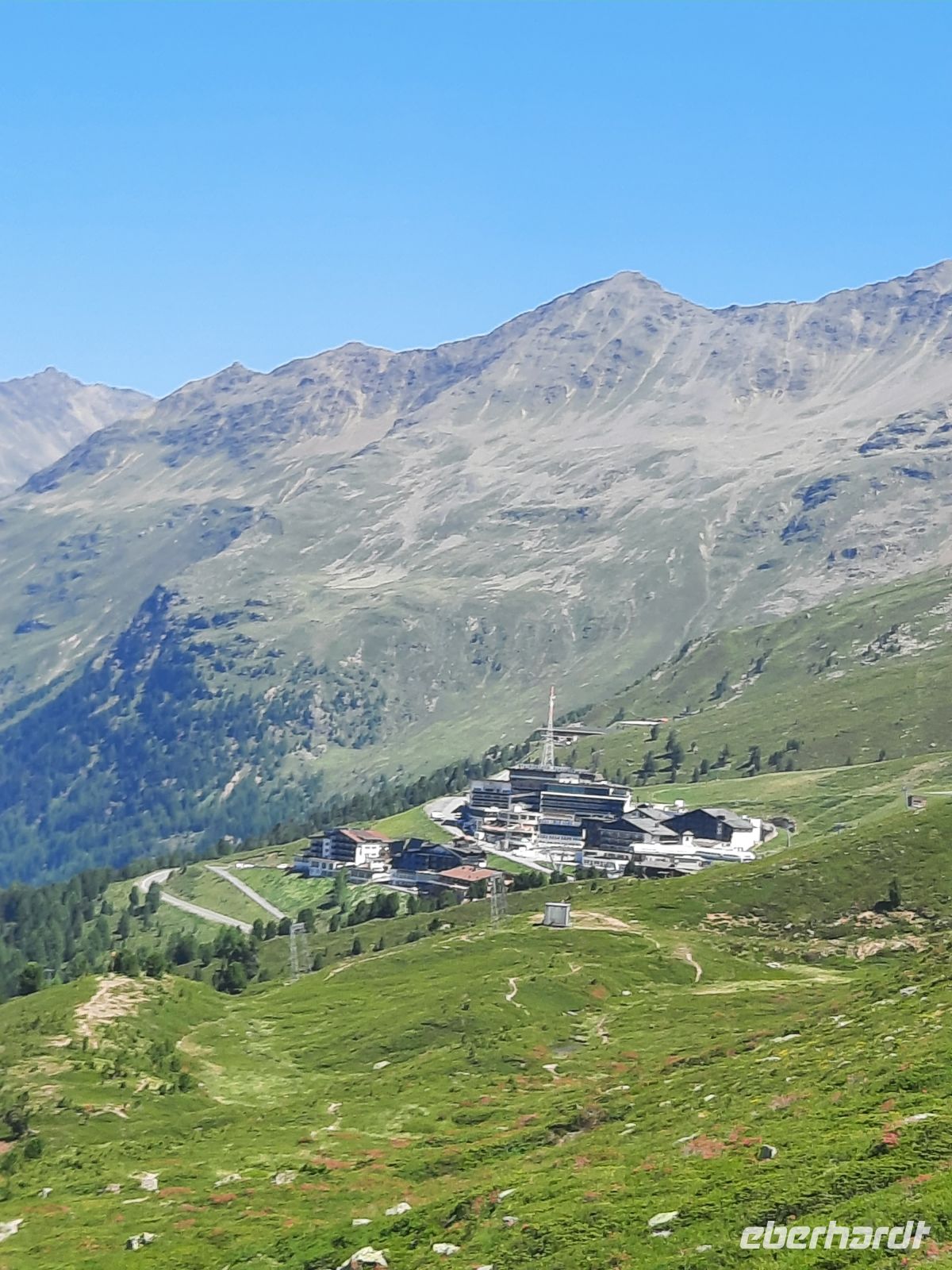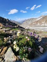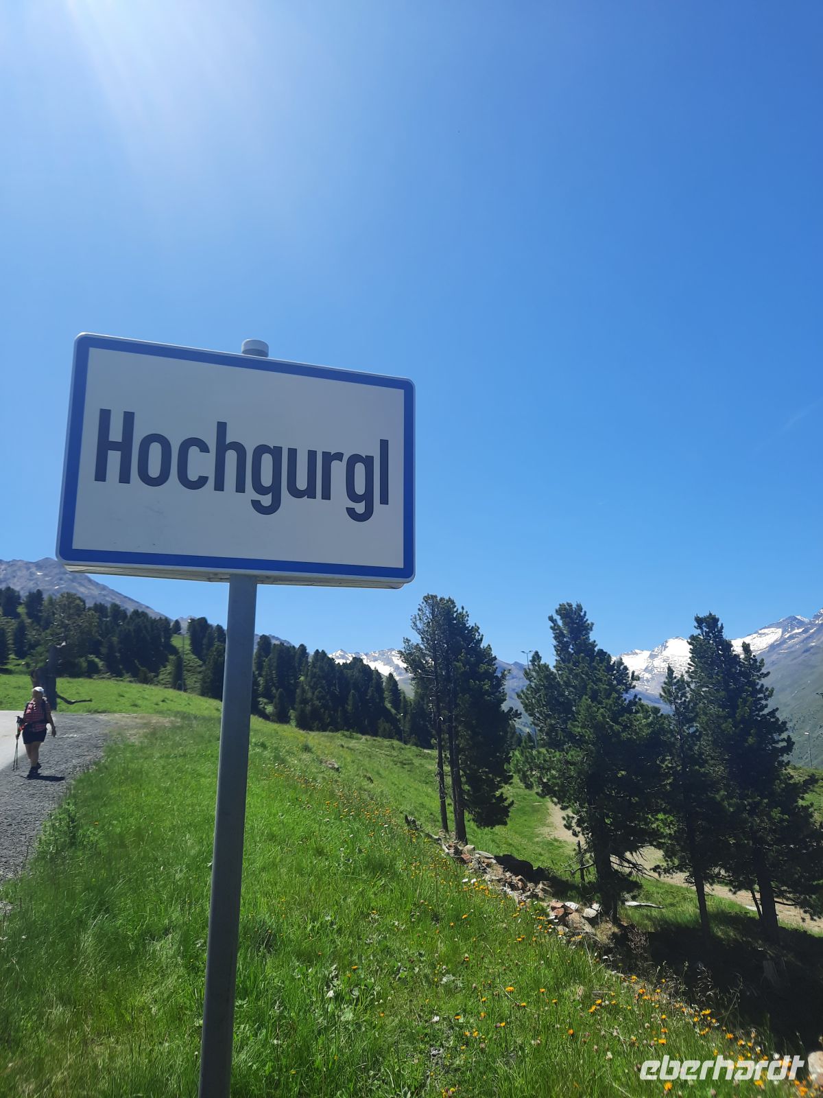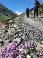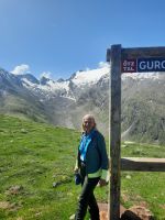 Da an der Kirchenkarbahn Wartungsarbeiten stattfanden, konnten wir nicht bis zur Aussichtsplattform fahren. Wir folgten dem Wanderweg zum Hoteldorf Hochgurgel auf 2.150 Höhenmetern. An Almhütten und Wasserläufen vorbei, stiegen wir durch das Königjoch. Bei strahlend, blauem Himmel erreichten wir wieder die Baumgrenze und folgten dem Pfand nach Hochgurgl. Lärchen, Fichten, Alpenrose, Küchenschelle, Steinbrechgewächse etc. bildeten ein abwechslungsreiches Alpenpanorama. Der Anstieg erfolgte über die Timmelsjoch Straße, die uns zum Linienbus führte.