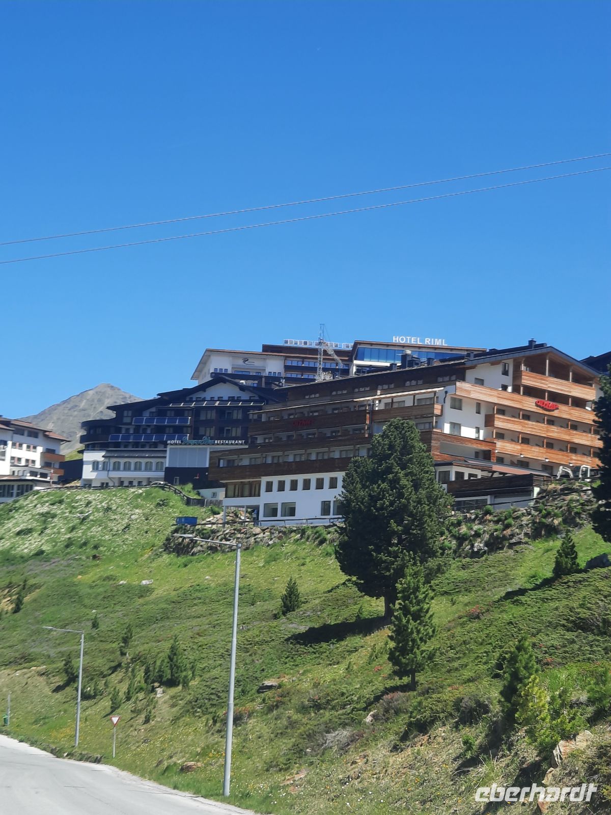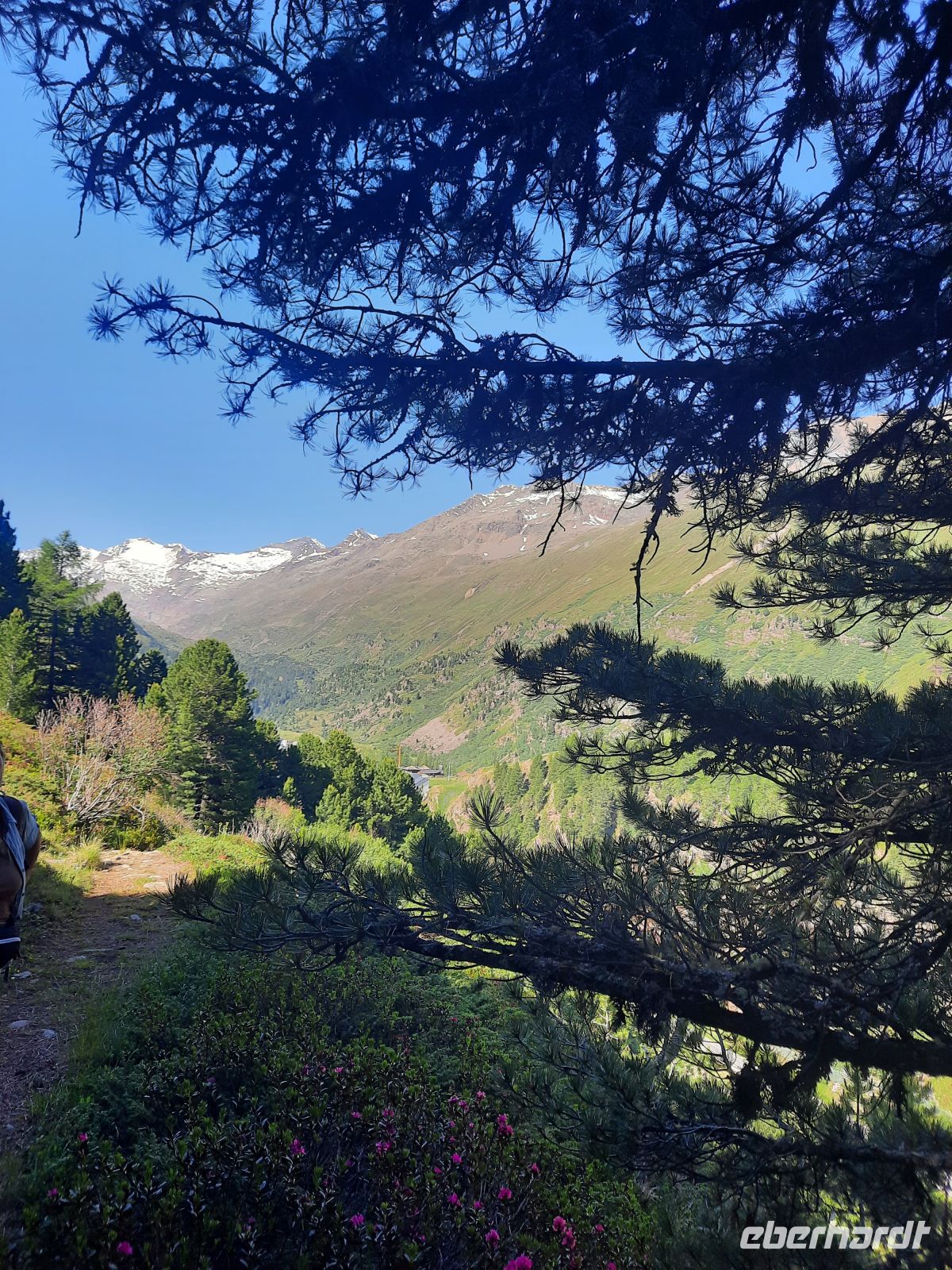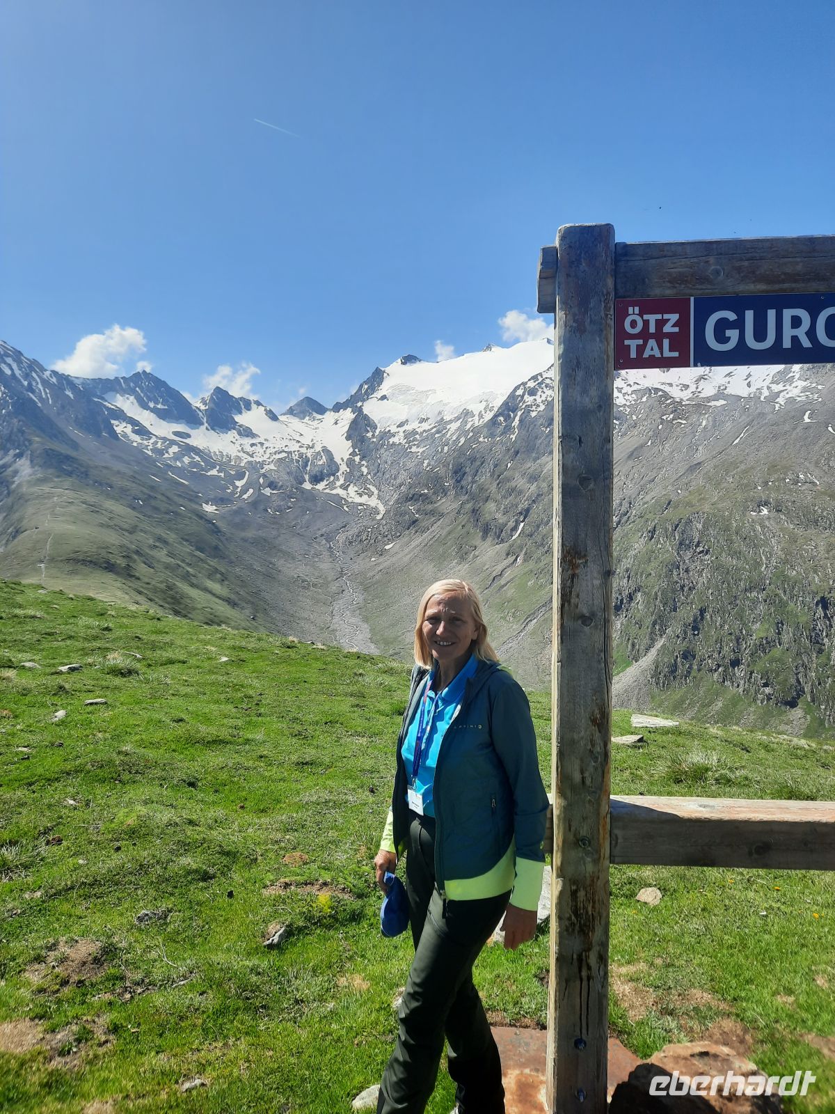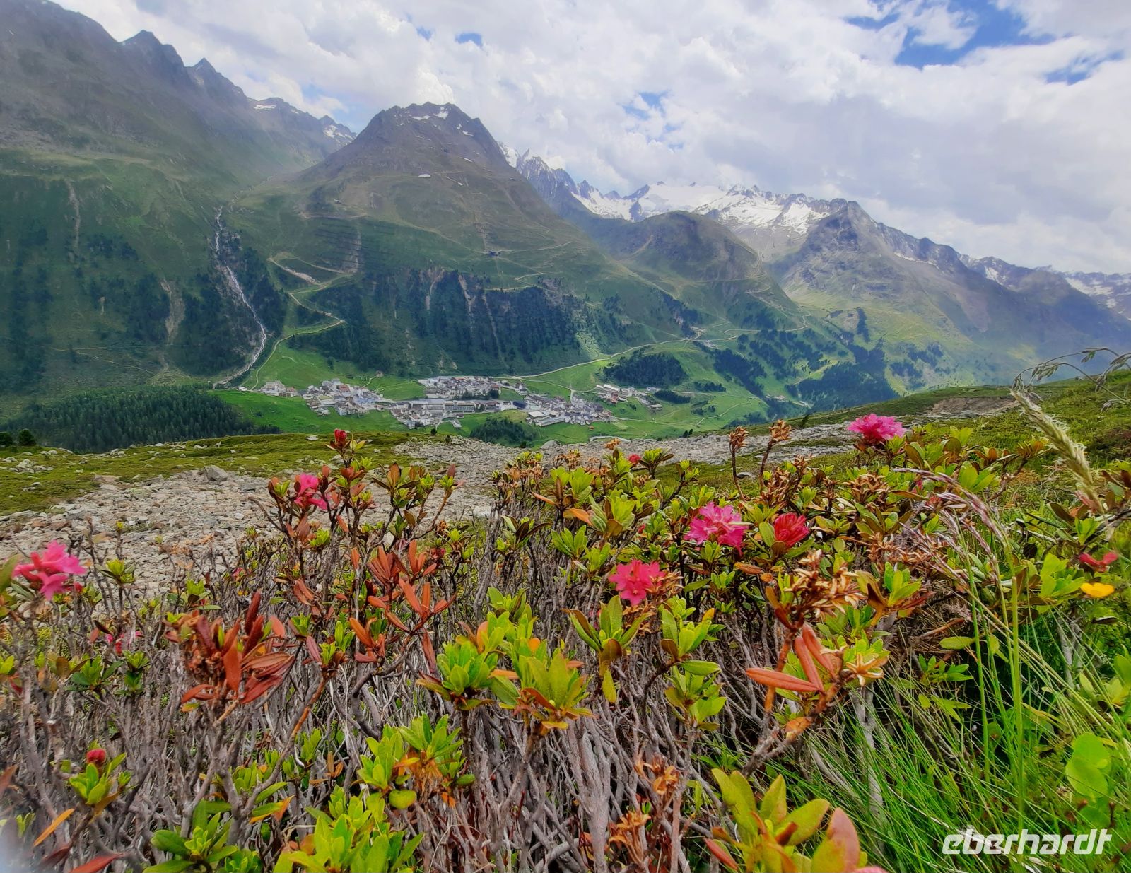 Da an der Kirchenkarbahn Wartungsarbeiten stattfanden, konnten wir nicht bis zur Aussichtsplattform fahren. Wir folgten dem Wanderweg zum Hoteldorf Hochgurgel auf 2.150 Höhenmetern. An Almhütten und Wasserläufen vorbei, stiegen wir durch das Königjoch. Bei strahlend, blauem Himmel erreichten wir wieder die Baumgrenze und folgten dem Pfand nach Hochgurgl. Lärchen, Fichten, Alpenrose, Küchenschelle, Steinbrechgewächse etc. bildeten ein abwechslungsreiches Alpenpanorama. Der Anstieg erfolgte über die Timmelsjoch Straße, die uns zum Linienbus führte.