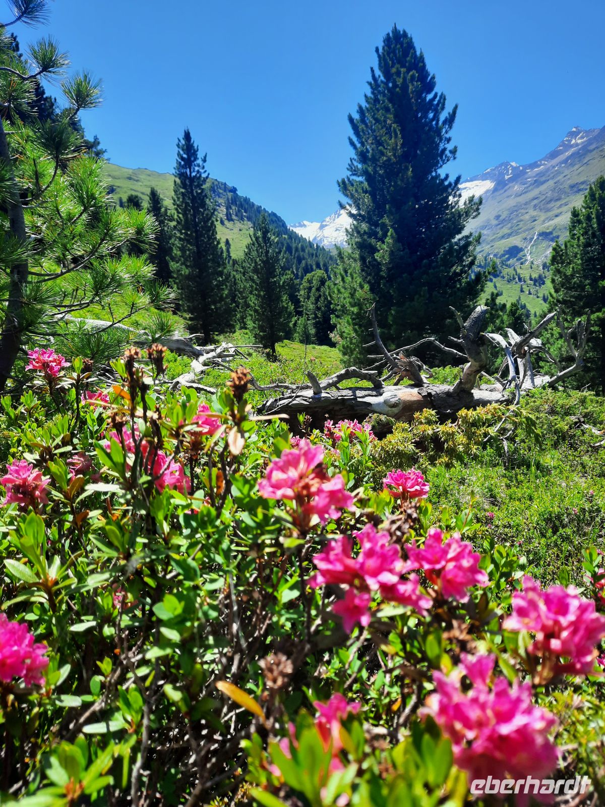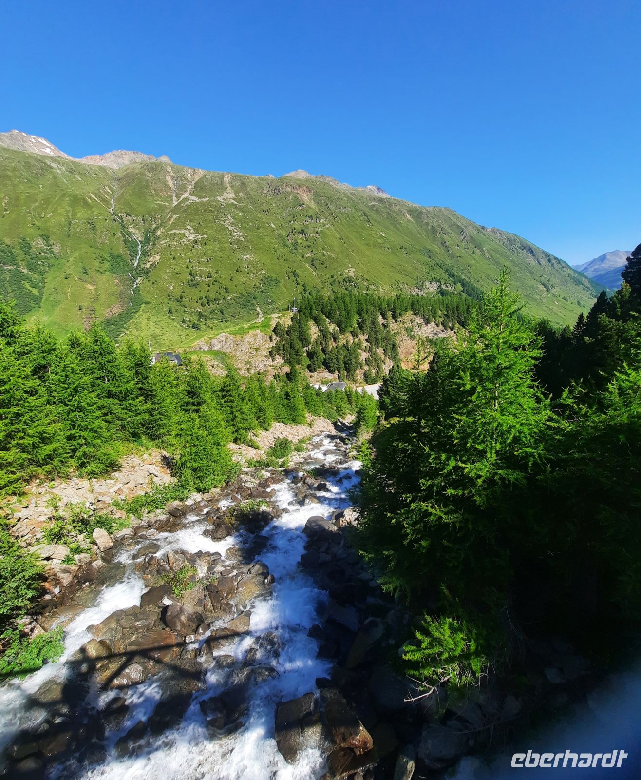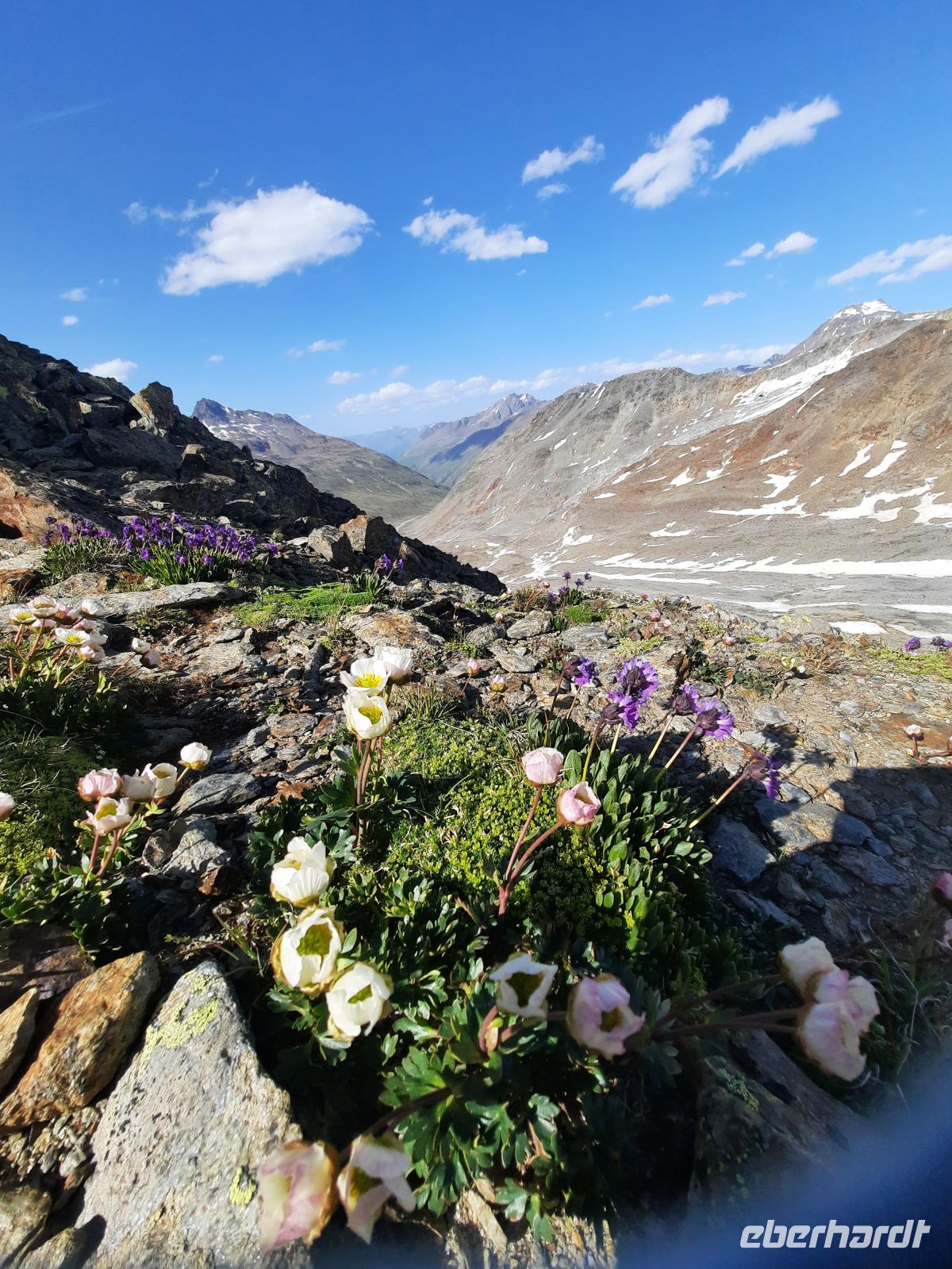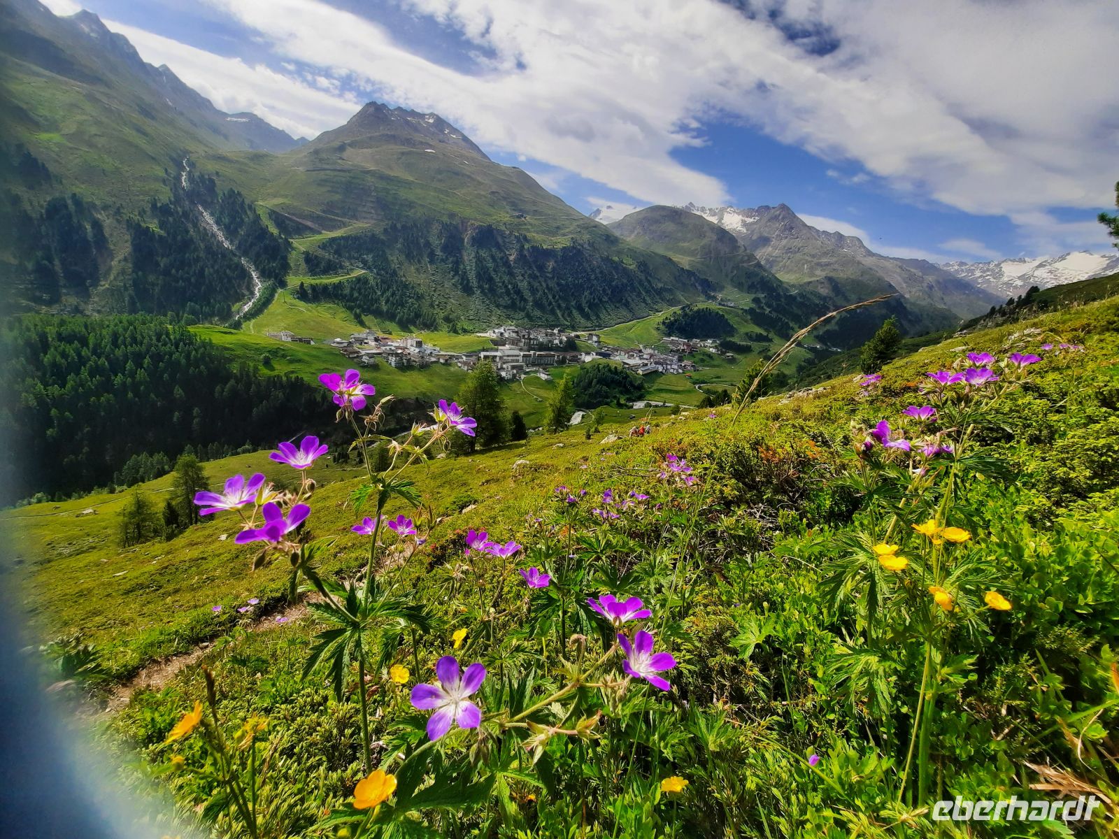 Da an der Kirchenkarbahn Wartungsarbeiten stattfanden, konnten wir nicht bis zur Aussichtsplattform fahren. Wir folgten dem Wanderweg zum Hoteldorf Hochgurgel auf 2.150 Höhenmetern. An Almhütten und Wasserläufen vorbei, stiegen wir durch das Königjoch. Bei strahlend, blauem Himmel erreichten wir wieder die Baumgrenze und folgten dem Pfand nach Hochgurgl. Lärchen, Fichten, Alpenrose, Küchenschelle, Steinbrechgewächse etc. bildeten ein abwechslungsreiches Alpenpanorama. Der Anstieg erfolgte über die Timmelsjoch Straße, die uns zum Linienbus führte.