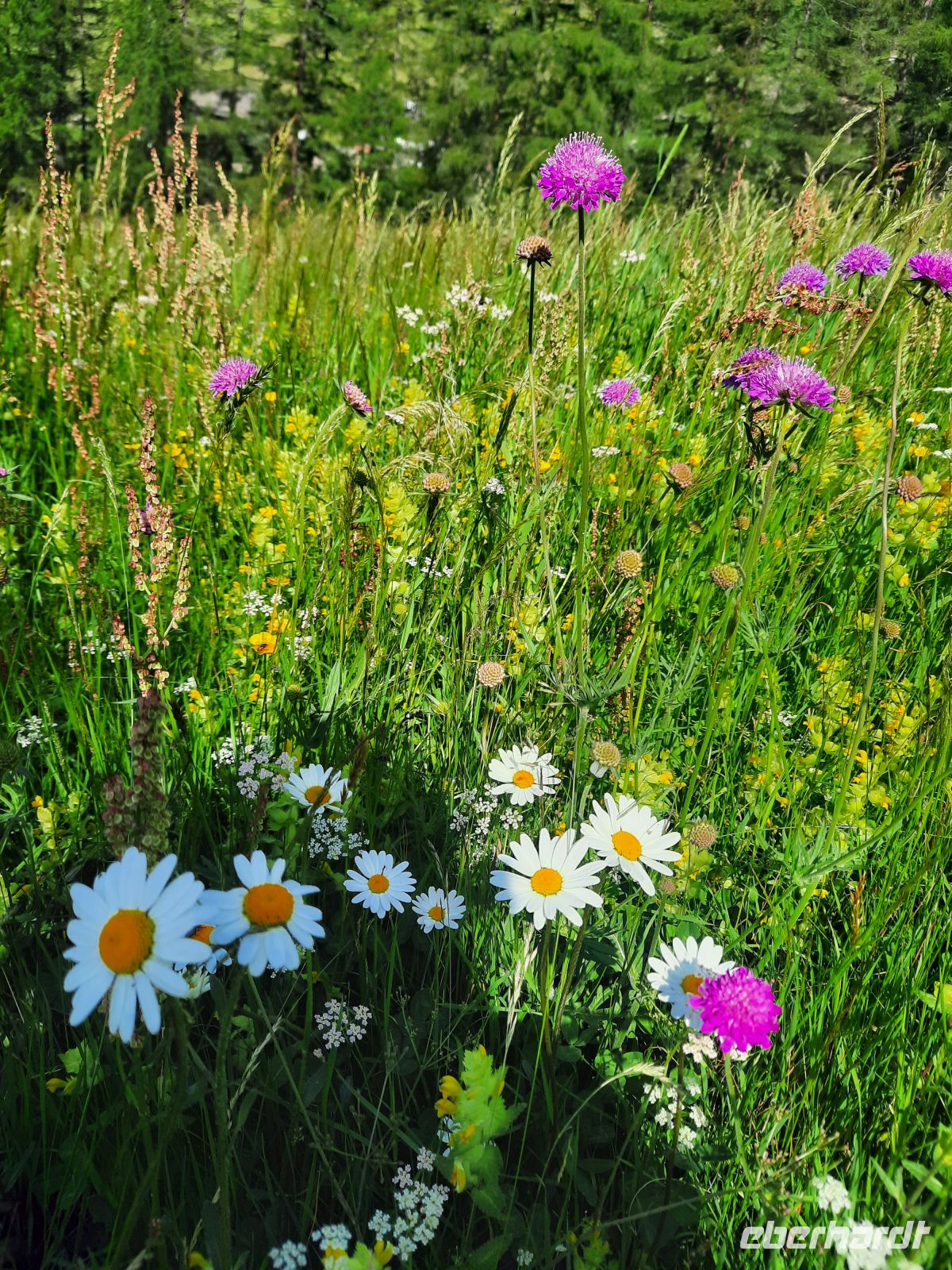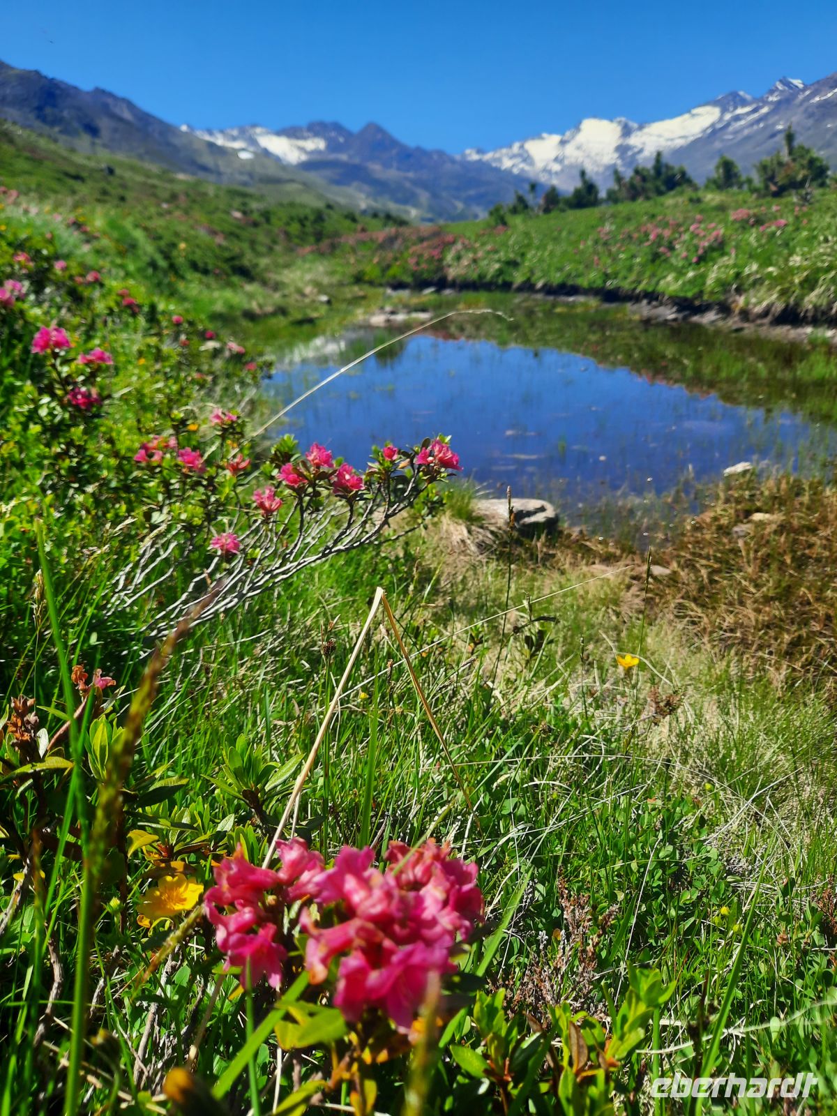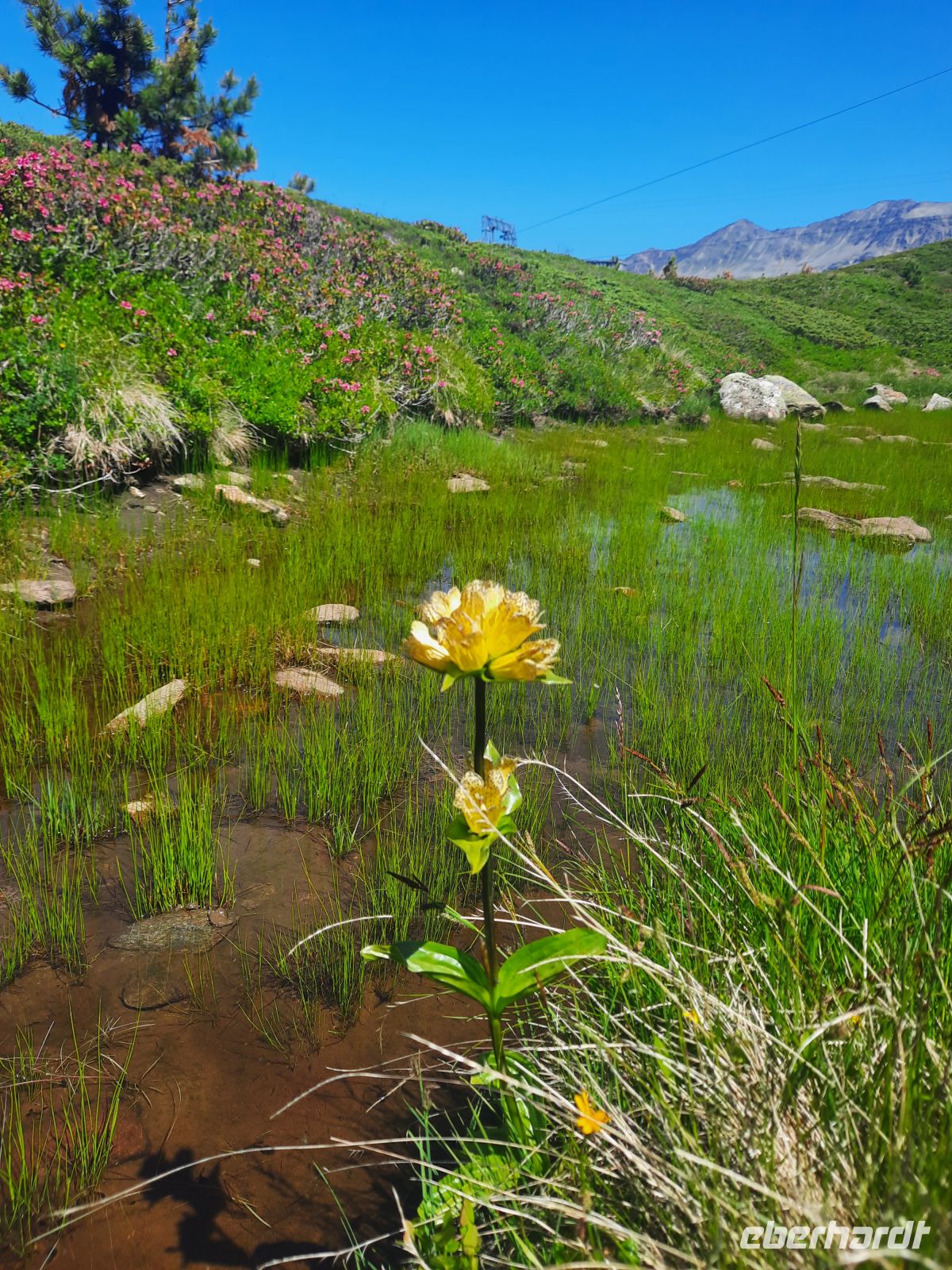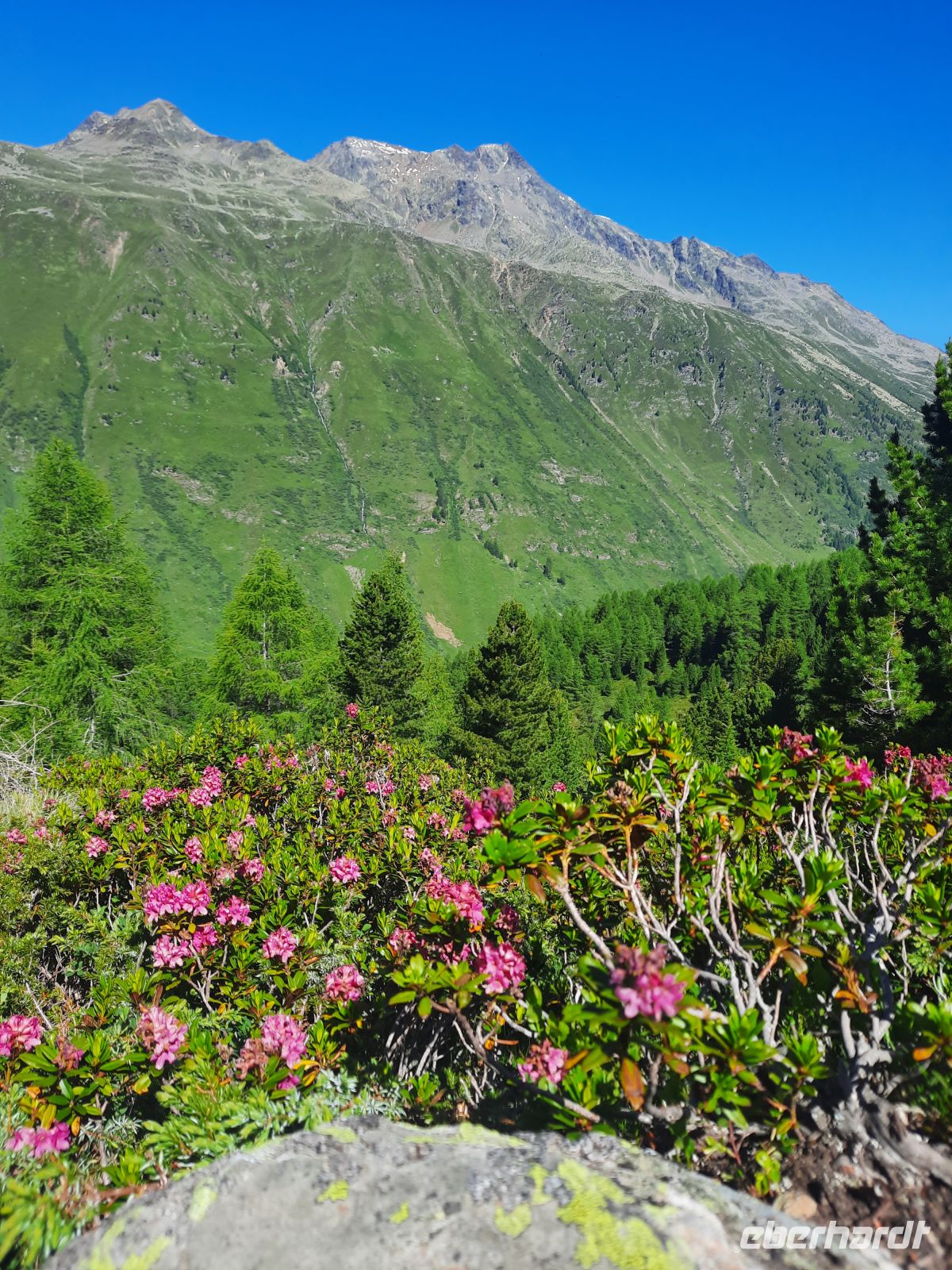 Da an der Kirchenkarbahn Wartungsarbeiten stattfanden, konnten wir nicht bis zur Aussichtsplattform fahren. Wir folgten dem Wanderweg zum Hoteldorf Hochgurgel auf 2.150 Höhenmetern. An Almhütten und Wasserläufen vorbei, stiegen wir durch das Königjoch. Bei strahlend, blauem Himmel erreichten wir wieder die Baumgrenze und folgten dem Pfand nach Hochgurgl. Lärchen, Fichten, Alpenrose, Küchenschelle, Steinbrechgewächse etc. bildeten ein abwechslungsreiches Alpenpanorama. Der Anstieg erfolgte über die Timmelsjoch Straße, die uns zum Linienbus führte.