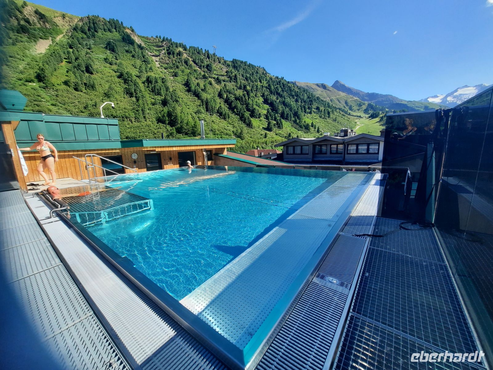 Am Nachmittag erreichten wir das Hotel „Enzian“, unseren Ausgangsort für die nächsten 4 Tage. Herzlich wurden wir vom Johann empfangen. Ein Bad im Pool auf der Dachterrasse es Hotels war ein perfekter Ausgleich zu der langen Busfahrt. Ein 360 Grad Rundblick auf die Ötztaler Alpen zauberte jeden von uns ein Lächeln ins Gesicht. So einen fantastischen Pool hatten wir nicht erwartet. Einfach genial für Körper – Geist- und Seele.