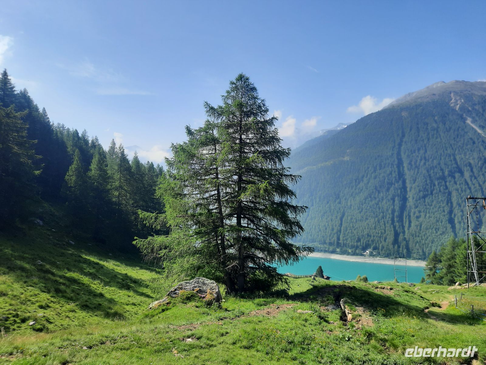 Im Stausee versanken acht Höfe des Dorfes Vernagt. Die Spitze des Kirchturms ragt bei Niedrigwasser aus dem See. Der Stausee erstand erst in den 1950 /1960iger Jahren