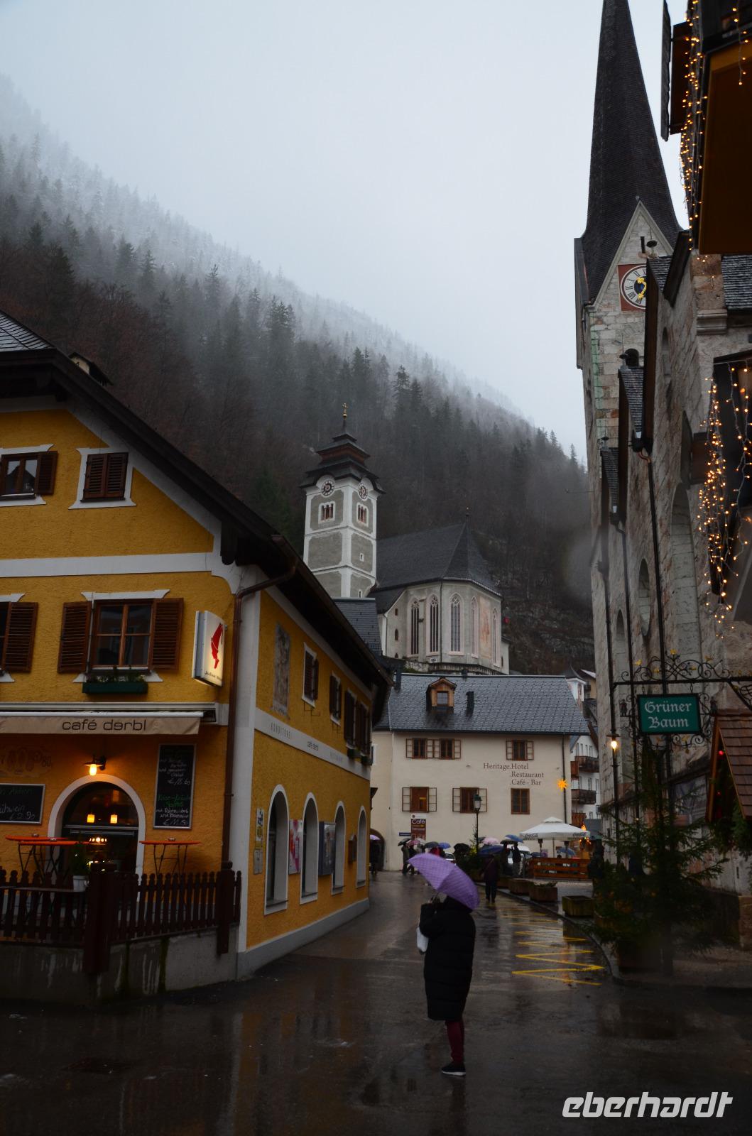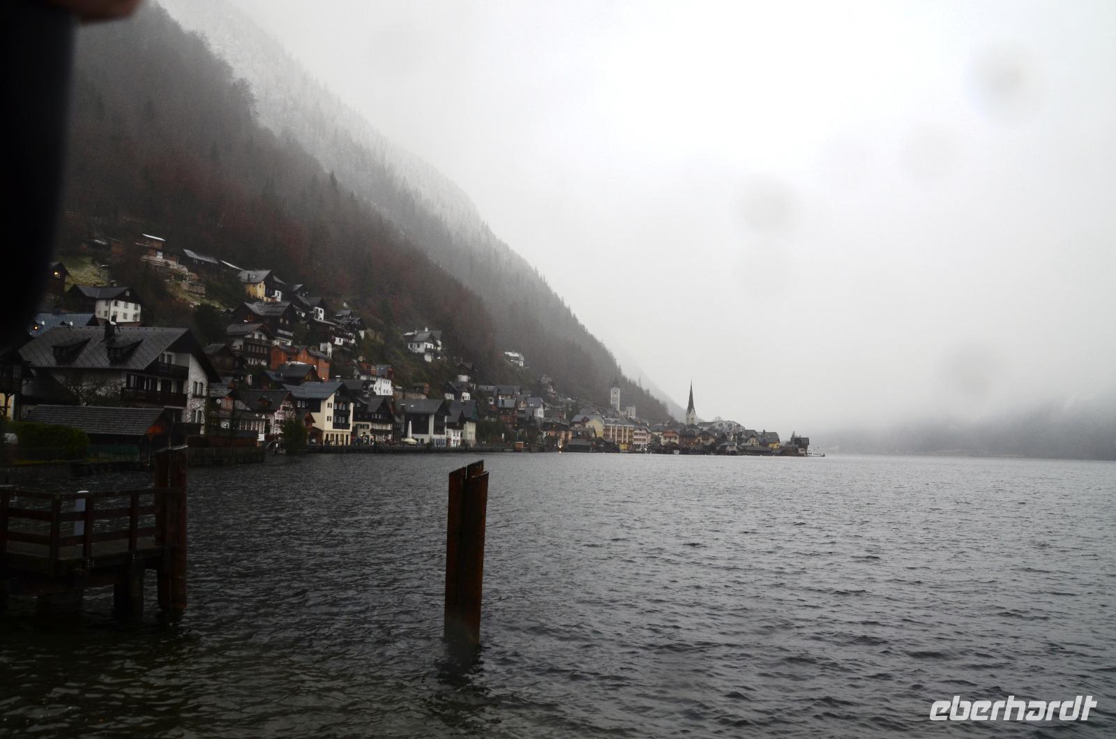 Von Abtenau fahren wir im Flockenwirbel zum Pass Gschütt und weiter über Gosau hinunter ins Trauntal an den Hallstädter See, nach Hallstatt. Dabei geht es durch die Tourismusregion des Westlichen Dachsteins zur UNESCO-Welterberegion um den Hallstätter See. Leider regnet es hier in diesen niedrigeren Gebirgslagen ebenso Kräftig, wie es weiter oben schneit.