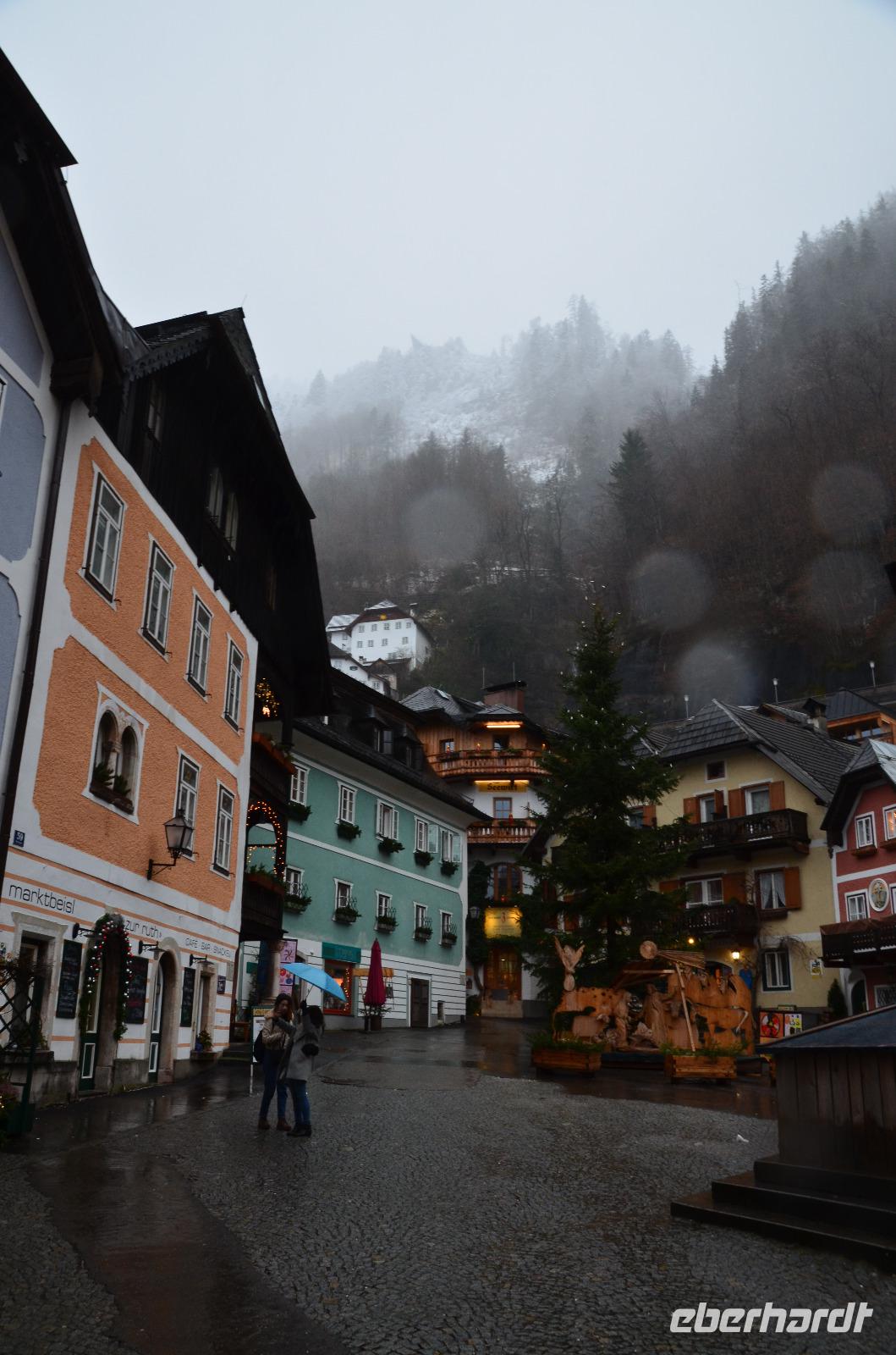 Wir unternehmen trotzdem einen gemeinsamen Spaziergang in die Ortsmitte von Hallstadt, hin zum Marktplatz und besichtigten so die förmlich am Hallstätter Salzberg klebenden Häuser.