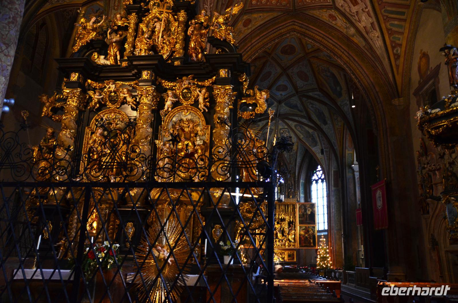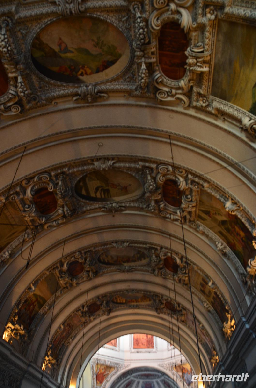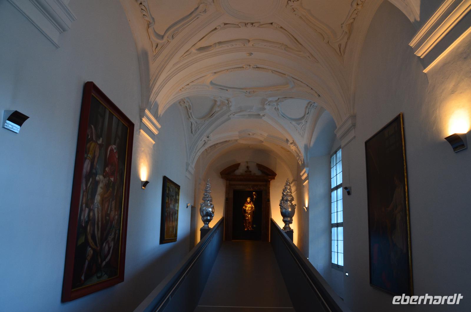 Am Eingang der Neuen Residenz treffen wir die beiden Führerinnen. Die teilen uns hier in zwei Gruppen. So beginnt ein interessanter Rundgang durch den Dom mit seiner Schatzkammer, die erzbischöfliche Residenz mit Gemäldegalerie und Prunkräumen sowie die Ausstellungsräume des Franziskanerklosters. Unsere Gruppe zeigt und erklärt Camilla die schönsten und wertvollsten Sehens-würdigkeiten.