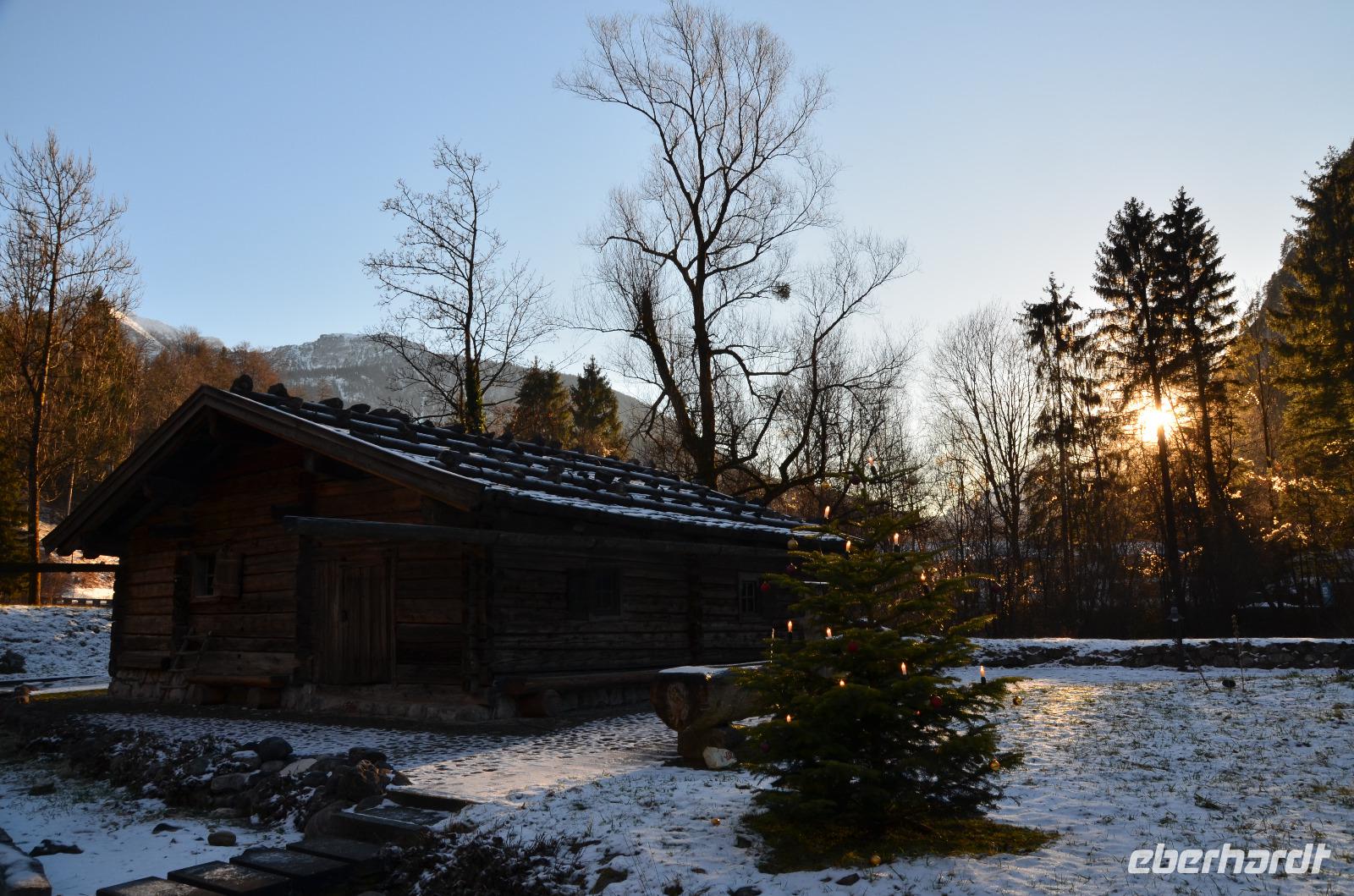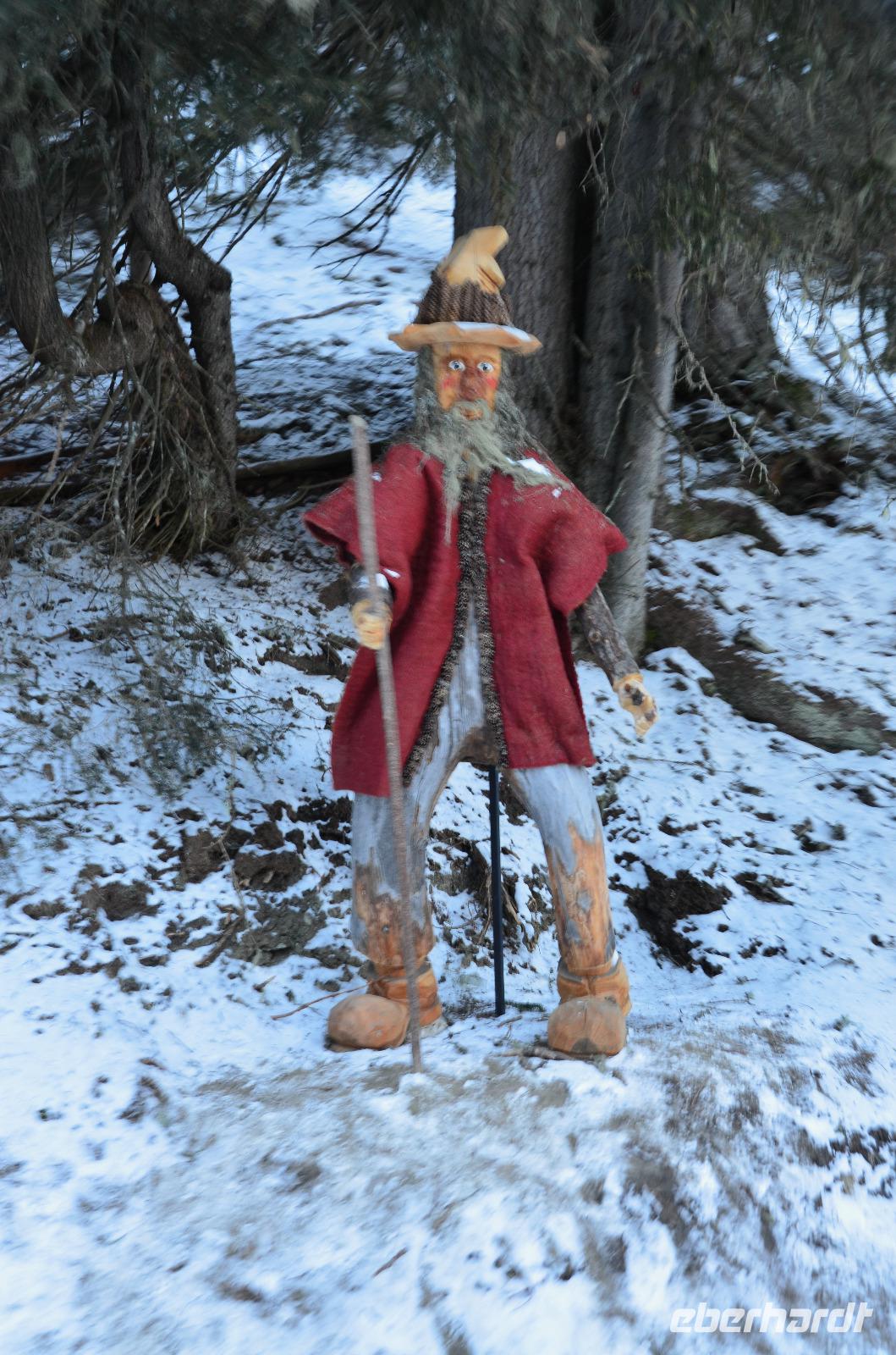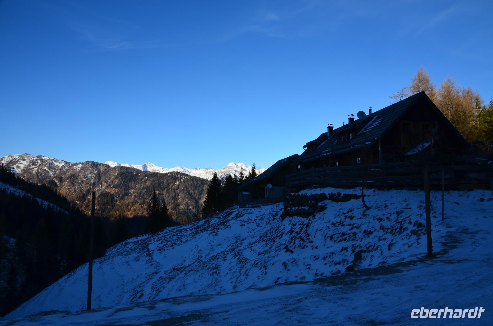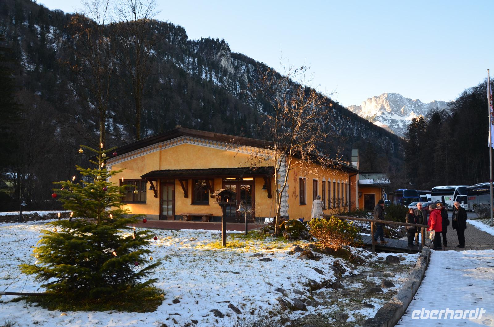 Vier Kutschen erwarten uns hier oben und so können wir sofort umsteigen. Unter dem Geläut der Pferdekutschen startet die Fahrt zur Pritzhütte. Im schönsten Sonnenschein geht es am Berghang entlang und hinüber ins Gönntal, wo die Hütte auf 1828 m Höhe liegt. Neue schöne Laternen säumen den romantischen Weg und so mancher lustige hölzerne Zeitgenosse ebenfalls. Dann nimmt uns die Wärme und Geborgenheit im Innern der Pritzhütte auf und bei Jagatee oder Glühwein als eberhardt-Wow verspeisen wir die lecker hergerichtete, deftige Brettljause auf unseren Tischen. Alle fühlen sich richtig wohl, so vergeht die Zeit schnell und schon ist für die Rückfahrt wieder angespannt.