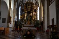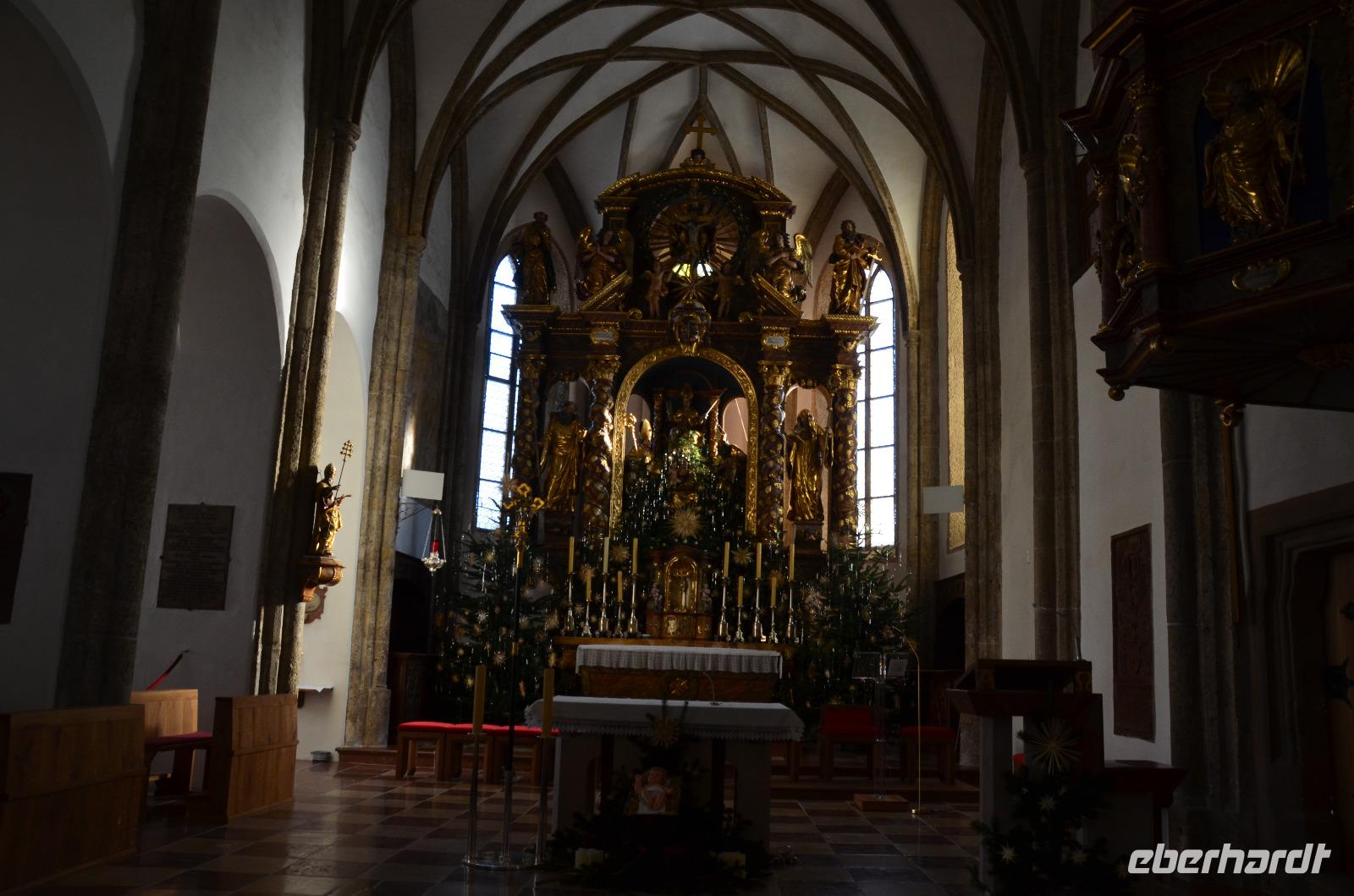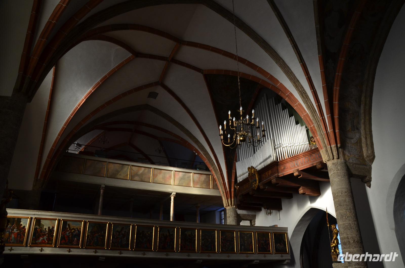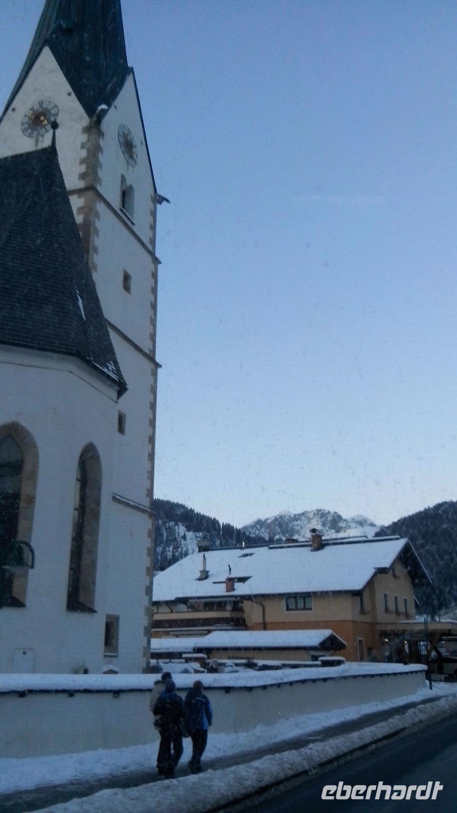 Die Sonne scheint an die Gipfel des Tennengebirges und taucht sie in morgendliches Gold als wir nach dem Frühstück zu einem Spaziergang durch Abtenau aufbrechen. Wir besichtigen die schöne Kirche des Ortes, die neben ihren erhaltenen gotischen Spitzbögen und Säulen auch noch schöne alte Fresken aus dem 16. Jahrhundert bereichern.