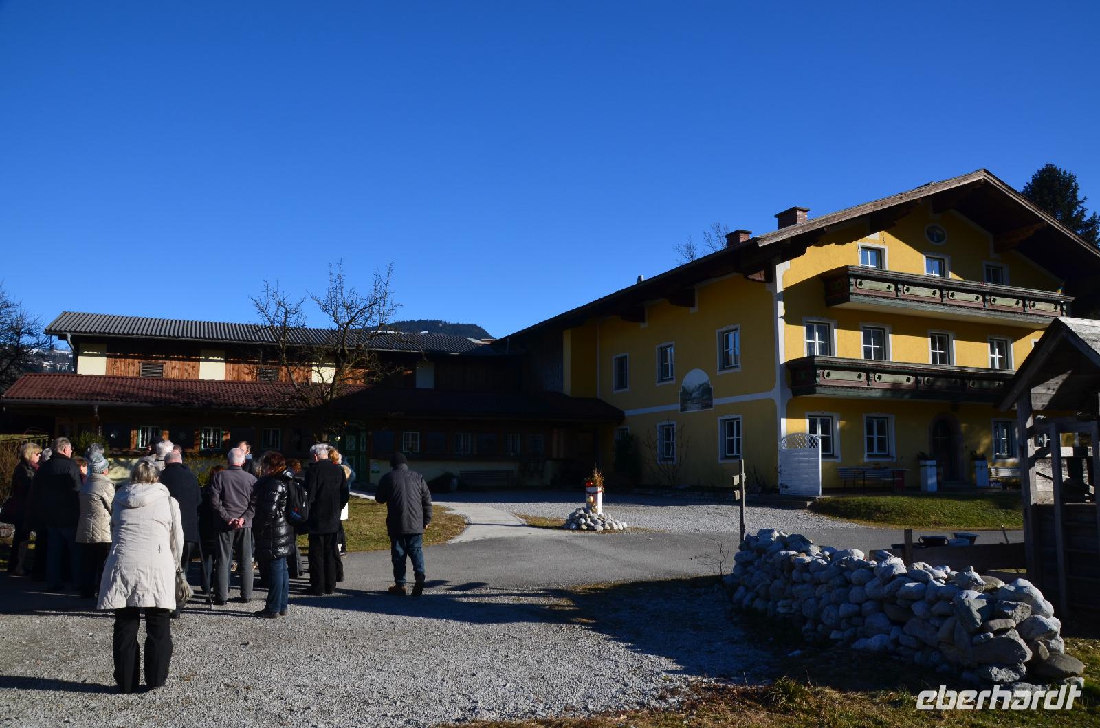Danach klettern wir in unseren gut geheizten Reisebus und fahren hinunter zur Ortschaft Kuchl im Salzachtal, wo der Bauer des Fürstenhofes, Herr Rettenbacher, neben seinem Hof erfolgreich eine Biokäserei betreibt. Von ihm erfahren wir eine Menge über die österreichische Landwirtschaft, die Käseherstellung und weitere Ideen, wie der kleine Betrieb mit dem Bergsalz der Region, Kräutern und Milchprodukten auch in der Kosmetik neue Wege erschließt.