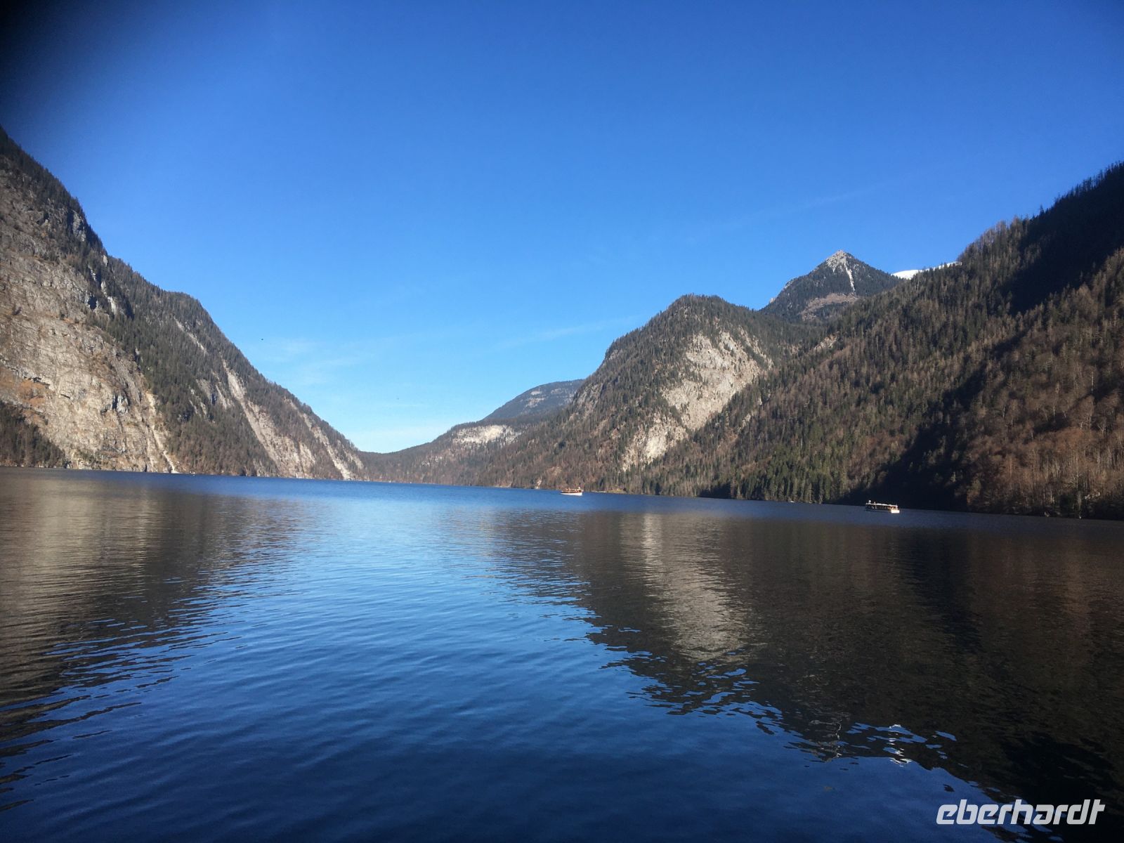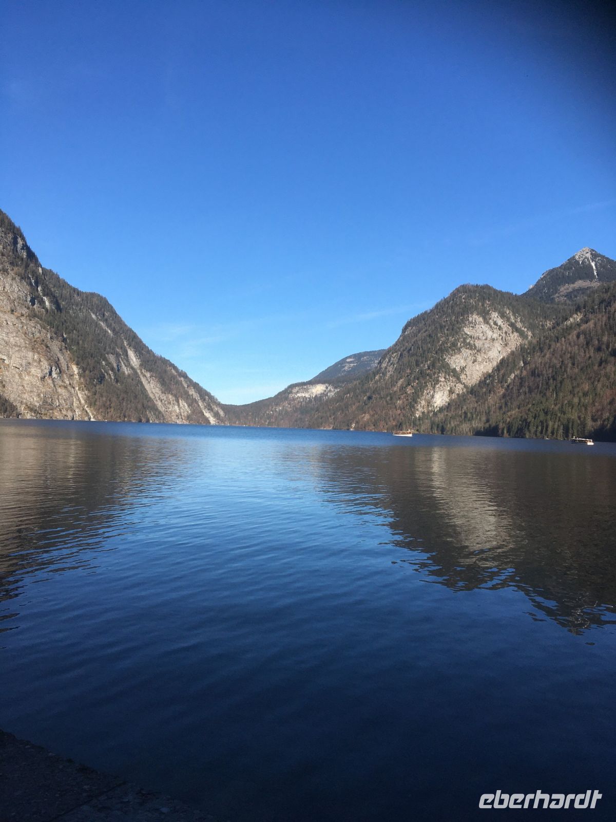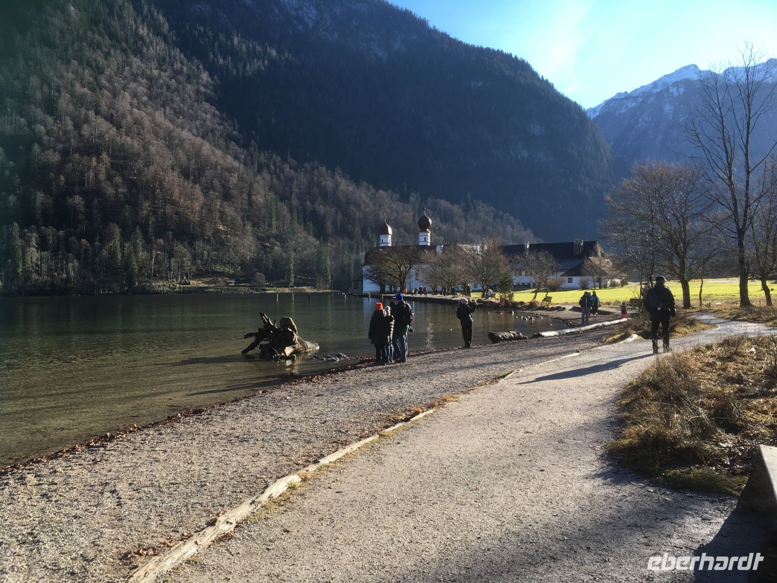 Anschließend fuhren wir zum Königsee. Dabei hatten wir gute Sicht auf König Watzmann, seine Frau und Kinder und hörten die Legende von seiner Entstehung. Die meisten Gäste fuhren mit dem Schiff nach St. Bartholomä hinüber. Auf dem Boot hörten wir eine Musikdarbietung auf der Trompete mit Echo von der Echowand. Bei bestem Sonnenwetter genossen wir den Blick auf die berühmte Watzmann- Ostwand, spazierten am Königsee entlang und speisten in der Gaststätte St. Bartholomä.