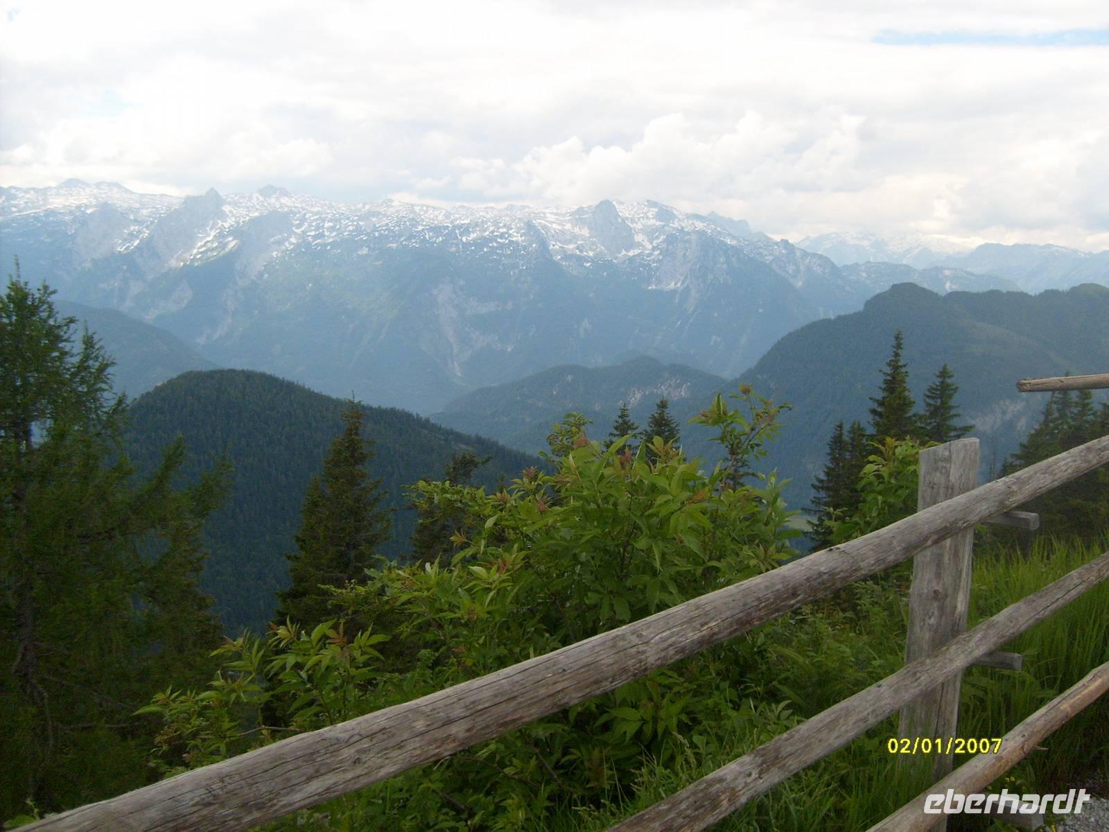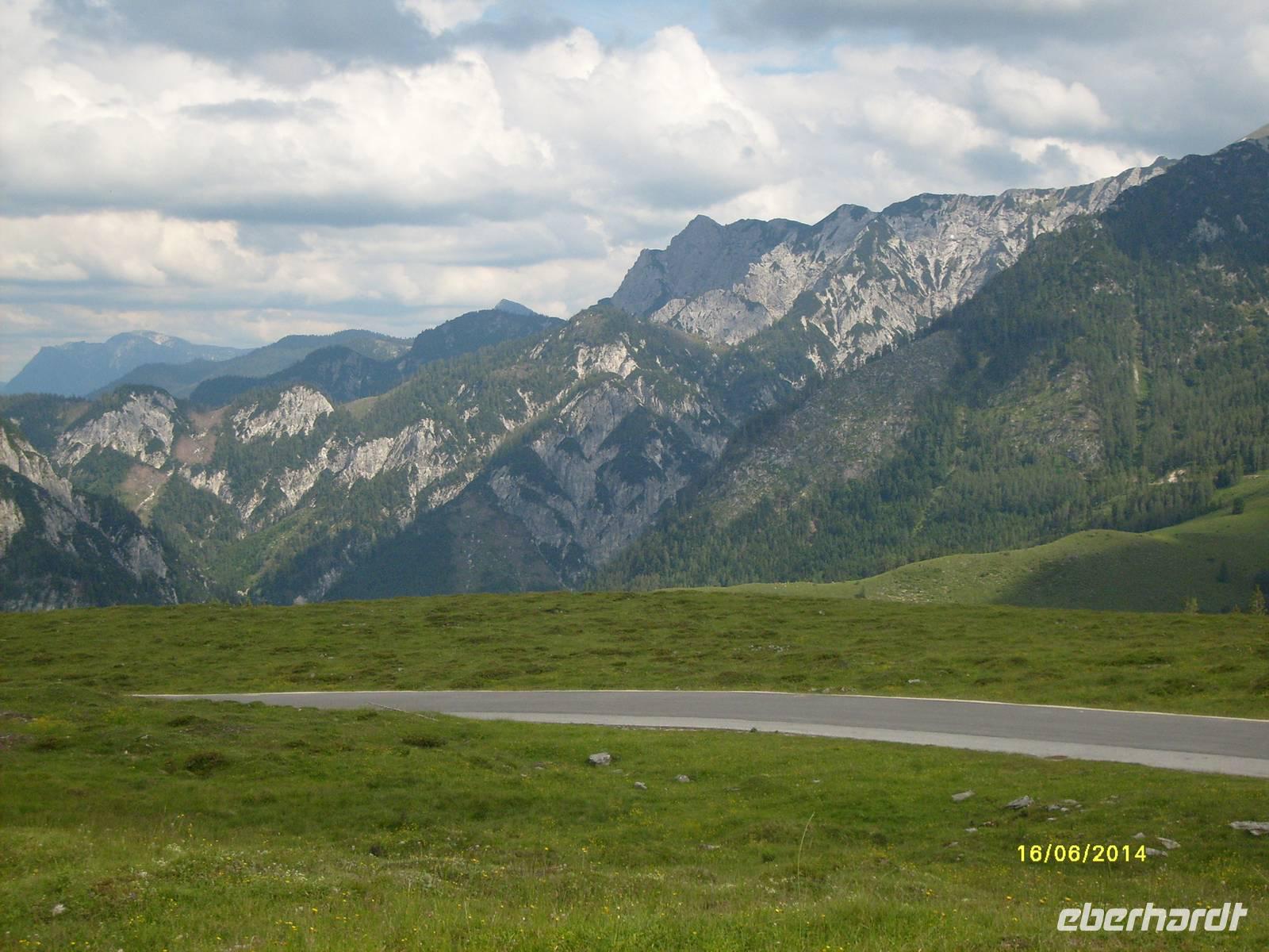 Nach der Mautstelle folgten 6 Kehren, bis zu 12 % Steigung. Jens hat dies super gemeistert, und wir genossen die Ausblicke. An der Aussichtsplattform - Panoramastraße legten wir einen Fotostopp ein. Bei schönstem Wetter gab es tolle Ausblicke zum Dachstein, das Tennengebirge und auf einige Gipfel der Osthorngruppe.