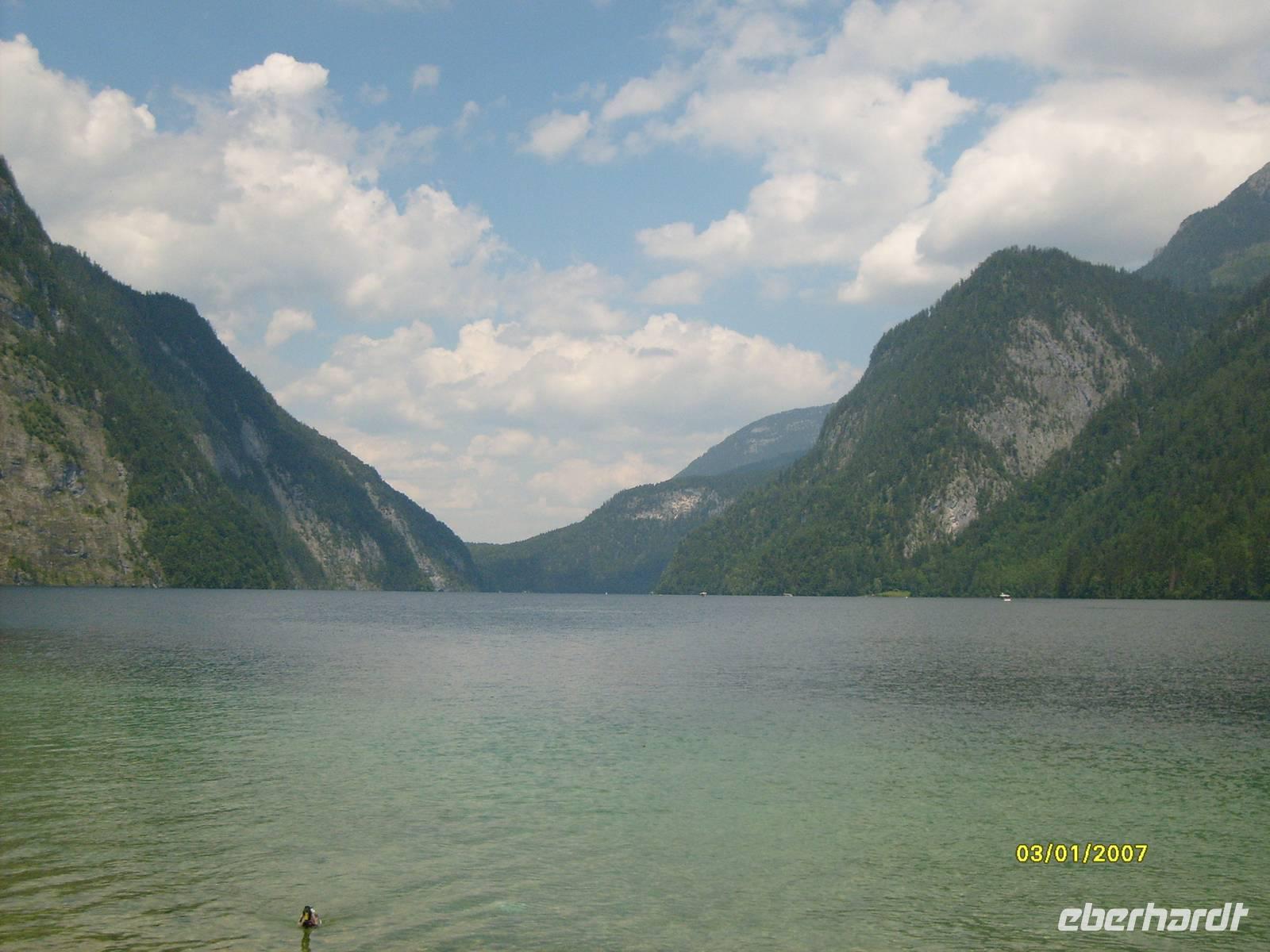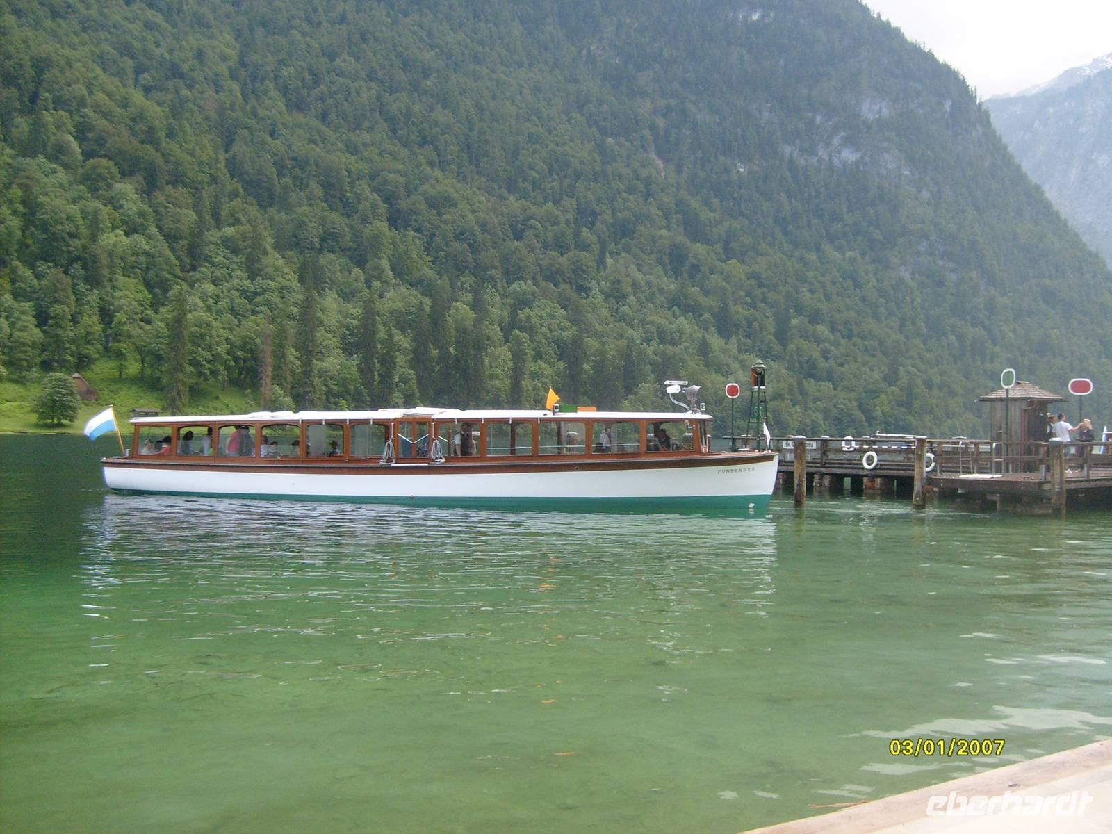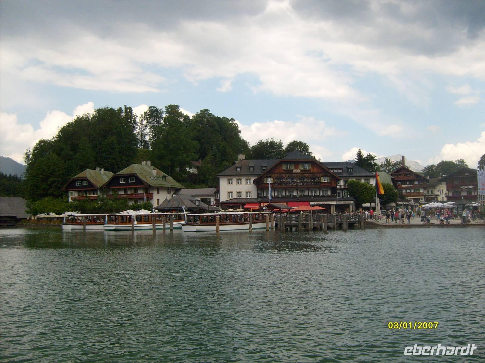 Hier dürfen seit 1909 nur Elektromotorboote fahren. Auf etwa der halben Fahrtstrecke wird den Touristen mittels Flügelhorn vom Bootsführer das beeindruckende Mehrfach-Echo an den steilen Gebirgshängen demonstriert. Leider war das Echo nicht zu hören, da Regen und Wind uns dies vermieste. Kurz nach der Ankunft auf St. Bartholomä hörte der Regen auf, und so konnte jeder für sich dieses Kleinod erkunden.