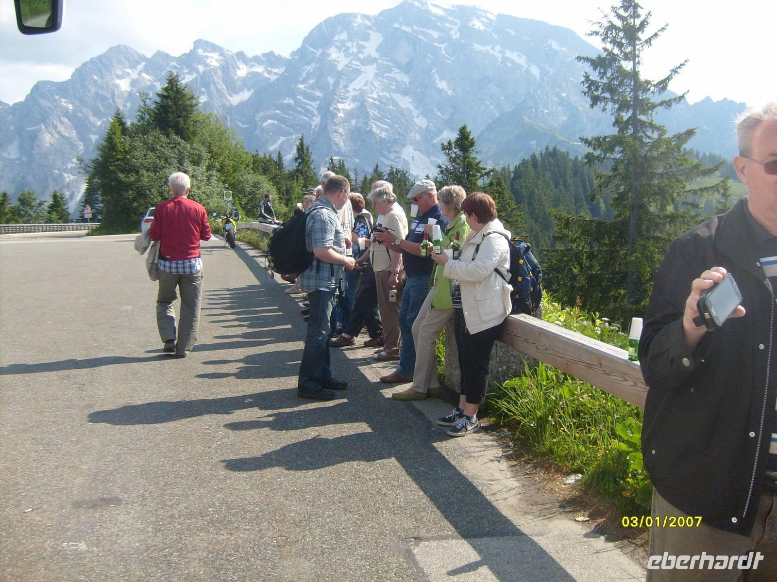 Am Nachmittag fuhren wir auf die Rossfeld - Höhenringstraße, die höchste deutsche Bergstraße Deutschlands. Zu jeder Zeit ist die Fahrt auf der einzigen Privatstraße der Bundesrepublik ein Erlebnis. Von Zahlreichen Kurven und Windungen aus bieten sich Ausblicke auf das ganze Berchtesgadener Land. Bei strahlenden Sonnenschein und klaren Wetter konnten wir vom höchsten Punkt, dem "Hennenköpfl", 1.540 m hoch, die Sicht auf Salzburg und in das Salzachtal genießen. Auch die Gebirge Dachstein, Hagengebirge und der Hohe Göll mit dem Kehlsteinhaus waren fast zum greifen nah.