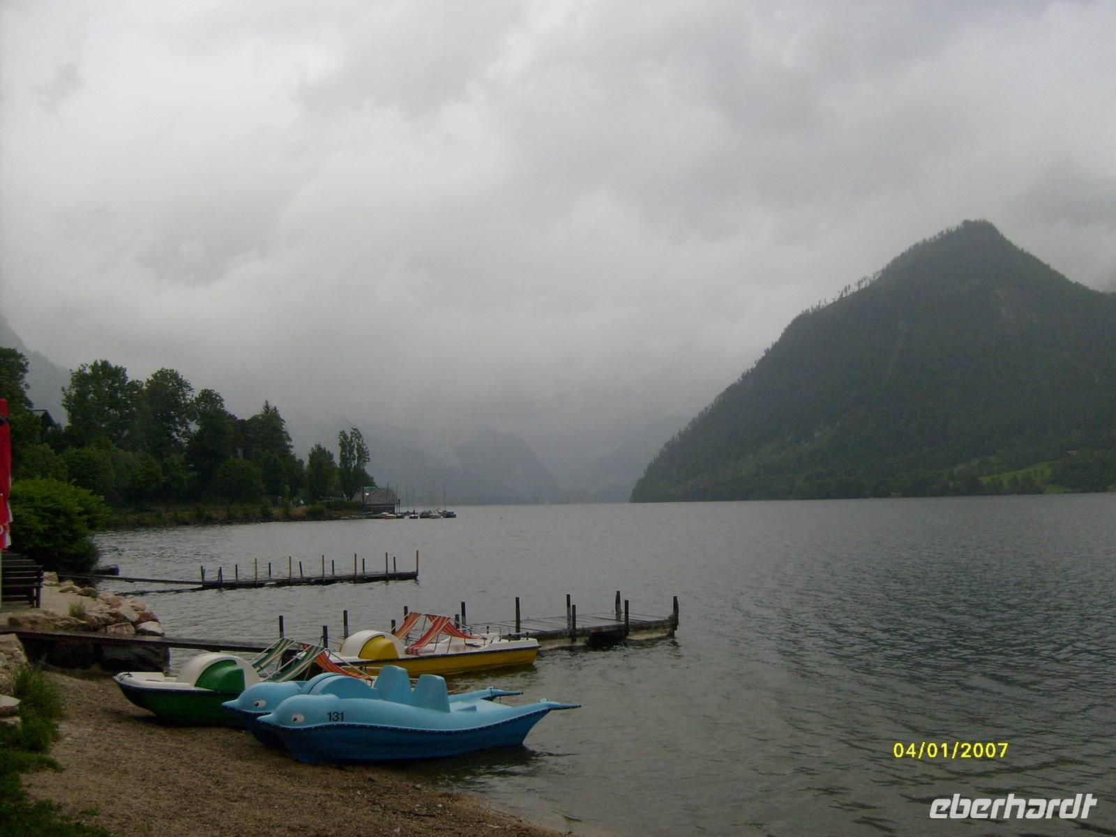 Über Bad Aussee, der geografische Mittelpunkt Österreichs, fuhren wir auf dem Pötschenpaß in Richtung Bad Goisern. Weiter ging es bis Bad Ischl nach Strobl. Von hier aus fuhren wir knapp 10 km entlang des Wolfgangsee. Obwohl es in Strömen regnete, waren die Segler auf dem See unterwegs, ganz schön mutig.
