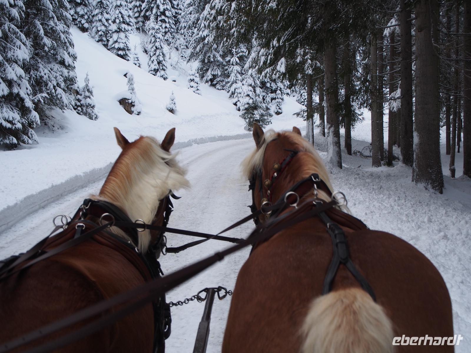 Am ersten Weihnachtsfeiertag sollen wir endlich unsere weiße Weihnacht bekommen. Über die Salzburger Dolomitenstraße zwischen Gosaukamm und Tennengebirge geht es in die Steiermark - das „Grüne Herz" von Österreich. Unser erstes Ziel heißt heute Steirischer Bodensee - sehr viel kleiner als sein großer Bruder im Dreiländereck Deutschland-Österreich-Schweiz, aber sehr idyllisch gelegen. Wir verlassen die Bundesstraße bei Schladming und der Bus bahnt sich langsam den Weg bergan durch den Schnee. Vom Parkplatz aus ist es noch ein kleiner Spaziergang durch das verschneite Seewigtal bis wir das Restaurant Forellenhof erreichen. Wer möchte, kann in einer halben Stunde um den zugefrorenen See spazieren, allerdings erfordert das ein wenig Abenteurergeist, denn die Gehwege sind noch nicht überall geräumt. Danach kann man sich mit einer heißen Tasse Kaffee oder einer Suppe wieder aufwärmen. Am frühen Nachmittag geht unsere Fahrt weiter über den bekannten Wintersportort Ramsau in’s Dachsteingebiet. Wir fahren nach Filzmoos wo wir von 460 PS auf 2 PS umsteigen und eine winterliche Schlittenfahrt zur Hofalm unternehmen. Spätestens jetzt verspüren alle die langersehnte Winteridylle. Auf der Alm erwartet uns im urigen Ambiente ein kräftiger Jagatee und wer sich noch mal in die Kälte wagen möchte, kann nach Einbruch der Dämmerung einen Spaziergang entlang des beleuchteten Rundwegs um die beiden Almen herum unternehmen - ein wirklich schönes Erlebnis, wenngleich die Wege auch sehr glatt sind und man im Dunkeln sehr vorsichtig gehen muss.