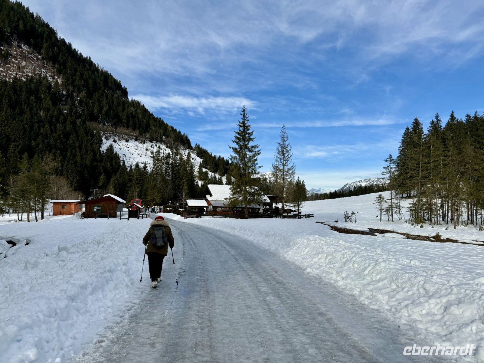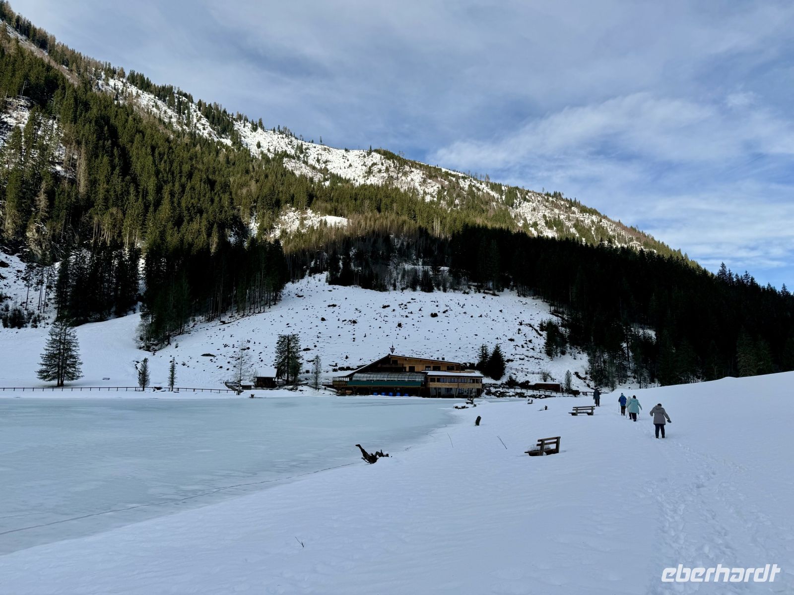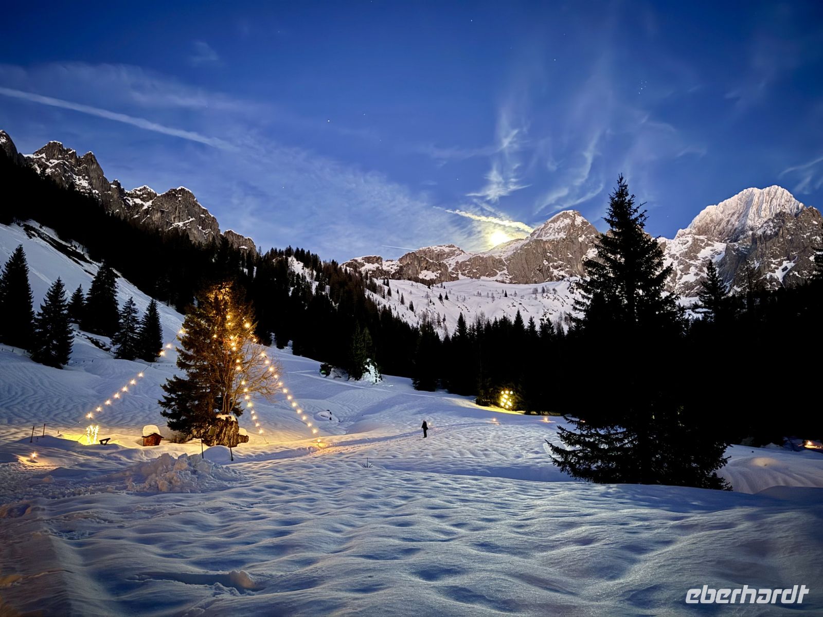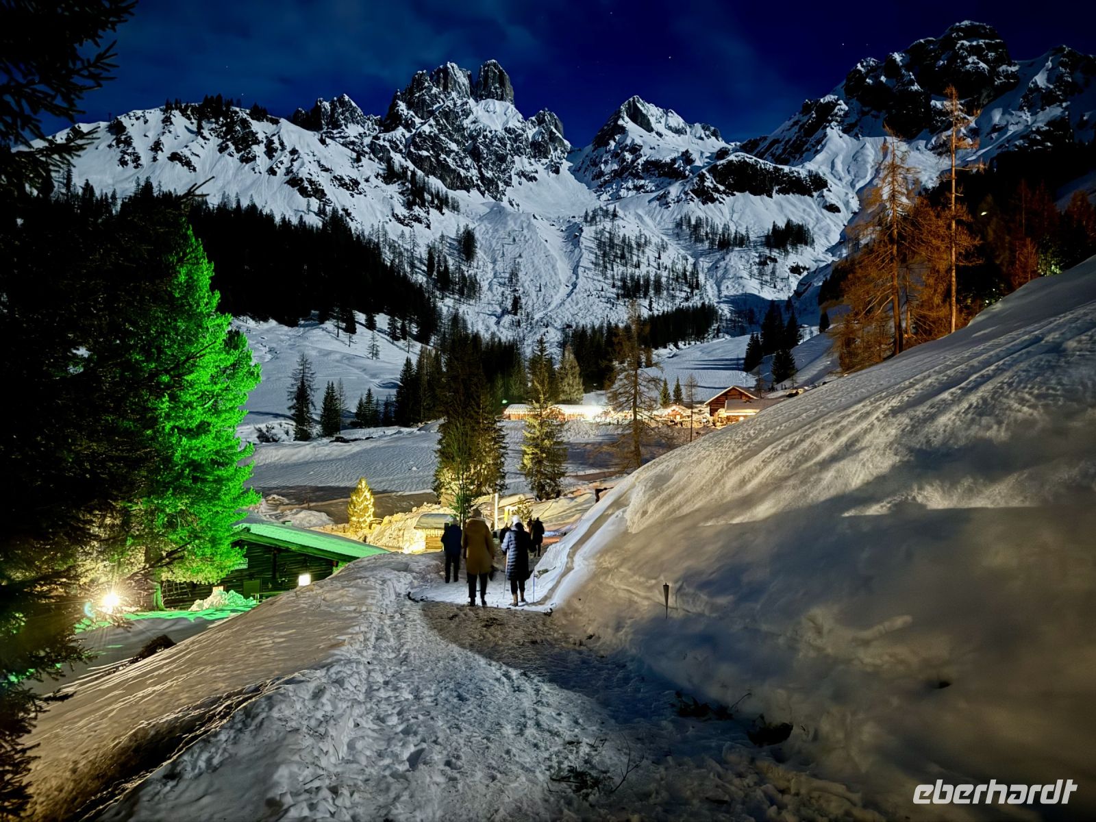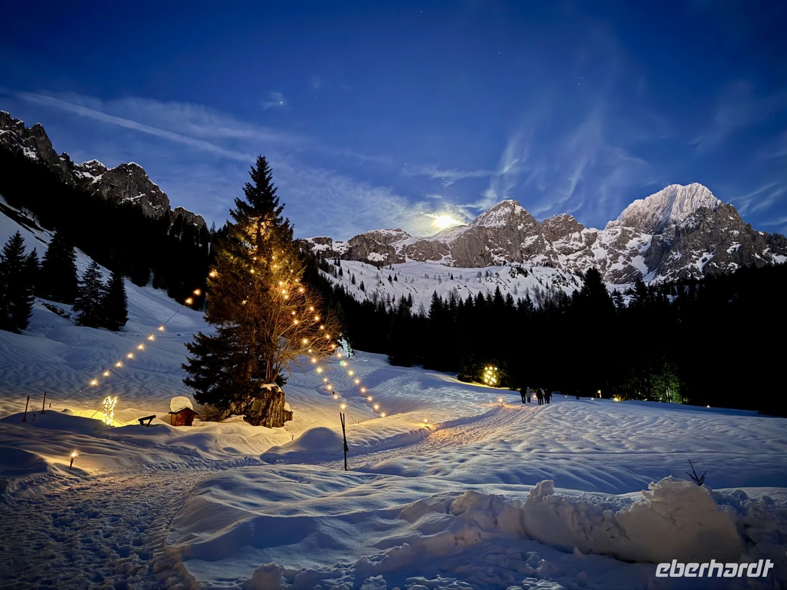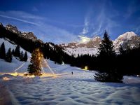 Pünktlich zum ersten Weihnachtsfeiertag haben sich die Regenwolken nun vollends verzogen. So wird bereits die Fahrt entlang der Salzburger Dolomitenstraße ins Ennstal zu einem wunderbaren Erlebnis. Zwischen Dachsteingebirge und Niederen Tauern fahren wir bis kurz hinter Schladming und biegen dort zum Seewigtal ab. Als Roy den Bus behutsam die Serpentinen hinauf zum Parkplatz steuert, genießen wir die Aussicht auf Berge und Täler. Der Feldweg zum Forellenhof am Steirischen Bodensee ist ziemlich vereist und glatt. Zum Glück fährt gerade ein Traktor den Weg entlang und streut Kies. Trotzdem gehen wir langsam und haken uns notfalls unter, damit niemand ausrutscht. Wir erreichen den Gasthof und können zu einem zünftigen Mittagessen einkehren. Natürlich gibt es auch Forelle – und Käsespätzle. Doch bevor wir uns den Bauch vollschlagen, wartet noch ein fakultativer Spaziergang um den Bodensee auf die ganz Mutigen. Nach den ersten Metern läuft es sich auf dem Schnee sogar angenehmer als vorher auf dem Feldweg und wir tauchen in eine herrlich verschneite Winterkulisse ein. Fehlt eigentlich nur noch Väterchen Frost. Nach dem Spaziergang genießen wir dann ganz entspannt im Forellenhof den Blick nach draußen und das Essen. Ebenso entspannt geht es am Nachmittag weiter: Wir fahren nur ein kurzes Stück über Ramsau nach Filzmoos und sind nun ganz nahe am Dachsteinmassiv. Hier erfolgt ein Umstieg vom roten Bus in vier rote Pferdekutschen/-schlitten. In dicke Decken eingehüllt lassen wir uns durch den verschneiten Winterwald zur Unterhof Alm entführen. Vor uns ragt die Große Bischofsmütze auf und dient als Orientierung. Bei Jagertee und Apfel- bzw. Topfenstrudel wärmen wir uns in der urigen riesigen Almhütte auf und setzen das Schlemmerprogramm fort. Doch wir sind nicht nur zum Kaffeetrinken hier! Auf der Unterhof Alm wartet anschließend ein ganz besonderer Programmpunkt auf uns: der Besuch der „Weihnachtsidylle“. Während die Sonne nun langsam untergeht, erstrahlt der Wald, vom hellen Mond, knisternden Fackeln und prächtigen Lichtinstallationen beschienen, in besinnlichem, weihnachtlichem Glanz. Die Stimmung ist magisch, unsere Herzen quellen über vor Glück und Freude. Ein zauberhafter Rundgang, den wir niemals vergessen werden. Durch die Dunkelheit des Waldes werden wir hernach mit unseren Kutschen zurück zum Bus gebracht. Roy fährt uns wieder nach Abtenau, wo wir uns beim Abendessen angeregt über unsere heutigen tollen Erlebnisse austauschen.