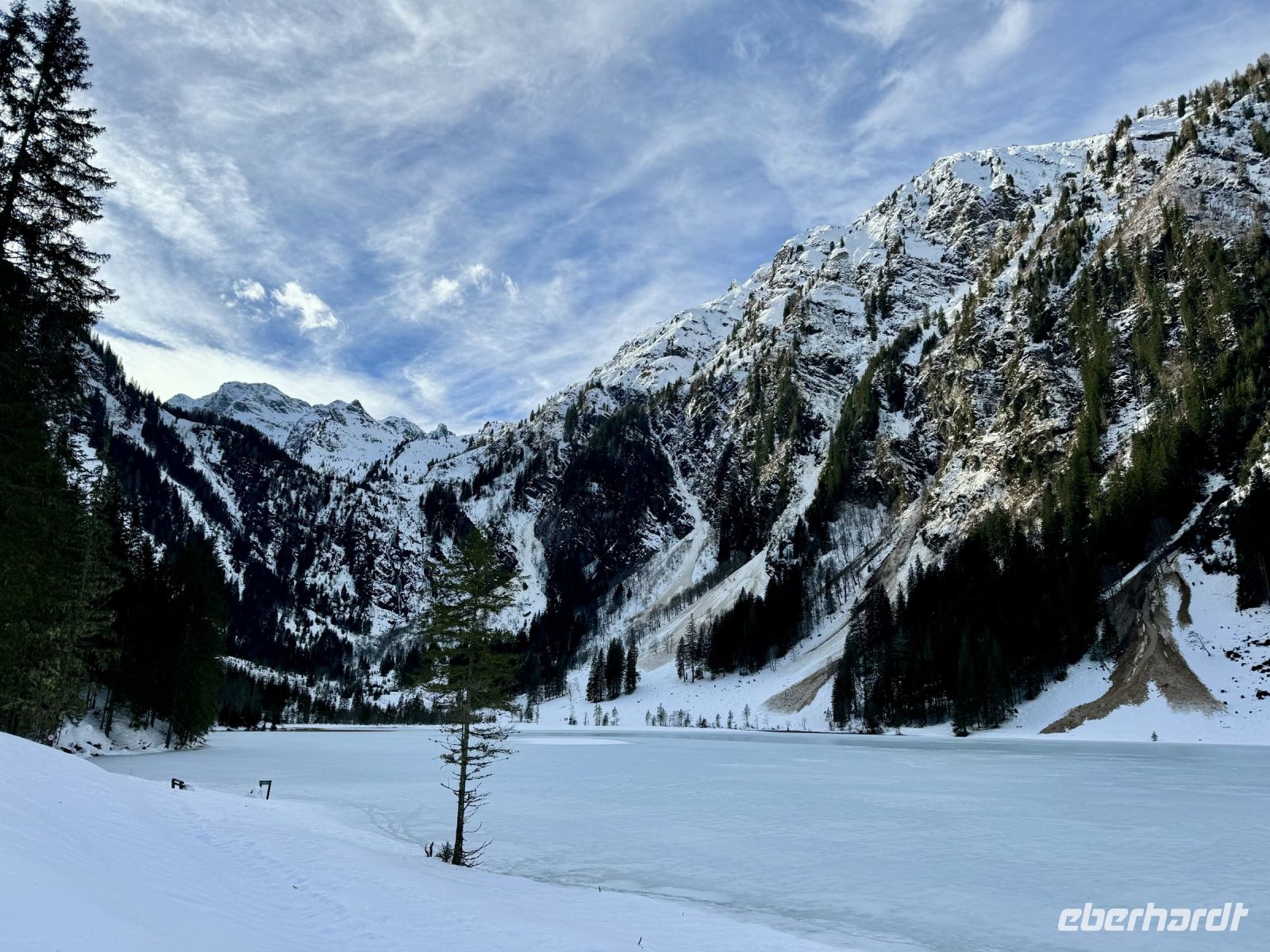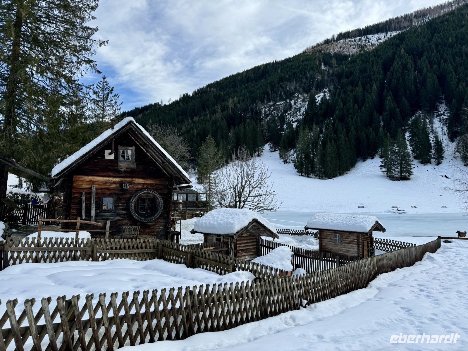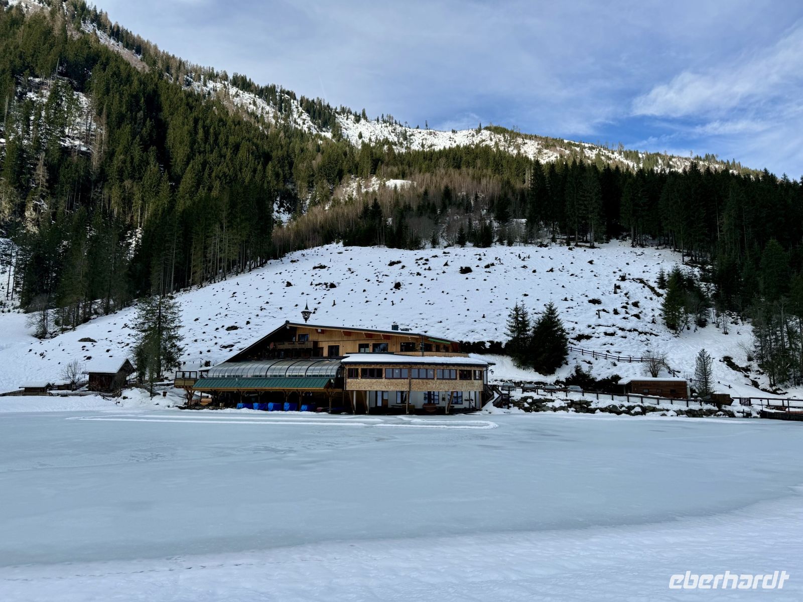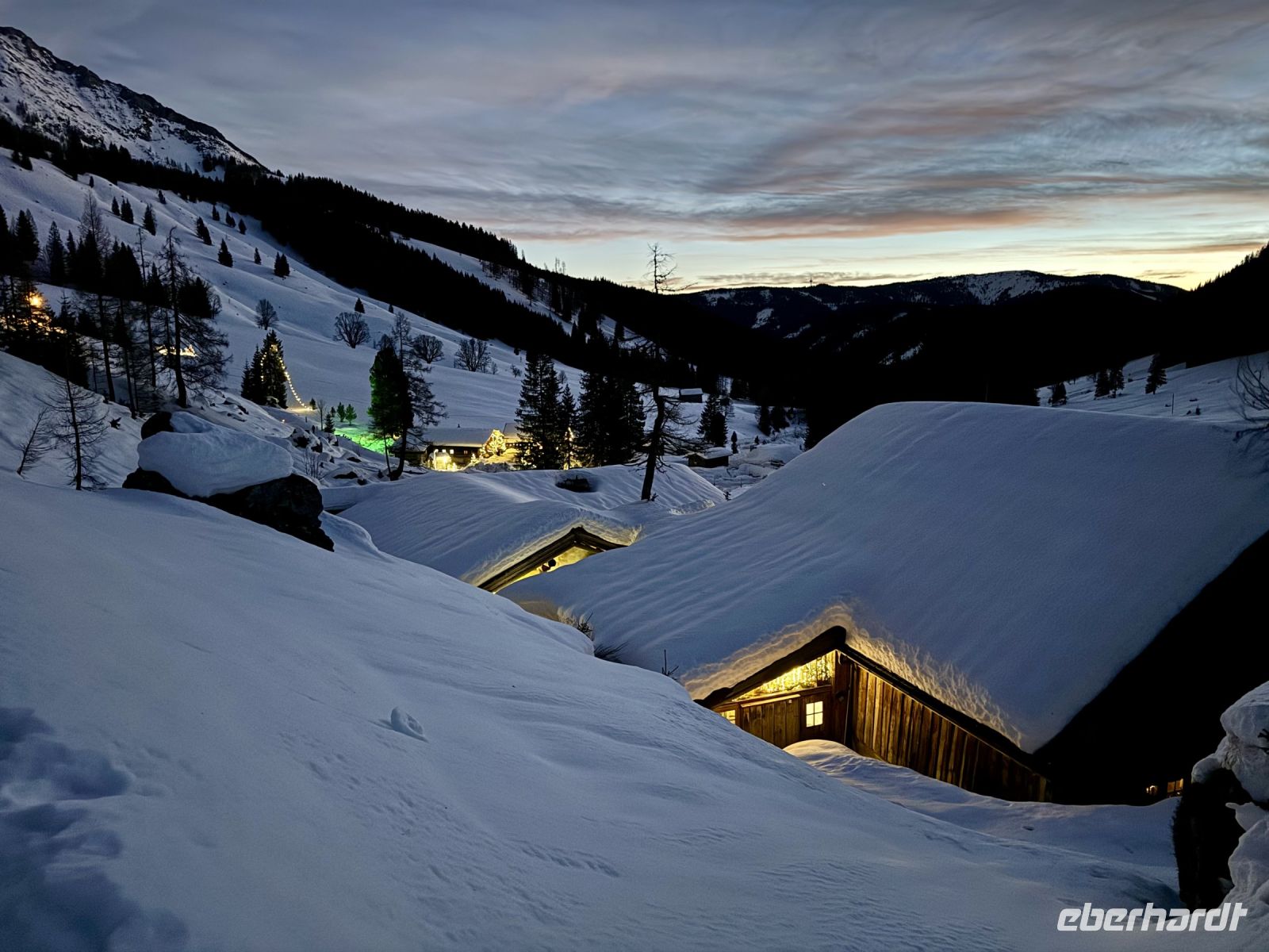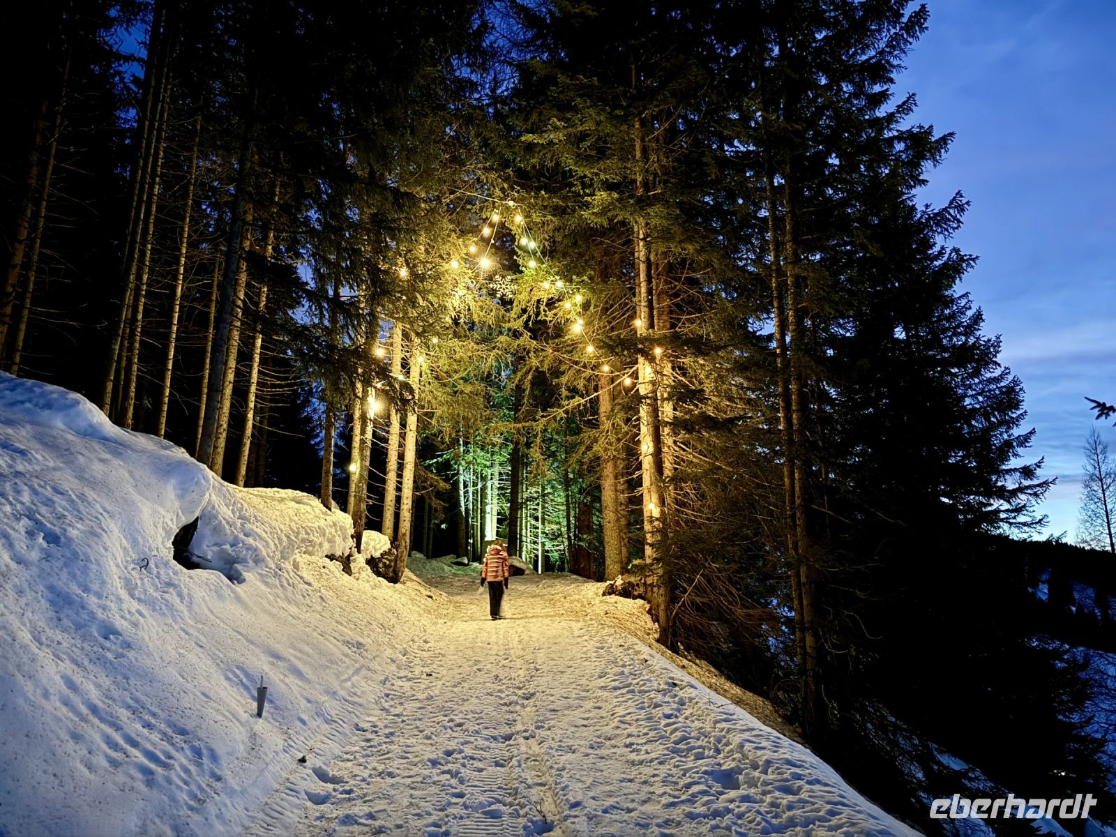 Pünktlich zum ersten Weihnachtsfeiertag haben sich die Regenwolken nun vollends verzogen. So wird bereits die Fahrt entlang der Salzburger Dolomitenstraße ins Ennstal zu einem wunderbaren Erlebnis. Zwischen Dachsteingebirge und Niederen Tauern fahren wir bis kurz hinter Schladming und biegen dort zum Seewigtal ab. Als Roy den Bus behutsam die Serpentinen hinauf zum Parkplatz steuert, genießen wir die Aussicht auf Berge und Täler. Der Feldweg zum Forellenhof am Steirischen Bodensee ist ziemlich vereist und glatt. Zum Glück fährt gerade ein Traktor den Weg entlang und streut Kies. Trotzdem gehen wir langsam und haken uns notfalls unter, damit niemand ausrutscht. Wir erreichen den Gasthof und können zu einem zünftigen Mittagessen einkehren. Natürlich gibt es auch Forelle – und Käsespätzle. Doch bevor wir uns den Bauch vollschlagen, wartet noch ein fakultativer Spaziergang um den Bodensee auf die ganz Mutigen. Nach den ersten Metern läuft es sich auf dem Schnee sogar angenehmer als vorher auf dem Feldweg und wir tauchen in eine herrlich verschneite Winterkulisse ein. Fehlt eigentlich nur noch Väterchen Frost. Nach dem Spaziergang genießen wir dann ganz entspannt im Forellenhof den Blick nach draußen und das Essen. Ebenso entspannt geht es am Nachmittag weiter: Wir fahren nur ein kurzes Stück über Ramsau nach Filzmoos und sind nun ganz nahe am Dachsteinmassiv. Hier erfolgt ein Umstieg vom roten Bus in vier rote Pferdekutschen/-schlitten. In dicke Decken eingehüllt lassen wir uns durch den verschneiten Winterwald zur Unterhof Alm entführen. Vor uns ragt die Große Bischofsmütze auf und dient als Orientierung. Bei Jagertee und Apfel- bzw. Topfenstrudel wärmen wir uns in der urigen riesigen Almhütte auf und setzen das Schlemmerprogramm fort. Doch wir sind nicht nur zum Kaffeetrinken hier! Auf der Unterhof Alm wartet anschließend ein ganz besonderer Programmpunkt auf uns: der Besuch der „Weihnachtsidylle“. Während die Sonne nun langsam untergeht, erstrahlt der Wald, vom hellen Mond, knisternden Fackeln und prächtigen Lichtinstallationen beschienen, in besinnlichem, weihnachtlichem Glanz. Die Stimmung ist magisch, unsere Herzen quellen über vor Glück und Freude. Ein zauberhafter Rundgang, den wir niemals vergessen werden. Durch die Dunkelheit des Waldes werden wir hernach mit unseren Kutschen zurück zum Bus gebracht. Roy fährt uns wieder nach Abtenau, wo wir uns beim Abendessen angeregt über unsere heutigen tollen Erlebnisse austauschen.