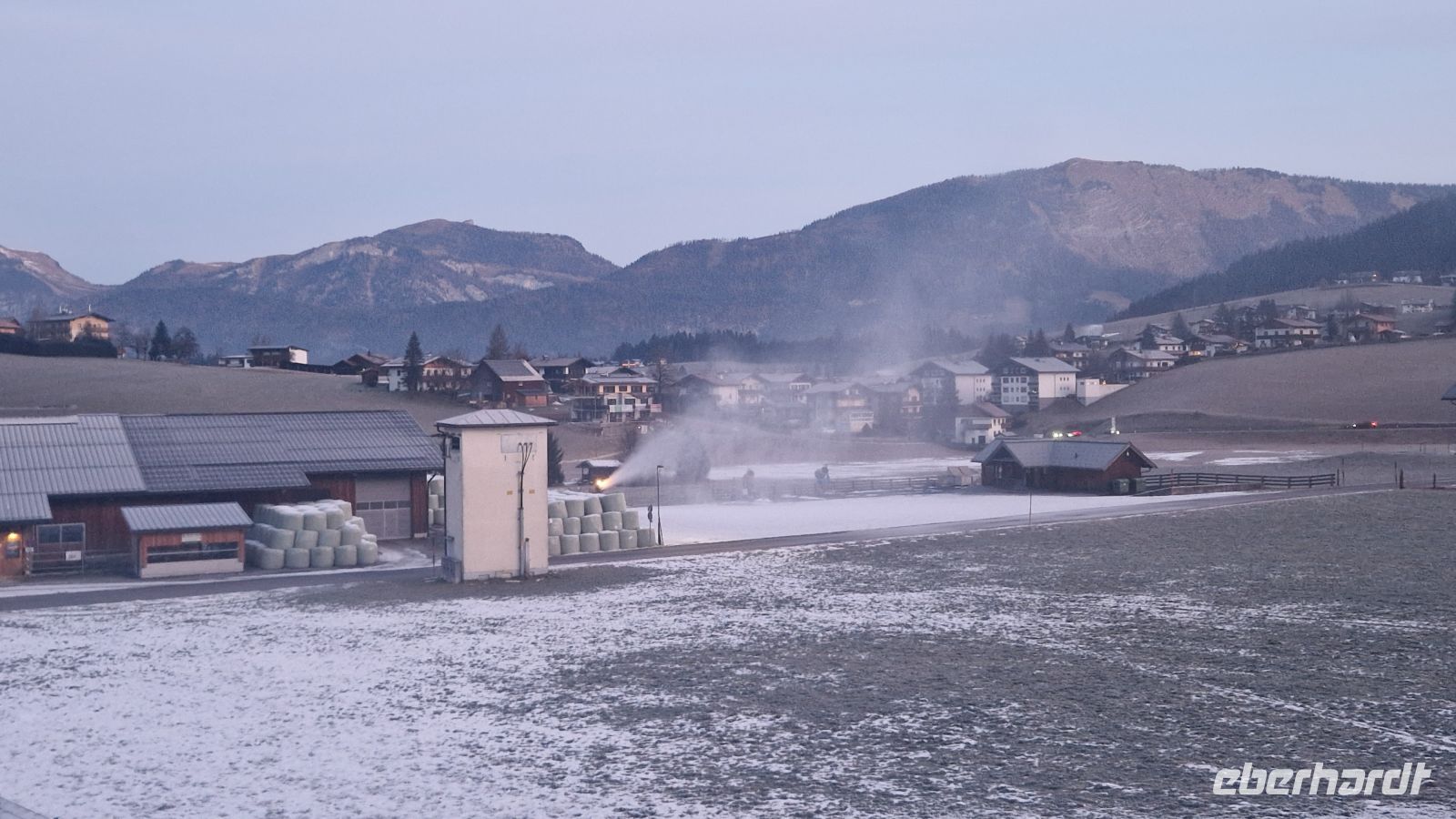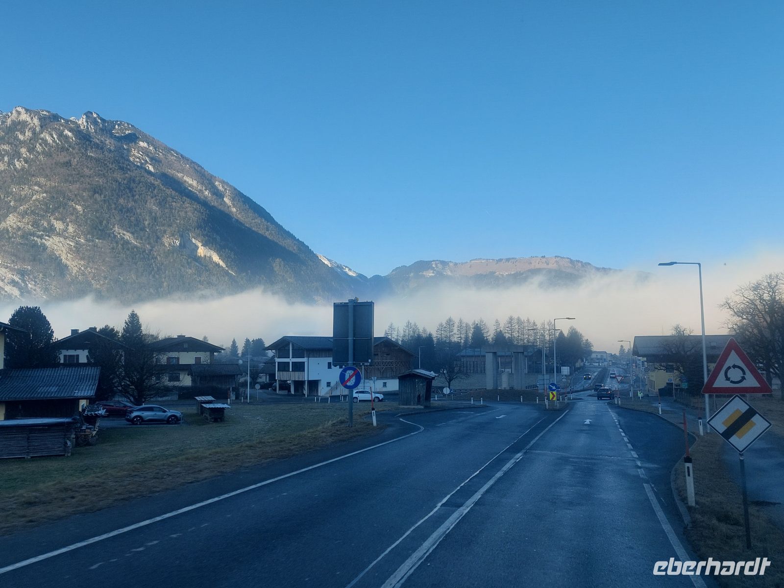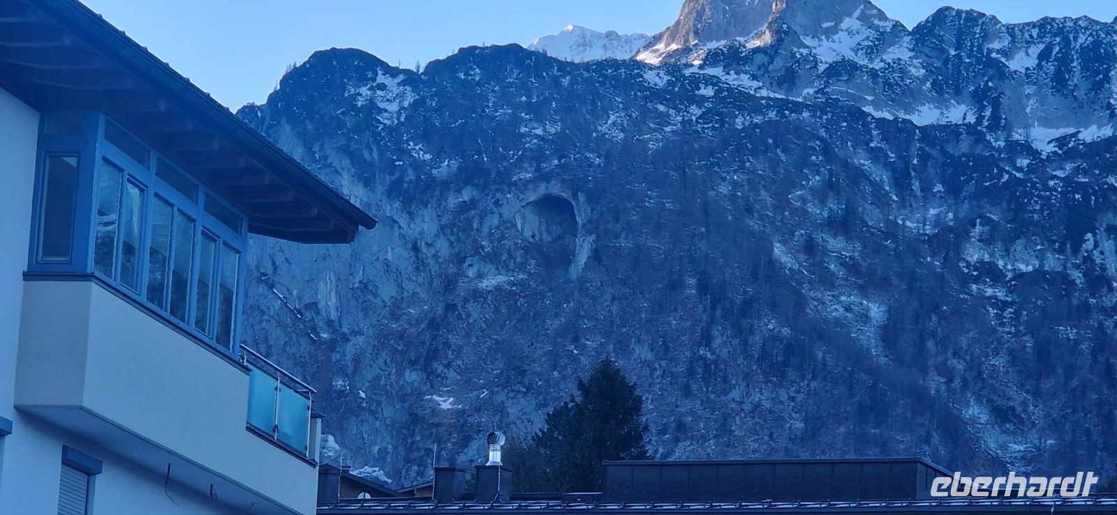 Wir starteten wieder um 09:00 Uhr, hielten aber 5 Minuten später schon wieder an. Wir wohnten nun schon ein paar Tage im Abtenau am Tennengebirge, ohne jedoch jemals im Ort gewesen zu sein. Das wollten wir jetzt ändern. André parkte den Bus hinter dem Friedhof. Wir liefen über diesen ins Ortszentrum und zur Pfarrkirche, mussten dabei aber extrem aufpassen, denn es war sehr glatt. Die Kirche war offen. und sehr weihnachtlich geschmückt. In der linken Ecke des Hauptschiffes war eine wunderschöne, geschnitzte Nachbildung von Bethlehem, inkl. Krippe, aufgestellt. Auf dem Rückweg zum Bus entdeckten wir, oben im Tennengebirge, ein riesiges Felsentor.