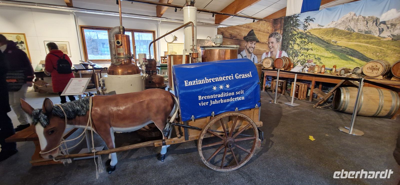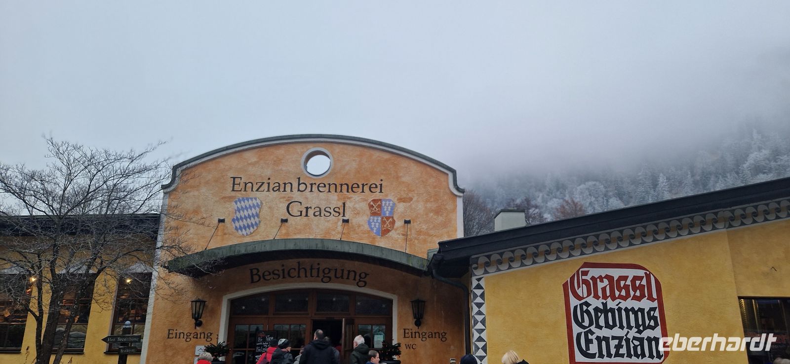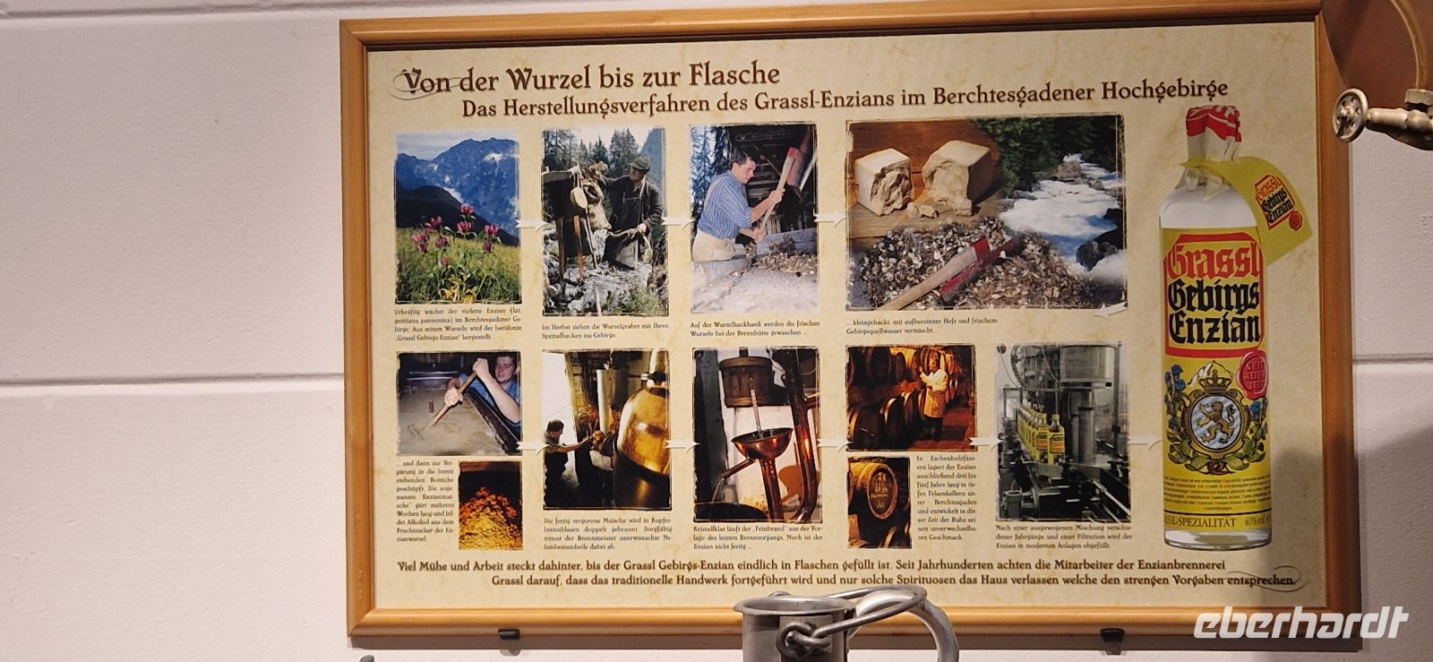 Unser Fahrer André hatte schon für uns den Bus warmgefahren. Wir starteten gegen 09:00 Uhr Richtung Berchtesgaden. Da wir noch Zeit hatten, machten wir einen außerplanmäßigen Halt bei der Enzianmanufaktur Grassl. Durch eine Mitarbeiterin wurden wir freundlich gleich im Bus begrüßt und wir konnten einen Rundgang durch die Ausstellung unternehmen. Hier wurde sehr anschaulich gezeigt, wie die Enzianwurzeln in der oberen Bergwelt entdeckt und ausgegraben werden, bevor sie unten im Tal weiterverarbeitet werden. Zum Abschluss wurden uns, am frühen Vormittag, 6 Sorten Enzianschnaps zur Verkostung angeboten. Einige aus der Gruppe entschlossen sich noch schnell, hier ein Weihnachtsgeschenk zu kaufen.